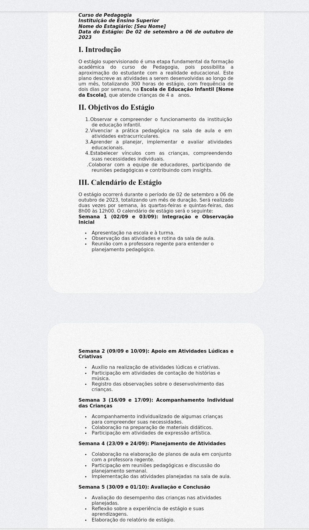 <p>2023 I. Introdução o estágio supervisionado é uma etapa fundamental da formação acadêmica do curso de Pedagogia, pois possibilita a aproximação do estudante com a realidade educacional. Este plano descreve as atividades a serem desenvolvidas ao longo de um mês, totalizando 300 horas de estágio, com frequência de dois dias por semana, na Escola de Educação Infantil [Nome da Escola], que atende crianças de 4 a anos. II. Objetivos do Estágio e funcionamento da instituição de educação infantil. a prática pedagógica na sala de aula e em atividades a planejar, implementar e atividades educacionais. 4. Estabelecer vínculos com as crianças, compreendendo suas necessidades individuais. Colaborar com a equipe de educadores, participando de reuniões pedagógicas e contribuindo com insights. III. Calendário de Estágio o estágio ocorrerá durante o período de 02 de setembro a 06 de outubro de totalizando um mês de duração. Será realizado duas vezes por semana, às quartas-feiras e quintas-feiras, das 8h00 às 12h00. o calendário de estágio será seguinte: Semana 1 (02/09 e 03/09): Integração e Observação Inicial Apresentação na escola e à turma. Observação das atividades e rotina da sala de aula. Reunião com a professora regente para entender o planejamento pedagógico. Semana 2 (09/09 e 10/09): Apoio em Atividades Lúdicas e Criativas Auxílio na realização de atividades lúdicas e criativas. Participação em atividades de contação de histórias e Registro das observações sobre desenvolvimento das crianças. Semana 3 (16/09 e 17/09): Acompanhamento Individual das Crianças Acompanhamento individualizado de algumas crianças para compreender suas necessidades. Colaboração na preparação de materiais didáticos. Participação em atividades de expressão artística. Semana 4 (23/09 e 24/09): Planejamento de Atividades Colaboração na elaboração de planos de aula em conjunto com a professora regente. Participação em reuniões pedagógicas e discussão do planejamento semanal. Implementação das atividades planejadas na sala de aula. Semana 5 (30/09 e 01/10): Avaliação e Conclusão Avaliação do desempenho das crianças nas atividades planejadas. Reflexão sobre a experiência de estágio e suas aprendizagens. Elaboração do relatório de estágio.</p>