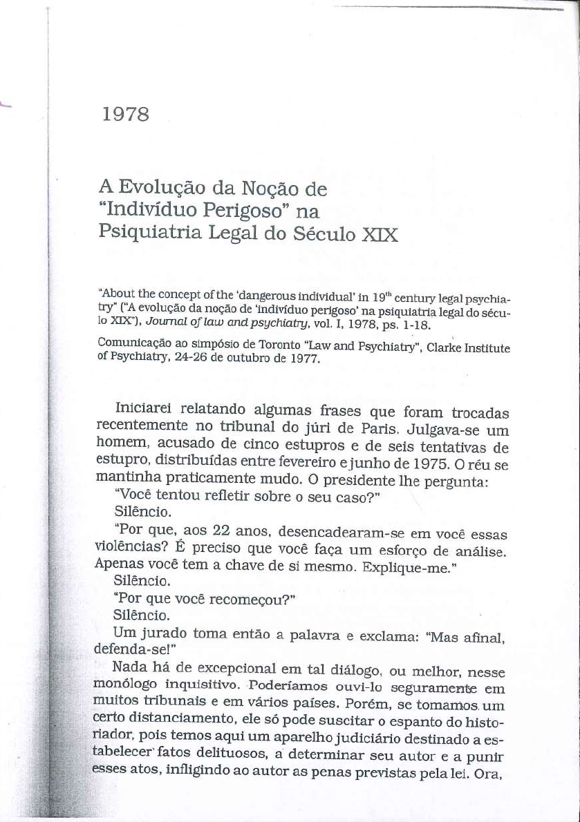 <p>1978 A Evolução da Noção de "Indivíduo Perigoso" na Psiquiatria Legal do Século XIX "About the concept of the 'dangerous in 19th century legal psychia- try" ("A evolução da noção de na psiquiatria legal do sécu- lo XIX"), Journal of law and psychiatry, vol. I, 1978, ps. 1-18. Comunicação ao simpósio de Toronto "Law and Psychiatry", Clarke Institute of Psychiatry, 24-26 de outubro de 1977. Iniciarei relatando algumas frases que foram trocadas recentemente no tribunal do júri de Paris. Julgava-se um homem, acusado de cinco estupros e de seis tentativas de estupro, distribuídas entre fevereiro e junho de 1975. o réu se mantinha praticamente mudo. presidente lhe pergunta: "Você tentou refletir sobre o seu caso?" Silêncio. "Por que, aos 22 anos, desencadearam-se em você essas violências? É preciso que você faça um esforço de análise. Apenas você tem a chave de si mesmo. Explique-me." Silêncio. "Por que você recomeçou?" Silêncio. Um jurado toma então a palavra e exclama: "Mas afinal, defenda-se!" Nada há de excepcional em tal diálogo, ou melhor, nesse monólogo inquisitivo. Poderíamos ouvi-lo seguramente em muitos tribunais e em vários países. Porém, se um certo distanciamento, ele só pode suscitar o espanto do histo- riador, pois temos aqui um aparelho judiciário destinado a es- fatos delituosos, a determinar seu autor e a punir esses atos, infligindo ao autor as penas previstas pela lei. Ora,</p><p>2 Michel Foucault Ditos e Escritos temos aqui fatos estabelecidos, um indivíduo que os reconhe- ce e que, portanto, aceita a pena que lhe será infligida. Tudo cria parecia ir da melhor maneira no melhor dos mundos judi- per ciários. Os legisladores, os redatores do Código do final do sé- que culo XVIII e início do XIX não poderiam imaginar situação da mais cristalina. E, no entanto, a máquina tende a travar, as que engrenagens emperram. Por quê? Porque o réu se cala. Ele si- lencia a respeito de quê? Dos fatos? Das circunstâncias? Da maneira pela qual eles se desenrolaram? Sobre aquilo que, cos naquele momento, teria podido provocá-los? De forma algu- ma ma. o réu se furta ante uma questão essencial para o tribunal con de hoje, mas que teria soado de maneira bem estranha há 150 anos: é você?" inío E o diálogo que eu citava há pouco prova claramente que, a nha essa questão, não basta que o réu responda: "Pois bem, sou o autor dos crimes. Isso é tudo. Julguem-me, já que vocês de- ent vem fazê-lo, e me condenem, se quiserem." Pede-se a ele bem mais: além do reconhecimento, é preciso uma confissão, um do exame de consciência, uma explicação de si, um esclareci- mento daquilo que se é. A máquina penal não pode mais vin funcionar apenas com uma lei, uma infração e um autor res- ponsável pelos fatos. Ela necessita de outra coisa, de um ma- terial suplementar; os juízes e os jurados, assim como os ros advogados e o Ministério Público só podem realmente desem- apr penhar seus papéis se um outro tipo de discurso lhes é forne- ball cido: aquele que o acusado sustenta sobre si mesmo, ou sop aquele que ele permite, por suas confissões, lembranças, confidências etc., que se sustente a seu respeito. E se esse ra discurso vem a faltar, o presidente se obstina, o júri se irrita; que pressiona-se, incita-se o réu ele não joga o jogo. Ele se asse- hes melha aos condenados que é preciso levar à guilhotina ou à cadeira elétrica porque eles tremem de medo. É preciso, certa- mente, que andem um pouco com suas próprias pernas se 1. Tr quiserem verdadeiramente ser executados; é preciso que eles III da falem um pouco de si mesmos se quiserem ser julgados. 2. Ca E aquilo que mostra claramente que esse elemento é in- d'un dispensável à cena judiciária, que não é possível julgar, con- Koop denar, sem que ele tenha sido fornecido de uma maneira ou dans de outra, é esse argumento empregado recentemente por um</p><p>1978 - A Evolução da Noção de "Indivíduo Perigoso". 3 advogado francês em um caso de rapto e assassinato de uma do criança. Por uma série de razões, esse caso teve grande re- di- percussão, não somente pela gravidade dos fatos, mas por- sé- que se jogava nesse processo a manutenção ou o abandono ção da pena de morte. Pleiteando mais contra a pena de morte do as que pelo réu, o advogado argumentou que se conhecia pouca si- coisa a respeito dele, e que o que ele era quase não havia Da transparecido nos interrogatórios ou nos exames psiquiátri- ue, cos. E fez esta reflexão espantosa (eu a cito de modo aproxi- gu- mativo): "Pode-se condenar à morte alguém que não se nal 150 A intervenção da psiquiatria no âmbito penal ocorreu no início do século XIX, a propósito de uma série de casos que ti- e, a nham aproximadamente a mesma forma e se desenrolaram u o entre 1800 e 1835. de- em Caso relatado por Metzger: um velho militar que vive retira- um do se apega ao filho de sua locadora. Certo dia, "sem nenhum eci- motivo, sem que nenhuma paixão, como a cólera, o orgulho, a hais vingança, estivesse em jogo", ele se atira sobre a criança, atin- res- gindo-a, sem matá-la, com dois golpes de martelo. ma- Caso de Sélestat: na Alsácia, durante o inverno muito rigo- os roso de 1817, no qual a miséria ronda, uma camponesa se em- aproveita da ausência de seu marido que havia saído para tra- rne- balhar e mata sua filhinha, corta-lhe a perna e a cozinha na ou ças, Em Paris, em 1825, uma criada, Henriette Cornier, procu- esse rita; ra a vizinha de seus patrões e lhe pede insistentemente para que ela lhe confie sua filha durante algum tempo. A vizinha sse- ou à hesita, mas consente; mais tarde, quando ela vem buscar a erta- se eles 1. Trata-se do caso Patrick Henry, sustentado pela Sra. Badinter, ver n° 205, vol. III da edição francesa desta obra. 2. Caso relatado primeiramente pelo Dr. Reisseisen de Estrasburgo, "Examen in- d'un cas extraordinaire Jahrbuch der J. H. con- Koop editor, 