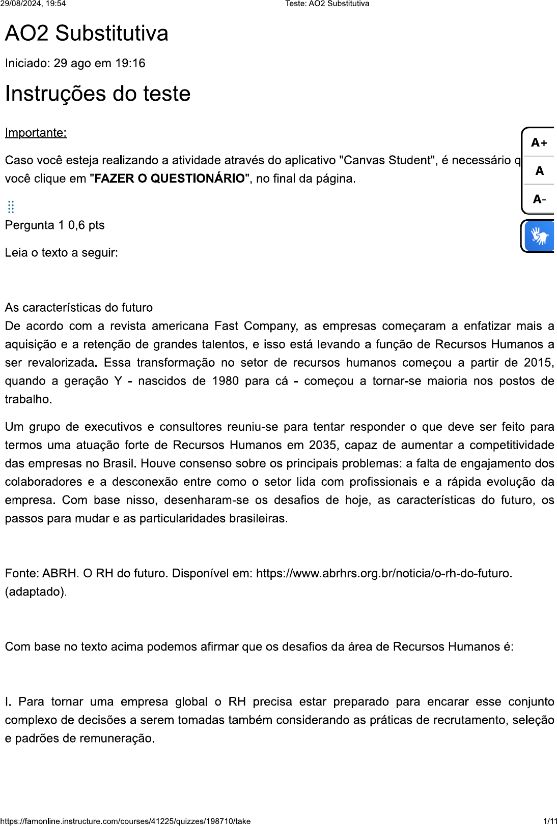 <p>29/08/2024, 19:54 Teste: AO2 Substitutiva AO2 Substitutiva Iniciado: 29 ago em 19:16 Instruções do teste Importante: A+ Caso você esteja realizando a atividade através do aplicativo "Canvas Student", é necessário q A você clique em "FAZER o QUESTIONÁRIO", no final da página. A- Pergunta 1 0,6 pts Leia o texto a seguir: As características do futuro De acordo com a revista americana Fast Company, as empresas começaram a enfatizar mais a aquisição e a retenção de grandes talentos, e isso está levando a função de Recursos Humanos a ser revalorizada. Essa transformação no setor de recursos humanos começou a partir de 2015, quando a geração Y - nascidos de 1980 para cá - começou a tornar-se maioria nos postos de trabalho. Um grupo de executivos e consultores reuniu-se para tentar responder o que deve ser feito para termos uma atuação forte de Recursos Humanos em 2035, capaz de aumentar a competitividade das empresas no Brasil. Houve consenso sobre os principais problemas: a falta de engajamento dos colaboradores e a desconexão entre como o setor lida com profissionais e a rápida evolução da empresa. Com base nisso, desenharam-se os desafios de hoje, as características do futuro, os passos para mudar e as particularidades brasileiras. Fonte: ABRH. O RH do futuro. Disponível em: https://www.abrhrs.org.br/noticia/o-rh-do-futuro. (adaptado). Com base no texto acima podemos afirmar que os desafios da área de Recursos Humanos é: I. Para tornar uma empresa global o RH precisa estar preparado para encarar esse conjunto complexo de decisões a serem tomadas também considerando as práticas de recrutamento, seleção e padrões de remuneração. https://famonline.instructure.com/courses/41225/quizzes/198710/take 1/11</p><p>29/08/2024, 19:54 Teste: AO2 Substitutiva II. Uma organização, ao passar por qualquer tipo de mudança, precisa observar somente o mercado e seu impacto, ao departamento de Recursos Humanos compete somente selecionar as pessoas de acordo com o perfil descrito pela gerência de cada departamento. III. Os Recursos Humanos não participa no processo de contenção de custos, porque é uma ação estratégica, porque essa contenção não afeta a perda de qualidade e a falta de motivação A+ funcionários. A É correto o que se afirma em: A- III, apenas e III, apenas II, apenas III, apenas apenas Pergunta 2 0,6 pts Leia o texto a seguir: A gestão da remuneração nas organizações se traduz na operacionalização de programas e estruturas de pagamento que podem ser identifi cadas com base em dois eixos: o modelo tradicional, que tem como referência o cargo para a consolidação dos planos de cargos e salários, e a abordagem estratégica, que tem como principio central o reconhecimento da contribuição das pessoas como fator a ser remunerado, principalmente por meio dos programas de remuneração variável. Fonte: RODRIGUES, Júnia Marçal. REMUNERAÇÃO E COMPETÊNCIAS: RETÓRICA OUREALIDADE? Disponível em: http://www.scielo.br/pdf/rae/v46nspe/v46nspea02.pdf Considerando as informações apresentadas, analise as afirmações abaixo: I. A remuneração por competências remunera os funcionários considerando sua produtividade, quanto menor a produtividade do funcionário em um determinado mês menor será o seu salário. https://famonline.instructure.com/courses/41225/quizzes/198710/take 2/11</p><p>29/08/2024, 19:54 Teste: AO2 Substitutiva II. A remuneração por competências se distancia dos moldes tradicionais e incentiva os funcionários mudar de emprego, onde suas habilidade são mais compatíveis com as exigidas pela organização. III. A implantação de um sistema de remuneração por competências possibilita o aumento da produtividade, maior flexibilidade, comprometimento, aumento do conhecimento e redução dos índices de absenteísmo, rotatividade, entre outros. A+ É correto o que se afirma em: A III, apenas. A- II, apenas II, apenas. apenas e III, apenas Pergunta 3 0,6 pts Leia o texto a seguir: A entrevista de seleção é uma etapa do processo seletivo que tem como objetivo levantar mais informações sobre o profissional participante. Além disso, a entrevista é um instrumento utilizado para medir capacidade de comunicação, habilidades de liderança, nível de ansiedade, capacidade de argumentação, os objetivos que o candidato tem, entre outras habilidades, que variam de organização para organização. Fonte: EMPREGOS. O que é a entrevista de seleção?. Disponível em: Considerando as informações apresentadas, avalie as asserções a seguir e a relação proposta entre elas. - - O objetivo central da entrevista de seleção é obter do candidato informações complementares que não foram reveladas durante a aplicação da etapa de testes. PORQUE https://famonline.instructure.com/courses/41225/quizzes/198710/take 3/11</p><p>29/08/2024, 19:54 Teste: AO2 Substitutiva - Na entrevista de seleção é possível, por exemplo, confirmar aspectos da personalidade de um candidato como entusiasmo, respeito e paixão; que não puderam ser obtidas na etapa anterior, que ocorreu por meio da realização de testes de língua portuguesa, matemática e informática. A respeito dessas asserções, assinale a opção correta: A+ As asserções e são proposições verdadeiras, e a asserção é uma justificativa correta da asserção I. A As asserções e são proposições falsas A- As asserções e são proposições verdadeiras, mas a asserção não é uma justificativa correta da A asserção é uma proposição verdadeira, e a asserção é uma proposição falsa. A asserção é uma proposição falsa, e a asserção é uma proposição verdadeira. Pergunta 4 0,6 pts Leia o trecho a seguir: O investimento em estratégias que potencializem as habilidades dos profissionais são as chaves do sucesso. Porém, diante desse desafio de educação corporativa, a diferença de treinamento e desenvolvimento gera muitas dúvidas. E par