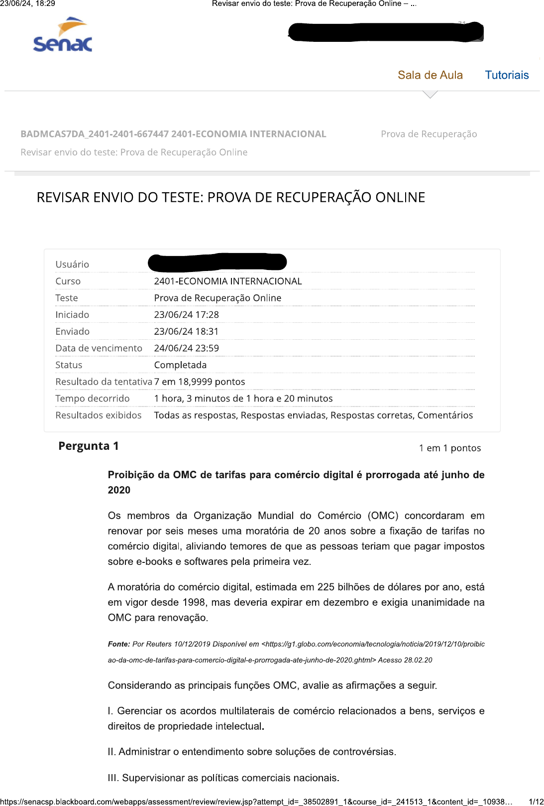<p>23/06/24, 18:29 Revisar envio do teste: Prova de Recuperação Online - Senac Sala de Aula Tutoriais BADMCAS7DA_2401-2401-667447 2401-ECONOMIA INTERNACIONAL Prova de Recuperação Revisar envio do teste: Prova de Recuperação Online REVISAR ENVIO DO TESTE: PROVA DE RECUPERAÇÃO ONLINE Usuário Curso 2401-ECONOMIA INTERNACIONAL Teste Prova de Recuperação Online Iniciado 23/06/24 17:28 Enviado 23/06/24 18:31 Data de vencimento 24/06/24 23:59 Status Completada Resultado da tentativa 7 em 18,9999 pontos Tempo decorrido 1 hora, 3 minutos de 1 hora e 20 minutos Resultados exibidos Todas as respostas, Respostas enviadas, Respostas corretas, Comentários Pergunta 1 1 em 1 pontos Proibição da OMC de tarifas para comércio digital é prorrogada até junho de 2020 Os membros da Organização Mundial do Comércio (OMC) concordaram em renovar por seis meses uma moratória de 20 anos sobre a fixação de tarifas no comércio digital, aliviando temores de que as pessoas teriam que pagar impostos sobre e-books e softwares pela primeira vez. A moratória do comércio digital, estimada em 225 bilhões de dólares por ano, está em vigor desde 1998, mas deveria expirar em dezembro e exigia unanimidade na OMC para renovação. Fonte: Por Reuters 10/12/2019 Disponível em 28.02.20 Considerando as principais funções OMC, avalie as afirmações a seguir. I. Gerenciar os acordos multilaterais de comércio relacionados a bens, serviços e direitos de propriedade intelectual. II. Administrar o entendimento sobre soluções de controvérsias. III. Supervisionar as políticas comerciais nacionais. 1/12</p><p>23/06/24, 18:29 Revisar envio do teste: Prova de Recuperação Online IV. Organizar conferências locais. É correto apenas o que se afirma em: Resposta Selecionada: d. I, e III. Respostas: e II. a. b. e IV. III e IV. C. d. I, e III. e. II, III e IV. Pergunta 2 0 em 1 pontos A integração econômica tem por princípio facilitar o comércio de bens e serviços entre os países-membros de um determinado bloco econômico, seguindo as recomendações a respeito do livre comércio. No entanto, como essa integração visa proteger o comércio entre parceiros de bloco, ela geralmente impõe restrições aos demais países, o que torna incerto o resultado em termos de bem-esta, pois as perdas podem, em certos casos, superar os benefícios (CARVALHO; SILVA, 2017). Um argumento contrário à irrestrita criação de blocos econômicos e seus consequentes benefícios comerciais está na ocorrência de desvio de comércio provocado pelo favorecimento de um parceiro ao bloco (menos eficiente) em detrimento do comércio com outra nação fora do bloco (mais eficiente). Nesse aspecto, a diferença das tarifas impostas aos membros e não membros ao bloco econômico causaria saldos líquidos negativos ao prejudicar a produção doméstica e a receita pública advinda do comércio internacional. Fonte: CARVALHO, Maria Auxiliadora de; SILVA, César Roberto Leite da. Economia Internacional. 5. ed. São Paulo: Saraiva, 2017. Tabela 1 - Exemplo de desvio de comércio (preço da saca de trigo em R$) BRASIL ARGENTINA Livre comércio 50 45 40 Tarifa de 40% 50 63 56 Tarifa de 20% 50 54 48 Fonte: adaptado de Carvalho e Silva (2017). Avalie as seguintes asserções e a relação proposta entre elas: 2/12</p><p>23/06/24, 18:29 Revisar envio do teste: Prova de Recuperação Online - Nas condições apresentadas, o Brasil possui a menor eficiência quando se trata de livre comércio, pois os produtores locais ofertam o trigo a um preço maior (R$ 50,00) que outros produtores da Argentina (R$ 45,00) e do Canadá (R$ 40,00). Portanto, podemos concluir que o Brasil possui a menor eficiência entre todos os países. PORQUE - custo unitário da saca de trigo é mais elevado. Tomando-se por base apenas o preço do produto e considerando a condição de livre comércio, o Brasil seria importador de trigo do Canadá, onde o preço do produto é menor. Assinale a opção correta a respeito dessas asserções. Resposta d. Selecionada: As duas são afirmações verdadeiras, mas a segunda não é uma justificativa correta da primeira. Respostas: As duas afirmações são falsas. a. b. A primeira afirmação é verdadeira, e a segunda é falsa. A primeira afirmação é falsa, e a segunda é C. d. As duas são afirmações verdadeiras, mas a segunda não é uma justificativa correta da primeira. e. As duas afirmações são verdadeiras, e a segunda é uma justificativa correta da primeira. Pergunta 3 1 em 1 pontos Aumento de barreiras comerciais pode elevar custos de investimento, diz FMI Por Reuters - 03/04/2019 [...] meados dos anos 2000 esses efeitos diminuíram com o abrandamento dos ganhos de comércio e produtividade, e o aumento das barreiras comerciais pode reverter alguns desses benefícios, disse o FMI. "As elevações nas barreiras tarifárias e não-tarifárias podem interromper as cadeias de fornecimento transfronteiriças e tornar a produção menos eficiente, retardar ou mesmo reverter a tendência de queda nos preços dos bens de capital", disse o organismo. A interrupção de cadeias de suprimentos --fenômeno que já está acontecendo, já que as tarifas dos EUA forçam a produção de alguns produtos para fora da China- - pode elevar o custo das mercadorias. Disponível ustos-de-investimento-diz-fmi.ghtml> Acesso em: 25 Set. 2019 (adaptado) 3/12</p><p>23/06/24, 18:29 Revisar envio do teste: Prova de Recuperação Online Qual das afirmações abaixo se refere a barreiras tarifárias: Resposta a. Selecionada: São as imposições financeiras determinadas pelos países sobre os produtos e serviços importados e são cobradas a partir do momento da entrada desse produto ou serviço no território nacional. Respostas: a. São as imposições financeiras determinadas pelos países sobre os produtos e serviços importados e são cobradas a partir do momento da entrada desse produto ou serviço no território nacional. b. Têm como 