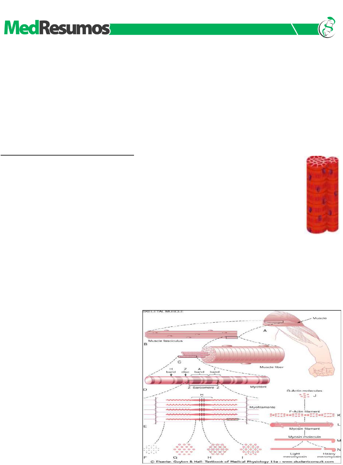 <p>Arlindo Ugulino Netto ● MEDRESUMOS 2014 ● HISTOLOGIA</p><p>1</p><p>www.medresumos.com</p><p>TECIDO MUSCULAR</p><p>As células musculares são especializadas por apresentar a capacidade de realizar a contração, tornando</p><p>possível a locomoção dos animais. São células alongadas e são denominadas estriadas ou lisas de acordo com a</p><p>presença ou ausência de proteínas contráteis miofibrilares, que se repetem regularmente formando miofilamentos.</p><p>A energia mecânica para a contração é retirada da hidrólise do ATP.</p><p>Alguns termos são utilizados para células musculares, como: a membrana da célula muscular é denominada</p><p>sarcolema, citoplasma é sarcoplasma, o R.E.L. é o retículo sacroplasmático e as mitocôndrias são sarcossomos.</p><p>Como as células musculares são alongadas, são comumente chamadas de fibras musculares.</p><p>Os três tipos musculares (estriado esquelético, liso e estriado cardíaco) tem origem no mesoderma.</p><p>Especialmente o músculo cardíaco, origina-se do mesoderma somático e do mesoderma esplancnopleural. Os músculos</p><p>esqueléticos são originados principalmente do mesoderma somático.</p><p>MÚSCULO ESTRIADO ESQUELÉTICO</p><p>O músculo esquelético é composto por células multinucleadas, longas e cilíndricas, que</p><p>apresentam estriações transversais que se contraem voluntariamente para facilitar os movimentos do</p><p>corpo.</p><p>No desenvolvimento embrionário, os mioblastos (células precursoras das células musculares) se</p><p>fundem formando os miotúbulos, que são células multinucleadas e cilíndricas. Esses miotúbulos formam</p><p>os miofibrilas (circundadas por mitocôndrias), que são constituídas pelos miofilamentos responsáveis</p><p>pela contração do músculo.</p><p>A força relativa de uma fibra muscular depende do seu tamanho. Enquanto a força de todo</p><p>músculo é função do numero e espessura das fibras.</p><p>ENVOLTÓRIOS</p><p>Os envoltórios do músculo esquelético são:</p><p> Epimísio: envolvem o músculo e são formados por tecido conjuntivo denso não modelado</p><p> Perimisio: deriva do epimísio e envolve os feixes das fibras musculares.</p><p> Endomísio: Ele envolve as fibras musculares. É composto por fibras reticulares e por uma lâmina externa</p><p>(lamina basal).</p><p>OBS: Os tendões e aponeuroses, responsáveis por ligar músculos a ossos e outros tecidos, são contínuos com os</p><p>envoltórios do tecido conjuntivo do músculo, agindo utilizando forças contráteis para movimentos.</p><p>MICROSCOPIA OPTICA</p><p>As fibras musculares são células</p><p>multinucleadas em que o núcleo situa-se</p><p>perifericamente. Pequenas células satélites</p><p>localizam-se em depressões rasas das fibras</p><p>musculares atuando como células</p><p>regeneradoras. As miofibrilas nas fibras</p><p>musculares dispõem-se paralelamente</p><p>apresentando estrias causadas pelas bandas</p><p>claras (presença de miosina ou actina) e</p><p>bandas escuras (presença de miosina e actina).</p><p>As bandas escuras são denominadas</p><p>Banda A. Seu centro é ocupado por uma área</p><p>clara, a Banda H que está dividida ao meio</p><p>pela Linha M. As bandas claras são as Bandas</p><p>I e estão divididas por uma linha escura, a</p><p>Linha Z. A região da miofibrila delimitada entre</p><p>duas Linhas Z é denominada Sarcômero, que</p><p>é a unidade morfofuncional do músculo. A</p><p>contração muscular se dá a partir do momento</p><p>que este sarcomero diminui de tamanho</p><p>(aproximação das Linhas Z).</p><p>Arlindo Ugulino Netto.</p><p>HISTOLOGIA 2014</p><p>Arlindo Ugulino Netto ● MEDRESUMOS 2014 ● HISTOLOGIA</p><p>2</p><p>www.medresumos.com</p><p>OBS: Túbulos T, Retículo Sarcoplasmático e Tríades. São elementos essenciais para a contração do músculo</p><p>esquelético. Os túbulos T são longas invaginações tubulares que se colocam especificamente no plano da junção das</p><p>Bandas A e I. Logo, cada sarcômero possui 2 conjuntos de túbulos T. Associados a esses túbulos, está o retículo</p><p>sarcoplasmático localizado da mesma maneira desses túbulos. O retículo está envolvido no armazenamento de cálcio</p><p>intracelular, formando uma rede em torno de cada miofibrila e apresenta cisternas terminais em cada junção A – I.</p><p>Então, duas dessas cisternas sempre estão intimamente apostas a um túbulo T, formando a tríade.</p><p>Tríade = 2 Cisternas terminais (Retículo Sarcoplasmático) + Tubulos T</p><p>O retículo sarcoplasmatico regula a contração muscular através do sequestro (que leva ao relaxamento) e da liberação</p><p>(que leva a contração) de íons cálcio no sarcoplasma. O estímulo desencadeador para a liberação de cálcio é a onda de</p><p>despolarização transmitidas pelos túbulos T, que causa a abertura dos canais liberadores de Cálcio das cisternas</p><p>terminais, havendo a liberação desse íon na proximidade das miofibrilas.</p><p>CONSTITUIÇÃO DAS MIOFIBRILAS</p><p>As miofibrilas são compostas por miofilamentos finos e grossos interpostos. Os grossos são semelhantes a</p><p>bastões paralelos e entrelaçados aos finos e são compostos principalmente pela miosina. Enquanto os miofilamentos</p><p>finos (figura abaixo) são compostos por actina.</p><p>1. Filamentos Grossos: são compostos por moléculas de miosina alinhadas extremidade por extremidade. Cada</p><p>molécula de miosina que a compõe é composta por duas cadeias pesadas idênticas e por dois pares de cadeias</p><p>leves.</p><p> Meromiosina Leve: semelhante a um bastão compostas por duas cadeias polipeptídicas em forma de</p><p>bastão enrolado.</p><p> Meromiosina Pesada: são as duas cabeças globulares com as duas porções proximais, formadas por</p><p>cadeias polipeptídicas enroladas uma em torno da outra.</p><p>2. Filamentos Finos: são compostos por duas cadeias de filamentos de actina F (formada por actinas G,</p