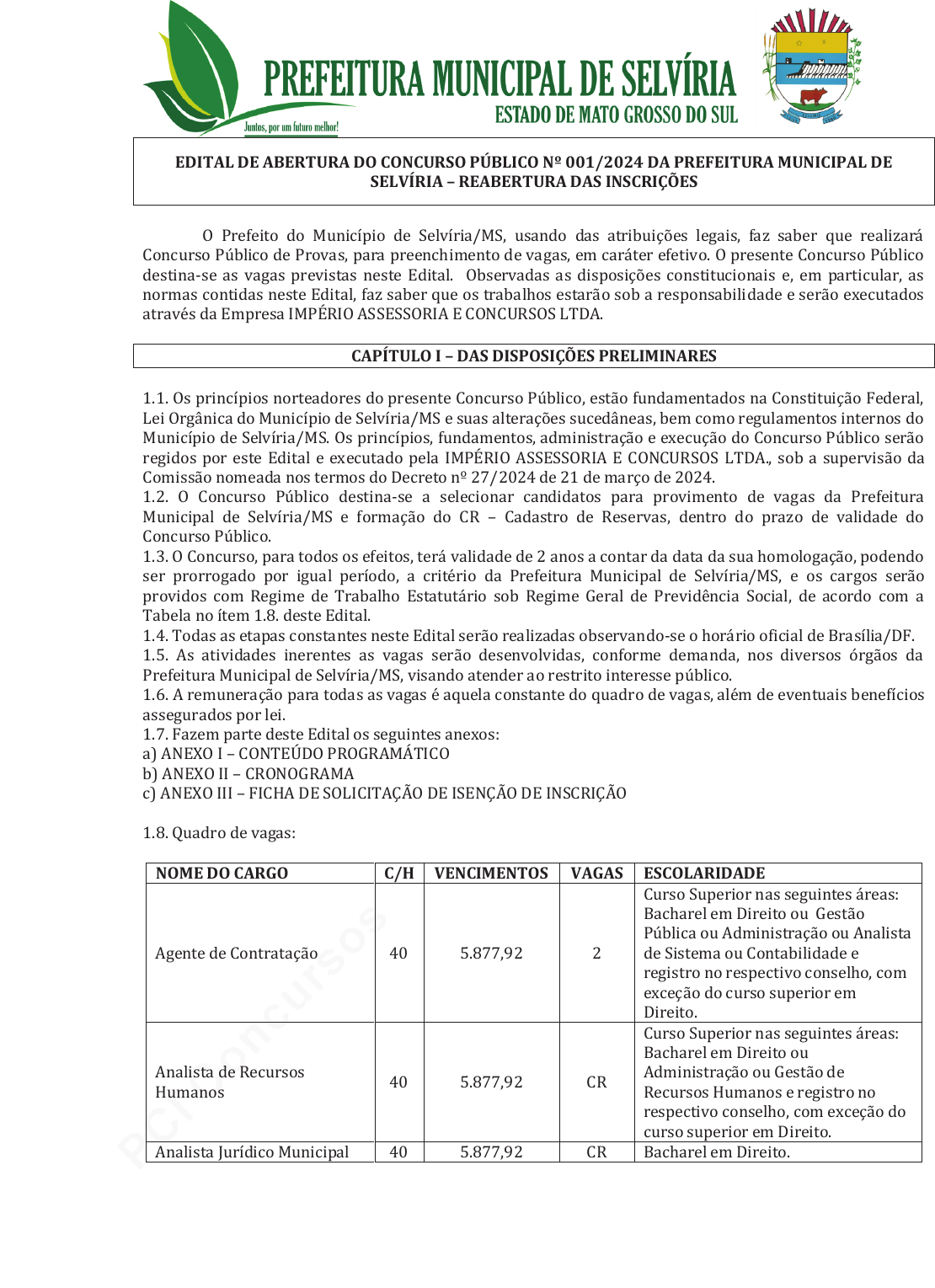 <p>pcimarkpci MjgwNDoyZWJjOjg5MDk6OGEwMDo2Yzk1OmMzZTk6Y2NiYzoyMjg0:U2F0LCAwMyBBdWcgMjAyNCAxNDo0Mzo1MCAtMDMwMA==</p><p>www.pciconcursos.com.br</p><p>EDITAL DE ABERTURA DO CONCURSO PÚBLICO Nº 001/2024 DA PREFEITURA MUNICIPAL DE</p><p>SELVÍRIA –REABERTURA DAS INSCRIÇÕES</p><p>O Prefeito do Município de Selvíria/MS, usando das atribuições legais, faz saber que realizará</p><p>Concurso Público de Provas, para preenchimento de vagas, em caráter efetivo. O presente Concurso Público</p><p>destina-se as vagas previstas neste Edital. Observadas as disposições constitucionais e, em particular, as</p><p>normas contidas neste Edital, faz saber que os trabalhos estarão sob a responsabilidade e serão executados</p><p>através da Empresa IMPÉRIO ASSESSORIA E CONCURSOS LTDA.</p><p>CAPÍTULO I –DAS DISPOSIÇÕES PRELIMINARES</p><p>1.1. Os princípios norteadores do presente Concurso Público, estão fundamentados na Constituição Federal,</p><p>Lei Orgânica do Município de Selvíria/MS e suas alterações sucedâneas, bem como regulamentos internos do</p><p>Município de Selvíria/MS. Os princípios, fundamentos, administração e execução do Concurso Público serão</p><p>regidos por este Edital e executado pela IMPÉRIO ASSESSORIA E CONCURSOS LTDA., sob a supervisão da</p><p>Comissão nomeada nos termos do Decreto nº 27/2024 de 21 de março de 2024.</p><p>1.2. O Concurso Público destina-se a selecionar candidatos para provimento de vagas da Prefeitura</p><p>Municipal de Selvíria/MS e formação do CR – Cadastro de Reservas, dentro do prazo de validade do</p><p>Concurso Público.</p><p>1.3. O Concurso, para todos os efeitos, terá validade de 2 anos a contar da data da sua homologação, podendo</p><p>ser prorrogado por igual período, a critério da Prefeitura Municipal de Selvíria/MS, e os cargos serão</p><p>providos com Regime de Trabalho Estatutário sob Regime Geral de Previdência Social, de acordo com a</p><p>Tabela no ítem 1.8. deste Edital.</p><p>1.4. Todas as etapas constantes neste Edital serão realizadas observando-se o horário oficial de Brasília/DF.</p><p>1.5. As atividades inerentes as vagas serão desenvolvidas, conforme demanda, nos diversos órgãos da</p><p>Prefeitura Municipal de Selvíria/MS, visando atender ao restrito interesse público.</p><p>1.6. A remuneração para todas as vagas é aquela constante do quadro de vagas, além de eventuais benefícios</p><p>assegurados por lei.</p><p>1.7. Fazem parte deste Edital os seguintes anexos:</p><p>a) ANEXO I – CONTEÚDO PROGRAMÁTICO</p><p>b) ANEXO II – CRONOGRAMA</p><p>c) ANEXO III – FICHA DE SOLICITAÇÃO DE ISENÇÃO DE INSCRIÇÃO</p><p>1.8. Quadro de vagas:</p><p>NOME DO CARGO C/H VENCIMENTOS VAGAS ESCOLARIDADE</p><p>Agente de Contratação 40 5.877,92 2</p><p>Curso Superior nas seguintes áreas:</p><p>Bacharel em Direito ou Gestão</p><p>Pública ou Administração ou Analista</p><p>de Sistema ou Contabilidade e</p><p>registro no respectivo conselho, com</p><p>exceção do curso superior em</p><p>Direito.</p><p>Analista de Recursos</p><p>Humanos</p><p>40 5.877,92 CR</p><p>Curso Superior nas seguintes áreas:</p><p>Bacharel em Direito ou</p><p>Administração ou Gestão de</p><p>Recursos Humanos e registro no</p><p>respectivo conselho, com exceção do</p><p>curso superior em Direito.</p><p>Analista Jurídico Municipal 40 5.877,92 CR Bacharel em Direito.</p><p>pcimarkpci MjgwNDoyZWJjOjg5MDk6OGEwMDo2Yzk1OmMzZTk6Y2NiYzoyMjg0:U2F0LCAwMyBBdWcgMjAyNCAxNDo0Mzo1MSAtMDMwMA==</p><p>www.pciconcursos.com.br</p><p>Assistente Administrativo 40 2.572,85 CR Ensino Médio Completo</p><p>Assistente Social 30 4.469.16 1</p><p>Curso Superior em Serviço Social e</p><p>registro no respectivo conselho.</p><p>Auxiliar de Serviços Diversos 40 2.085,77 8 Alfabetizado</p><p>Contador 40 6.480,41 CR</p><p>Curso superior em Ciências</p><p>Contábeis e registro no CRC</p><p>Controlador 40 6.480,41 1</p><p>Curso Superior nas seguintes áreas:</p><p>Bacharel em Direito ou</p><p>Administração ou Gestão Pública ou</p><p>Economia ou Contabilidade e</p><p>registro no respectivo conselho, com</p><p>exceção do curso superior em</p><p>Direito.</p><p>Coveiro 40 2.109,63 1 Ensino Fundamental Incompleto</p><p>Fiscal de Obras e Postura 40 2.356,58 CR Ensino Médio Completo</p><p>Fiscal Tributário 40 5.877,92 CR Curso superior completo</p><p>Fisioterapeuta 20 3.515,91 1</p><p>Curso Superior em Fisioterapia e</p><p>registro no respectivo conselho.</p><p>Gestor de Contratos 40 5.877,92 1 Curso Superior completo</p><p>Motorista 40 2.520,49 1</p><p>Ensino Fundamental Incompleto com</p><p>CNH “D” ou “E”</p><p>Nutricionista 40 3.515,91 1</p><p>Curso Superior em Nutrição registro</p><p>no respectivo conselho</p><p>Operador de Máquinas 40 3.411,60 1</p><p>Ensino Fundamental Incompleto e</p><p>CNH, no mínimo, categoria “B”.</p><p>Recepcionista 40 2.572,85 CR Ensino Médio Completo</p><p>Técnico em Segurança do</p><p>Trabalho</p><p>40 2.572,85 1</p><p>Ensino médio, curso específico e</p><p>registro no respectivo conselho</p><p>Tratorista 40 2.130,47 1</p><p>Ensino Fundamental Incompleto e</p><p>CNH, no mínimo, categoria “B”.</p><p>I - FICAM AUTOMATICAMENTE RECEPCIONADAS TODAS AS INSCRIÇÕES HOMOLOGADAS</p><p>ANTERIORMENTE NOS TERMOS DO EDITAL DE CONCURSO PÚBLICO Nº 001/2024 DE 14 DE MAIO DE</p><p>2024. CASO O CANDIDATO NÃO TENHA MAIS INTERESSE EM REALIZAR A PROVA O MESMO DEVERÁ</p><p>SOLICITAR A DEVOLUÇÃO DA TAXA DE INSCRIÇÃO ENVIANDO E-MAIL COM O ASSUNTO (DEVOLUÇÃO DA</p><p>TAXA – SELVÍRIA) PARA concursosimperio@hotmail.com INFORMANDO UMA CHAVE PIX OU SEUS DADOS</p><p>BANCÁRIOS.</p><p>II - O CRONOGRAMA PARA SOLICITAÇÃO DA DEVOLUÇÃO DA TAXA DE INSCRIÇÃO PARA OS CANDIDATOS</p><p>QUE NÃO TENHAM MAIS INTERESSE EM REALIZAR O PRESENTE CONCURSO PÚBLICO SERÁ DIVULGADO</p><p>DE ACORDO COM O ANEXO II.</p><p>III - FICAM TAMBÉM RECEPCIONADAS TODAS AS ISENÇÕES DE TAXA DE INSCRIÇÃO DIVULGADA