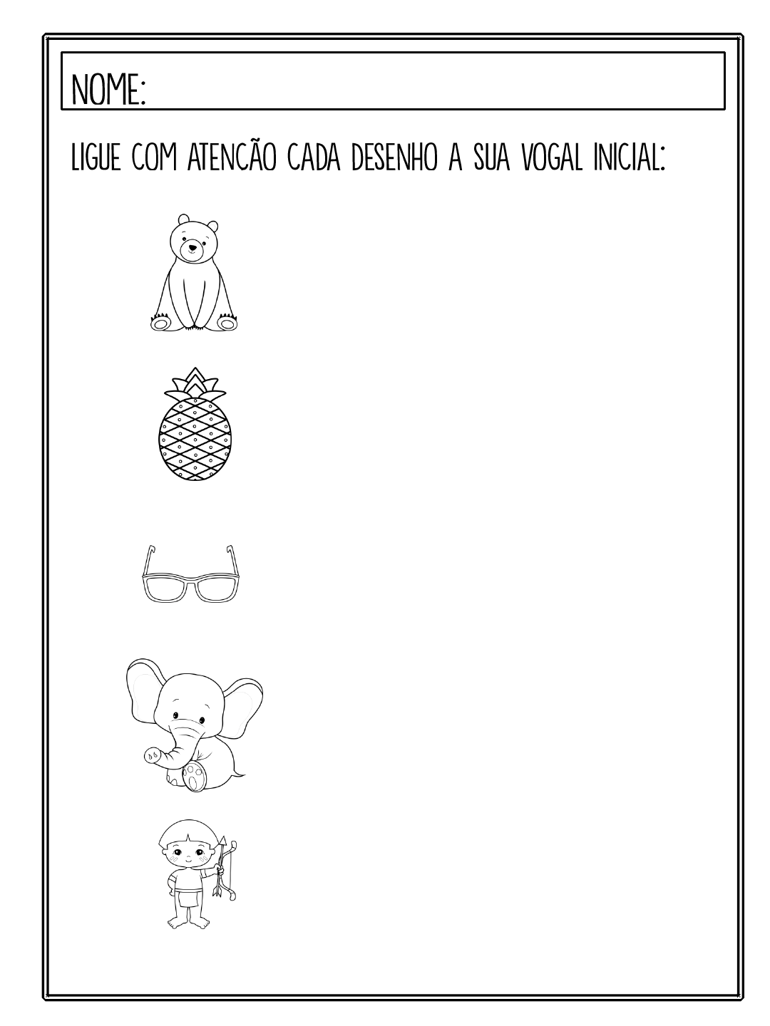 <p>_________________________________________________________________________________________________________</p><p>A</p><p>E</p><p>I</p><p>O</p><p>U</p><p>@professora.val</p><p>NOME:__________________________________________</p><p>A - E - I - O - U</p><p>ESCREVA A LETRA INICIAL DO NOME DE CADA DESENHO.</p><p>...........</p><p>..........</p><p>..........</p><p>...........</p><p>...........</p><p>...........</p><p>...........</p><p>..........</p><p>..........</p><p>..........</p><p>..........</p><p>.........</p><p>..........</p><p>...........</p><p>...........</p><p>@professora.val</p><p>COOM</p><p>NOME: ___________________________________________</p><p>COMPLETE AS PALAVRAS COM AS VOGAIS QUE ESTÃO FALTANDO:</p><p>A – E – I – O – U</p><p>C __ R __ J __ L __ __</p><p>__ R V __ R __ P__ C __ L __</p><p>S __ F__ D __ M __ N __</p><p>__ C __ L __ S P __ P__ C __</p><p>F__ C __ R __ P__ S __</p><p>V__ L __ S __ L</p><p>M __R __ C __ J __ X __ C __ R __</p><p>C__ G __ M __ L __ R __ T __</p><p>@professora.val</p>