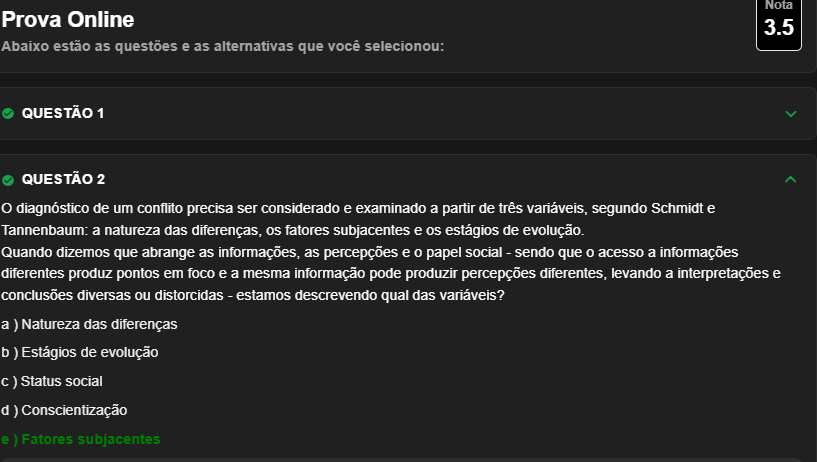 <p>Nota Prova Online 3.5 Abaixo estão as questões e as alternativas que você QUESTÃO 1 QUESTÃO 2 O diagnóstico de um conflito precisa ser considerado e examinado a partir de três variáveis, segundo Schmidt e Tannenbaum: a natureza das diferenças, os fatores subjacentes e os estágios de evolução. Quando dizemos que abrange as informações, as percepções e papel social - sendo que acesso a informações diferentes produz pontos em foco e a mesma informação pode produzir percepções diferentes, levando a interpretações e conclusões diversas ou distorcidas - estamos descrevendo qual das variáveis? a ) Natureza das diferenças b ) Estágios de evolução c) Status social d ) Conscientização e ) Fatores subjacentes</p>