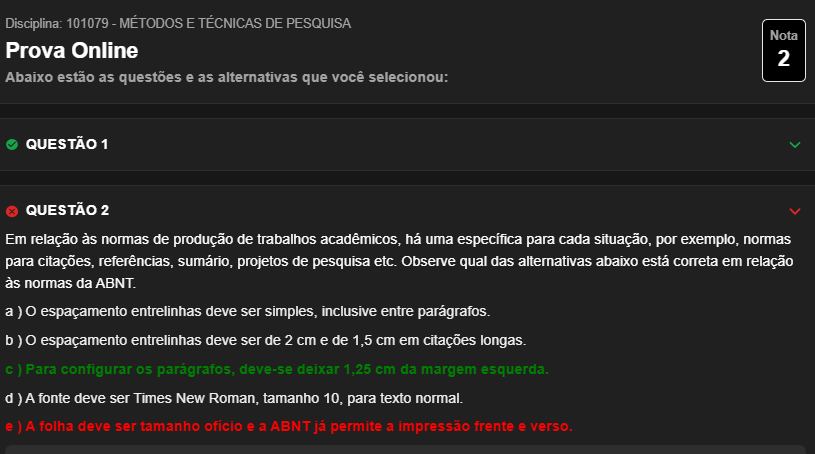 <p>Disciplina: 101079 - MÉTODOS E TÉCNICAS DE PESQUISA Nota Prova Online 2 Abaixo estão as questões e as alternativas que você selecionou: QUESTÃO 1 QUESTÃO 2 Em relação às normas de produção de trabalhos acadêmicos, há uma específica para cada situação, por exemplo, normas para citações, referências, sumário, projetos de pesquisa etc. Observe qual das alternativas abaixo está correta em relação às normas da ABNT. a ) O espaçamento entrelinhas deve ser simples, inclusive entre parágrafos. b) O espaçamento entrelinhas deve ser de 2 cm e de 1,5 cm em citações longas. ) Para configurar os parágrafos, deve-se deixar 1,25 cm da margem esquerda. d) A fonte deve ser Times New Roman, tamanho 10, para texto normal. e ) A folha deve ser tamanho e a ABNT já permite a impressão frente e verso.</p>