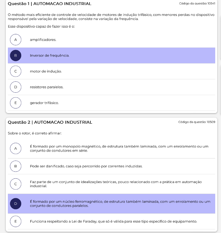 <p>Questão 1 AUTOMACAO INDUSTRIAL Código da questão: 10541 método mais eficiente de controle de velocidade de motores de indução trifásico, com menores perdas no dispositivo responsável pela variação de velocidade, consiste na variação da frequência. Esse dispositivo capaz de fazer isso é A amplificadores. B Inversor de frequência. motor de indução. D resistores paralelos. E gerador trifásico. Questão 2 AUTOMACAO INDUSTRIAL Código da questão: 10509 Sobre o rotor, é correto afirmar: É formado por um monopolo magnético, de estrutura também laminada, com um enrolamento ou um A conjunto de condutores em série. B Pode ser danificado, caso seja percorrido por correntes induzidas. C Faz parte de um conjunto de idealizações teóricas, pouco relacionado com a prática em automação industrial. D É formado por um núcleo ferromagnético, de estrutura também laminada, com um enrolamento ou um conjunto de condutores paralelos. E Funciona respeitando a Lei de Faraday, que só é válida para esse tipo específico de equipamento.</p><p>Questão 3 AUTOMACAO INDUSTRIAL Código da questão: 10522 Sobre os sensores indutivos, é correto afirmar: A Irá, para a medição da pressão, por exemplo, associar a variação da grandeza não elétrica à alteração da resistência elétrica de uma bobina. B Irá, para a medição da pressão, por exemplo associar a variação da grandeza não elétrica à alteração de indutância de uma bobina. C São usados para induzir a formação de um campo eletromagnético no interior de uma bobina. D Irá, para a medição da pressão, por exemplo, associar a variação da grandeza não elétrica à alteração da capacitância de uma bobina. E Não pode ser usado para medição da pressão, apenas os sensores capacitivos podem fazê-lo. Questão 4 AUTOMACAO INDUSTRIAL Código da questão: 10536 A automação industrial se subdivide em três áreas principais, podendo ser rígida, flexível ou programável. Quando o equipamento é projetado com capacidade de modificar a sequência de operações, acomodando, assim, diferentes configurações de Qual área da automação estamos falando? A automação rígida. B automação eletrônica. C automação programável. D automação inflexível. E automação flexível.</p><p>Questão 5 AUTOMACAO INDUSTRIAL Código da questão: 10521 Sobre os sensores capacitivos, assinale a alternativa correta. Os sensores capacitivos podem ser utilizados para a medição da pressão e de nível, pois medem apenas a A capacitância do capacitor. B A constante dielétrica não interfere no aumento ou diminuição da capacitância. Assim como no caso dos sensores resistivos, os sensores capacitivos podem ser utilizados para a medição C da pressão e de nível. D Um sensor capacitivo utiliza como princípio de medição de certas grandezas físicas o efeito de variação da temperatura. E Um sensor capacitivo utiliza como princípio de medição de certas grandezas físicas o efeito de variação da resistência. Questão 6 AUTOMACAO INDUSTRIAL Código da questão: 10526 Sobre a organização da memória do processador, assinale a alternativa correta. A Os arquivos de programa ocupam toda a memória do equipamento e possui a programação ladder incluída. B Os arquivos de programa ocupam a maior parte da memória total do equipamento e contêm a programação ladder. C Os arquivos de programa não ocupam a memória do equipamento e contêm a programação ladder. D Os arquivos de programa ocupam a maior parte da memória total do equipamento e contêm a programação ou C+. E Os arquivos de programa ocupam toda a memória do equipamento e, por isso, não contêm a programação ladder.</p><p>Questão 7 I AUTOMACAO INDUSTRIAL Código da questão: 129387 dispositivo analógico usado para medição de força, pressão ou aceleração, baseando-se no efeito piezoelétrico de certos tipos de materiais e circuitos, é o: A Sensor de vazão. B D Pressostato. E Transdutor piezoelétrico. Questão 8 I AUTOMACAO INDUSTRIAL Código da questão: 10517 Sobre o funcionamento dos controladores lógicos programáveis, assinale a alternativa correta. módulo de entrada, juntamente com os módulos de saída, permite que o CLP monitore o sistema, A basicamente. módulo de entrada, juntamente com os módulos de saída, permite que o CLP receba eletricidade, mas B não possuem a capacidade de monitorar o sistema. Os módulos de saída são os responsáveis pela transmissão da eletricidade, por isso não podem convertem C os sinais de acionamento vindos da CPU em valores digitais ou analógicos, para que haja comunicação com esses dispositivos conectados. D Possui a grande vantagem, em seu funcionamento, de não precisar de um módulo de saída. E Possui a grande vantagem, em seu funcionamento, de não precisar de um módulo de entrada.</p><p>Questão 9 AUTOMACAO INDUSTRIAL Código da questão: 129389 dispositivo que consiste em um tipo especial de relé, projetado para o funcionamento em sistemas com carga de potência mais elevada, como é caso de lâmpadas, aquecedores, transformadores e os motores elétricos, sendo os últimos responsáveis pelos sistemas de proteção contra sobrecargas em alguns motores. A Chave de partida manual. B CLP. C Contatores. D Relés com E Trafo. Questão 10 AUTOMACAO INDUSTRIAL Código da questão: 10544 ciclo básico de varredura do CLP é formado por quatro processos básicos principais, EXCETO: A realização do diagnóstico e da comunicação. B execução do programa. C atualização de D leitura de entradas. E arrefecimento de Prova finalizada com sucesso! Resultado: 10.00 / 10.00 Voltar para a pagina inicial</p>
