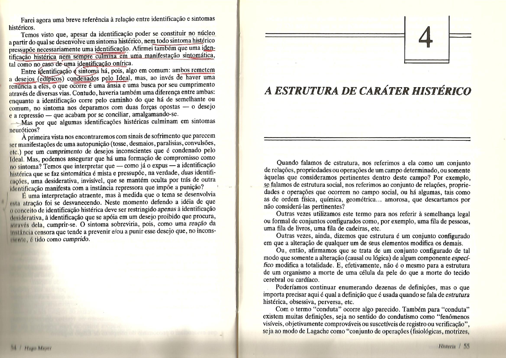 <p>Farei agora uma breve referência à relação entre identificação e sintomas histéricos. Temos visto que, apesar da identificação poder se constituir no núcleo a partir do qual se desenvolve um sintoma histérico, nem todo sintoma histérico 4 pressupõe necessariamente uma identificação. Afirmei também que uma iden- tificação histérica nem sempre culmina em uma manifestação sintomática, tal como no caso de uma identificação onírica. Entre identificação e sintoma há, pois, algo em comum: ambos remetem a desejos condenados pelo Ideal, mas, ao invés de haver uma a eles, o que ocorre é uma ânsia e uma busca por seu cumprimento através de diversas vias. Contudo, haveria também uma diferença entre ambas: A ESTRUTURA DE CARÁTER HISTÉRICO enquanto a identificação corre pelo caminho do que há de semelhante ou comum, no sintoma nos deparamos com duas forças opostas o desejo e a repressão que acabam por se conciliar, amalgamando-se. Mas por que algumas identificações histéricas culminam em sintomas neuróticos? À primeira vista nos encontraremos com sinais de sofrimento que parecem ser manifestações de uma autopunição (tosse, desmaios, paralisias, convulsões, etc.) por um cumprimento de desejos inconscientes que é condenado pelo Ideal. Mas, podemos assegurar que há uma formação de compromisso como no sintoma? Temos que interpretar que como já o expus a identificação Quando falamos de estrutura, nos referimos a ela como um conjunto histérica que se faz sintomática é mista e na verdade, duas identifi- de relações, propriedades ou operações de um campo determinado, ou somente cações, uma desiderativa, invisível, que se mantém oculta por trás de outra que consideramos pertinentes dentro deste campo? Por exemplo, identificação manifesta com a instância repressora que impõe a punição? se falamos de estrutura social, nos referimos ao conjunto de relações, proprie- É uma interpretação atraente, mas à medida que o tema se desenvolvia dades e operações que ocorrem no campo social, ou há algumas, tais como esta atração foi se Neste momento defendo a idéia de que as de ordem física, química, geométrica... amorosa, que descartamos por o conceito de identificação histérica deve ser restringido apenas à identificação não considerá-las pertinentes? desiderativa, à identificação que se apóia em um desejo proibido que procura, Outras vezes utilizamos este termo para nos referir à semelhança legal através dela, cumprir-se. o sintoma sobreviria, pois, como uma reação da ou formal de conjuntos configurados como, por exemplo, uma fila de pessoas, instância censora que tende a prevenir e/ou a punir esse desejo que, no incons- uma fila de livros, uma fila de cadeiras, etc. Outras vezes, ainda, dizemos que estrutura é um conjunto configurado é tido como cumprido. em que a alteração de qualquer um de seus elementos modifica os demais. Ou, então, afirmamos que se trata de um conjunto configurado de tal modo que somente a alteração (causal ou lógica) de algum componente especí- fico modifica a totalidade. E, efetivamente, não é o mesmo para a estrutura de um organismo a morte de uma célula da pele do que a morte do tecido cerebral ou cardíaco. Poderíamos continuar enumerando dezenas de definições, mas o que importa precisar aqui é qual a definição que é usada quando se fala de estrutura histérica, obsessiva, perversa, etc. Com o termo "conduta" ocorre algo parecido. Também para "conduta" existem muitas definições, seja no sentido do condutismo como "fenômenos visíveis, objetivamente comprováveis ou suscetíveis de registro ou verificação", seja ao modo de Lagache como "conjunto de operações (fisiológicas, motrizes, / Hugo Mayer Histeria 55</p><p>verbais, mentais) pelas quais um organismo em situação reduz as tensões b) Ego Id, por um lado, e Ego realidade, por outro lado? que o motivam e realiza suas possibilidades". 2) Do nível em que se propõe o conflito: Creio que o que foi dito até aqui basta como indício que nos deve fazer a) edípico? suspeitar que os conceitos de estrutura e conduta, longe de se excluir, impli- b) narcisista e pré-edípico? cam-se mutuamente quando pensamos em neuroses, em perversões ou em c) ambos...? qualquer quadro psicopatológico. Podemos imaginar, por acaso, uma conduta 3) Do grau de afastamento da realidade, da defesa empregada, do modo humana que não tenha uma estrutura e que não seja, ao mesmo tempo, de "restituir" o rechaçado da realidade? expressão, momento ou parte de outra à qual nos remete? E, por outro 4) Do grau de aceitação, desafio ou rechaço da lei e da função paterna? lado, como pensar uma estrutura psicopatológica (neurose, perversão, psico- 5) Da área e do modo como se manifesta a sexualidade infantil que se...) se não a partir da valorização de uma conduta que a evidencia? Evidente- demanda ser satisfeita? mente, falamos sempre de estruturas e conditas. 6) Da fixidez, estereotipia e exclusividade na maneira de se relacionar Sabemos que a homossexualidade, por exemplo, é avaliada de maneiras com os objetos ou com o objeto sexual? bastante distintas conforme se trate da adjetivação de uma fantasia, de uma 7) De uma valorização social que brota de uma ideologia preconceituosa ação circunstancial ou de uma "escolha sexual" por parte de um adulto. e, às vezes, compartilhada pela maioria? Percorremos, assim, um trajeto que vai desde uma manifestação neurótica É impossível e pouco pertinente tentarmos aqui responder semelhante a uma perversa. Porém... em que momento cruzamos a fronteira entre a espectro de questões que somente nos permitem vislumbrar a complexidade neurose e a perversão? do tema. Retomemos, pois, a mais simples das idéias sobre a estrutura de Isto nos conduz ao problema não apenas do que caracteriza cada entidade, caráter. Quando fizermos referência a ela será para aludir aos mecanismos ma