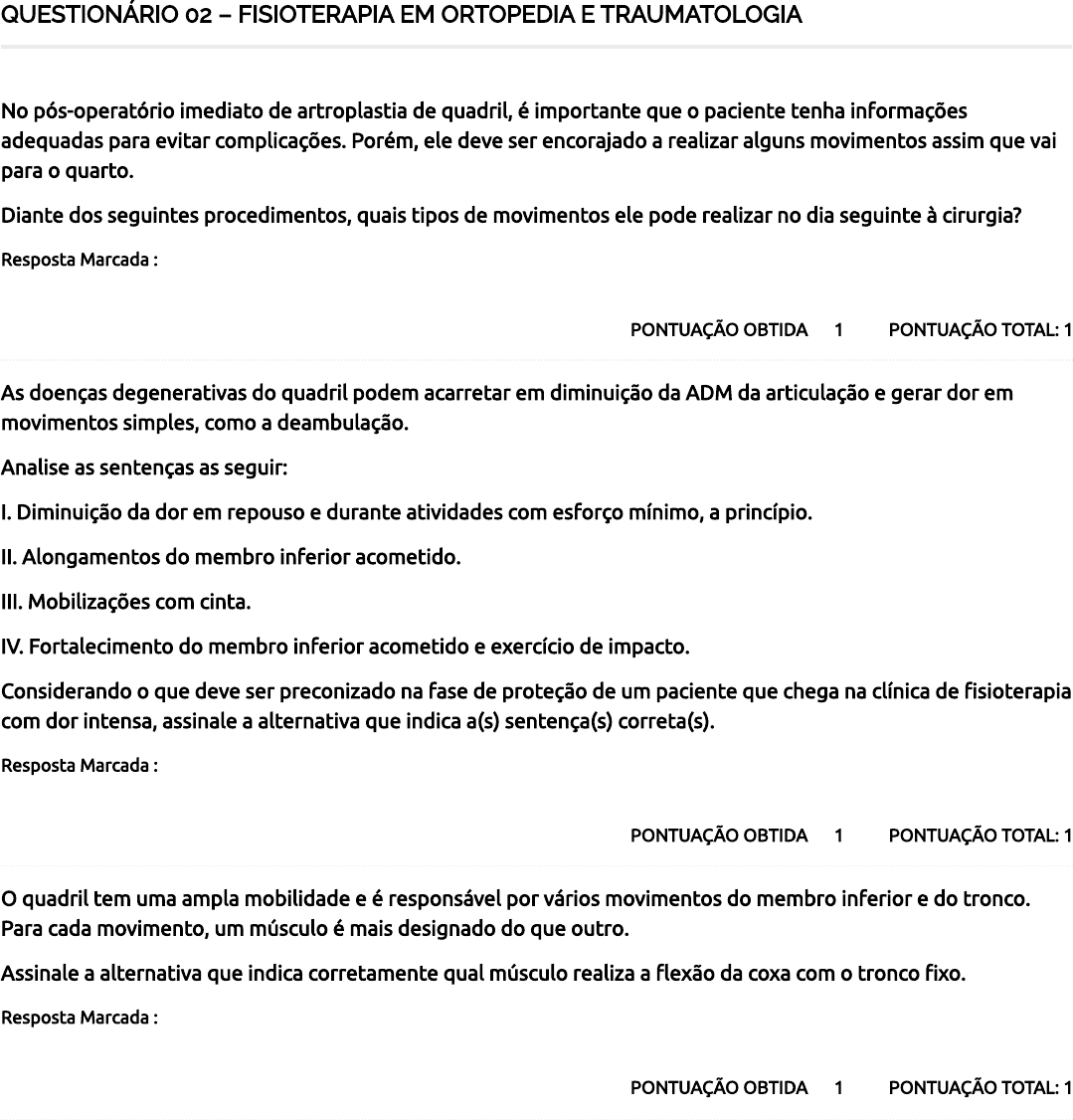 <p>QUESTIONÁRIO 02 – FISIOTERAPIA EM ORTOPEDIA E TRAUMATOLOGIA</p><p>PONTUAÇÃO TOTAL: 1PONTUAÇÃO OBTIDA 1</p><p>No pós-operatório imediato de artroplastia de quadril, é importante que o paciente tenha informações</p><p>adequadas para evitar complicações. Porém, ele deve ser encorajado a realizar alguns movimentos assim que vai</p><p>para o quarto.</p><p>Diante dos seguintes procedimentos, quais tipos de movimentos ele pode realizar no dia seguinte à cirurgia?</p><p>Resposta Marcada :</p><p>Deambulação com dispositivos auxiliares e sentar-se e levantar-se do leito.</p><p>PONTUAÇÃO TOTAL: 1PONTUAÇÃO OBTIDA 1</p><p>As doenças degenerativas do quadril podem acarretar em diminuição da ADM da articulação e gerar dor em</p><p>movimentos simples, como a deambulação.</p><p>Analise as sentenças as seguir:</p><p>I. Diminuição da dor em repouso e durante atividades com esforço mínimo, a princípio.</p><p>II. Alongamentos do membro inferior acometido.</p><p>III. Mobilizações com cinta.</p><p>IV. Fortalecimento do membro inferior acometido e exercício de impacto.</p><p>Considerando o que deve ser preconizado na fase de proteção de um paciente que chega na clínica de �sioterapia</p><p>com dor intensa, assinale a alternativa que indica a(s) sentença(s) correta(s).</p><p>Resposta Marcada :</p><p>Somente a I.</p><p>PONTUAÇÃO TOTAL: 1PONTUAÇÃO OBTIDA 1</p><p>O quadril tem uma ampla mobilidade e é responsável por vários movimentos do membro inferior e do tronco.</p><p>Para cada movimento, um músculo é mais designado do que outro.</p><p>Assinale a alternativa que indica corretamente qual músculo realiza a �exão da coxa com o tronco �xo.</p><p>Resposta Marcada :</p><p>Iliopsoas.</p><p>29/08/2024, 09:20 Course Status – AVA Saúde Unifaveni</p><p>https://ava.saude.unifaveni.com.br/course-status/ 1/2</p><p>5 / 5</p><p>PONTUAÇÃO TOTAL: 1PONTUAÇÃO OBTIDA 1</p><p>A pelve é a estrutura entre a coluna lombar e os membros inferiores, capaz de dar sustentação para o peso do</p><p>corpo. Ela é composta pelo elo de três ossos.</p><p>Assinale a alternativa que indica corretamente quais são esses três ossos.</p><p>Resposta Marcada :</p><p>Ilíaco, ísquio e púbis.</p><p>PONTUAÇÃO TOTAL: 1PONTUAÇÃO OBTIDA 1</p><p>Os idosos apresentam com mais recorrência fatores como osteoporose e diminuição de reação de proteção,</p><p>equilíbrio e força, que os levam a ter um tipo de lesão com mais frequência.</p><p>Assinale a alternativa que indica corretamente qual é essa lesão.</p><p>Resposta Marcada :</p><p>Fratura.</p><p>Total de Pontos</p><p>29/08/2024, 09:20 Course Status – AVA Saúde Unifaveni</p><p>https://ava.saude.unifaveni.com.br/course-status/ 2/2</p>