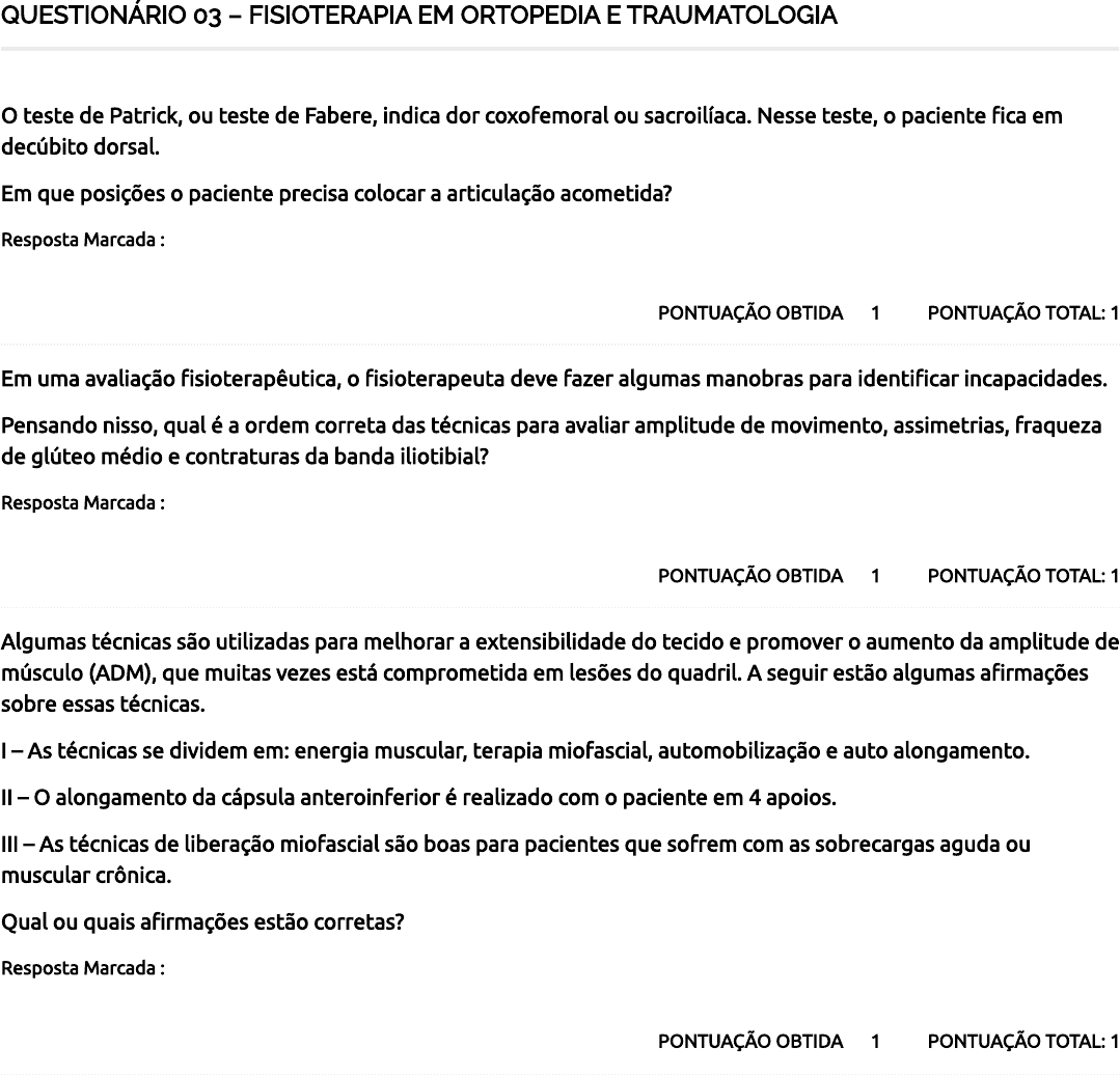 <p>QUESTIONÁRIO 03 – FISIOTERAPIA EM ORTOPEDIA E TRAUMATOLOGIA</p><p>PONTUAÇÃO TOTAL: 1PONTUAÇÃO OBTIDA 1</p><p>O teste de Patrick, ou teste de Fabere, indica dor coxofemoral ou sacroilíaca. Nesse teste, o paciente �ca em</p><p>decúbito dorsal.</p><p>Em que posições o paciente precisa colocar a articula��ão acometida?</p><p>Resposta Marcada :</p><p>Flexão, abdução e rotação externa.</p><p>PONTUAÇÃO TOTAL: 1PONTUAÇÃO OBTIDA 1</p><p>Em uma avaliação �sioterapêutica, o �sioterapeuta deve fazer algumas manobras para identi�car incapacidades.</p><p>Pensando nisso, qual é a ordem correta das técnicas para avaliar amplitude de movimento, assimetrias, fraqueza</p><p>de glúteo médio e contraturas da banda iliotibial?</p><p>Resposta Marcada :</p><p>Goniometria, inspeção, teste de Trendelenburg e teste de Ober.</p><p>PONTUAÇÃO TOTAL: 1PONTUAÇÃO OBTIDA 1</p><p>Algumas técnicas são utilizadas para melhorar a extensibilidade do tecido e promover o aumento da amplitude de</p><p>músculo (ADM), que muitas vezes está comprometida em lesões do quadril. A seguir estão algumas a�rmações</p><p>sobre essas técnicas.</p><p>I – As técnicas se dividem em: energia muscular, terapia miofascial, automobilização e auto alongamento.</p><p>II – O alongamento da cápsula anteroinferior é realizado com o paciente em 4 apoios.</p><p>III – As técnicas de liberação miofascial são boas para pacientes que sofrem com as sobrecargas aguda ou</p><p>muscular crônica.</p><p>Qual ou quais a�rmações estão corretas?</p><p>Resposta Marcada :</p><p>Apenas I e III.</p><p>29/08/2024, 09:31 Course Status – AVA Saúde Unifaveni</p><p>https://ava.saude.unifaveni.com.br/course-status/ 1/2</p><p>4 / 5</p><p>PONTUAÇÃO TOTAL: 1PONTUAÇÃO OBTIDA 0</p><p>O fortalecimento do músculo glúteo médio é, muitas vezes, um importante componente do programa de</p><p>reabilitação do quadril. O glúteo médio pode ser fortalecido por meio de posicionamento em decúbito lateral,</p><p>com a parte superior da perna em leve extensão e com rotação externa do quadril, ou em pé, com o exercício de</p><p>queda pélvica.</p><p>Quais testes podem ser e�cazes para avaliar a força desse músculo?</p><p>Resposta Marcada :</p><p>Teste da bicicleta e teste de Trendelenburg.</p><p>PONTUAÇÃO TOTAL: 1PONTUAÇÃO OBTIDA 1</p><p>Nos casos de ruptura labial acetabular, o tratamento pode ser conservador ou cirúrgico. No caso cirúrgico, a</p><p>�sioterapia é indispensável no pós-operatório. De uma forma global, o tratamento é dividido em 3 fases. Observe</p><p>as abordagens listadas a seguir.</p><p>I – Uso de muletas.</p><p>II – Elevação da perna reta.</p><p>III – Exercício de ponte.</p><p>IV – Exercício de equilíbrio.</p><p>V – Isometria de quadríceps.</p><p>Indique a alternativa com abordagens permitidas na fase 1.</p><p>Resposta Marcada :</p><p>I, III, IV e V.</p><p>Total de Pontos</p><p>29/08/2024, 09:31 Course Status – AVA Saúde Unifaveni</p><p>https://ava.saude.unifaveni.com.br/course-status/ 2/2</p>