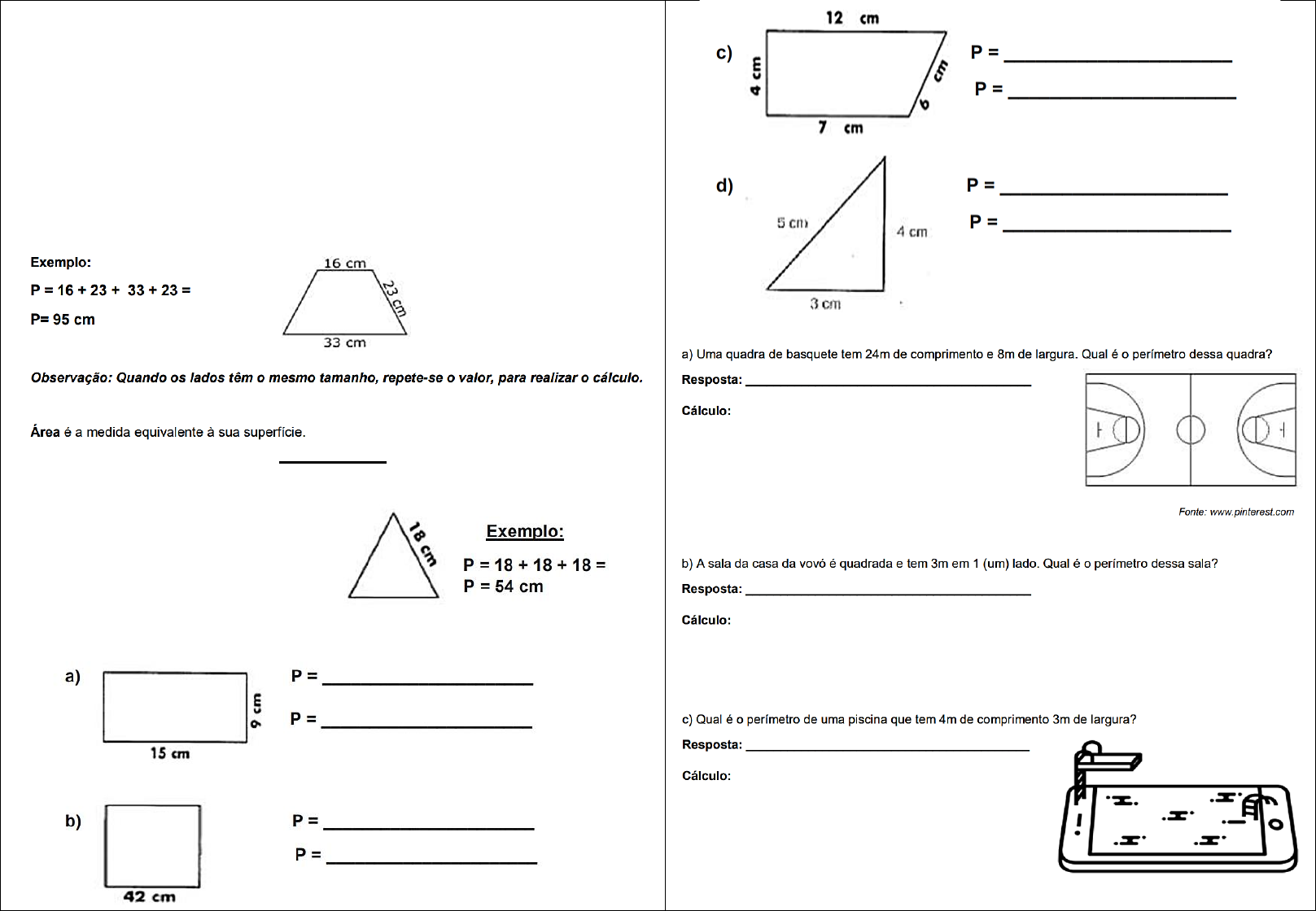 <p>ÁREA E PERÍMETRO</p><p>Na geometria, os conceitos de área e perímetro são utilizados para</p><p>determinar as medidas de alguma figura.</p><p>Vamos recordar?</p><p>► Perímetro é a medida do contorno de uma figura, somando os</p><p>segmentos de retas que formam a figura, chamados de lados ( l ).</p><p>Para calcular, é necessário realizar a soma de todos os lados.</p><p>ATIVIDADES</p><p>1) Calcule o perímetro das figuras abaixo:</p><p>2) Leia as questões atentamente e resolva os problemas:</p>