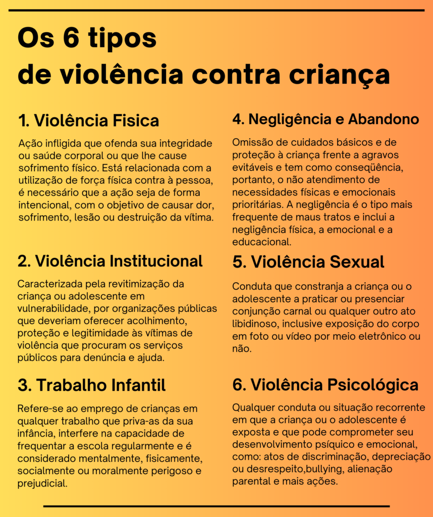 <p>Os 6 tipos de violência contra criança 1. Violência Fisica 4. Negligência e Abandono Ação infligida que ofenda sua integridade Omissão de cuidados básicos e de ou saúde corporal ou que lhe cause proteção à criança frente a agravos sofrimento físico. Está relacionada com a evitáveis e tem como utilização de força física contra à pessoa, portanto, o não atendimento de é necessário que a ação seja de forma necessidades físicas e emocionais intencional, com o objetivo de causar dor, prioritárias. A negligência é o tipo mais sofrimento, lesão ou destruição da vítima. frequente de maus tratos e inclui a negligência física, a emocional e a educacional. 2. Violência Institucional 5. Violência Sexual Caracterizada pela revitimização da Conduta que constranja a criança ou o criança ou adolescente em adolescente a praticar ou presenciar vulnerabilidade, por organizações públicas conjunção carnal ou qualquer outro ato que deveriam oferecer acolhimento, libidinoso, inclusive exposição do corpo proteção e legitimidade às vítimas de em foto ou vídeo por meio eletrônico ou violência que procuram os serviços públicos para denúncia e ajuda. 3. Trabalho Infantil 6. Violência Psicológica Refere-se ao emprego de crianças em Qualquer conduta ou situação recorrente qualquer trabalho que priva-as da sua em que a criança ou o adolescente é infância, interfere na capacidade de exposta e que pode comprometer seu frequentar a escola regularmente e é desenvolvimento psíquico e emocional, considerado mentalmente, fisicamente, como: atos de discriminação, depreciação socialmente ou moralmente perigoso e ou desrespeito,bullying, alienação prejudicial. parental e mais ações.</p>