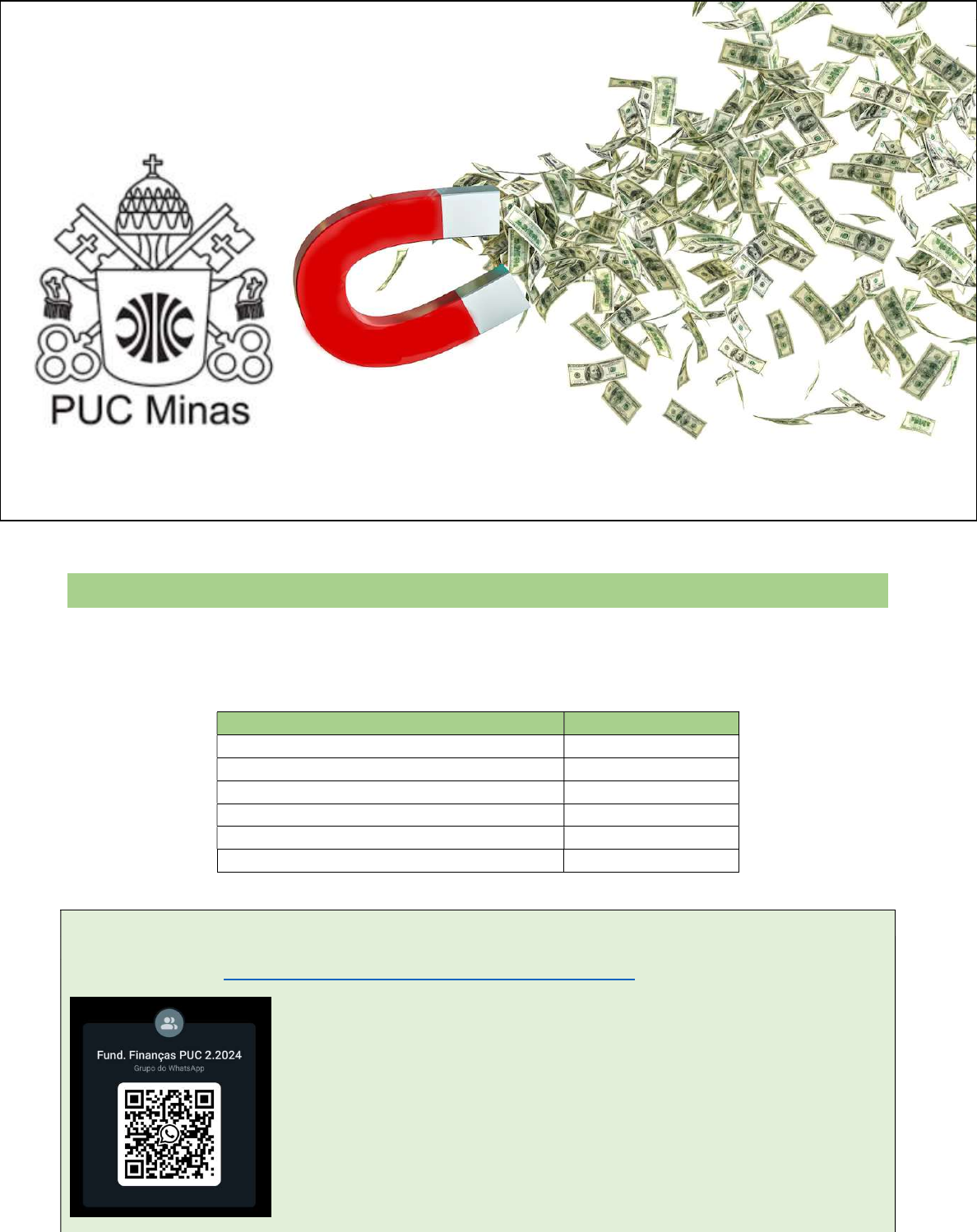 <p>1</p><p>ORGANIZAÇÃO DA DISCIPLINA</p><p>Horários: QUINTA FEIRA 8:50 às 10:30 e SEXTA FEIRA 8:50 às 10:30</p><p>Período Letivo: 2/2024</p><p>Carga Horária: Total: 80 horas</p><p>ATIVIDADES AVALIATIVAS Valor (pontos)</p><p>PROVA 1 - Conteúdo até a data da prova 20</p><p>PROVA 2 - Conteúdo até a data da prova 20</p><p>1 prova final - Todo conteúdo do semestre 30</p><p>Atividades / Exercícios 20</p><p>Trabalho prático 10</p><p>Total 100</p><p>CONTATO COM A PROFESSORA:</p><p>E-mails: paolaflsouza@gmail.com</p><p>Grupo da disciplina: https://chat.whatsapp.com/LVcdxDdoljB12RGVzxxk0Z</p><p>FUNDAMENTOS DE FINANÇAS</p><p>CORPORATIVAS</p><p>PROF.ª Drª Paola Faria Lucas de Souza</p><p>2</p><p>@drapaolasouza</p><p>CRONOGRAMA COMPLETO</p><p>Finanças corporativas</p><p>Aula Quinta e Sexta Conteúdo</p><p>1 Quinta feira 01/08/2024 Introdução - Apresentação - O porquê!</p><p>2 Sexta feira 02/08/2024 Fundamentos básicos - Valor do dinheiro no tempo</p><p>3 Quinta feira 08/08/2024 Valor do dinheiro no tempo: Series de pagamento com carência</p><p>4 Sexta feira 09/08/2024 Capitalização e descapitalização</p><p>Quinta feira 15/08/2024 Feriado</p><p>5 Sexta feira 16/08/2024 Análise de projetos VPL e TIR</p><p>6 Quinta feira 22/08/2024 Análise de projetos Payback e outros indices</p><p>7 Sexta feira 23/08/2024 Escolha de projetos: ativos sem risco e de risco.</p><p>8 Quinta feira 29/08/2024 Orçamento de capital e seleção de projetos: análise de sensibilidade e uso de cenários.</p><p>9 Sexta feira 30/08/2024 Orçamento de capital e seleção de projetos: análise de sensibilidade e uso de cenários.</p><p>10 Quinta feira 05/09/2024 Mercado de capitais e seleção de ativos de risco</p><p>11 Sexta feira 06/09/2024 Mercado de capitais e seleção de ativos de risco</p><p>12 Quinta feira 12/09/2024 Revisão - Atividade</p><p>13 Sexta feira 13/09/2024 Prova parcial 1</p><p>14 Quinta feira 19/09/2024 Diversificação de ativos e carteiras eficientes</p><p>15 Sexta feira 20/09/2024 Diversificação de ativos e carteiras eficientes</p><p>16 Quinta feira 26/09/2024 Diversificação de ativos e carteiras eficientes</p><p>17 Sexta feira 27/09/2024 Seleção ótima de carteiras</p><p>18 Quinta feira 03/10/2024 Seleção ótima de carteiras</p><p>19 Sexta feira 04/10/2024 Modelos de precificação de ativos</p><p>20 Quinta feira 10/10/2024 Modelos de precificação de ativos</p><p>21 Sexta feira 11/10/2024 Modelos de precificação de ativos</p><p>22 Quinta feira 17/10/2024 A estrutura de capital e o valor da empresa</p><p>23 Sexta feira 18/10/2024 A estrutura de capital e o valor da empresa</p><p>24 Quinta feira 24/10/2024 A estrutura de capital e o valor da empresa</p><p>25 Sexta feira 25/10/2024 A estrutura de capital e o valor da empresa</p><p>26 Quinta feira 31/10/2024 Revisão - Atividade</p><p>27 Sexta feira 01/11/2024 Prova Parcial 2</p><p>28 Quinta feira 07/11/2024 Estrutura de Capital e valor</p><p>29 Sexta feira 08/11/2024 Dívida - alavancagem</p><p>30 Quinta feira 14/11/2024 Prova substitutiva</p><p>Sexta feira 15/11/2024 Feriado</p><p>31 Quinta feira 21/11/2024 Dívida - Custo de agencia</p><p>32 Sexta feira 22/11/2024 Dividendos x recompra de ações e estratégias financeiras</p><p>33 Quinta feira 28/11/2024 Dividendos x recompra de ações e estratégias financeiras</p><p>34 Sexta feira 29/11/2024 Métricas: índices</p><p>35 Quinta feira 05/12/2024 Métricas: índices</p><p>36 Sexta feira 06/12/2024 Métricas: índices</p><p>37 Quinta feira 12/12/2024 Revisão - Atividade</p><p>38 Sexta feira 13/12/2024 Prova global</p><p>39 Quinta feira 19/12/2024 Especial</p><p>40 Sexta feira 20/12/2024 Finalização do semestre</p><p>3</p><p>EMENTA</p><p>Fundamentos básicos. Escolha de projetos: a vos sem risco e de risco. Valor do dinheiro no tempo: capitalização e</p><p>descapitalização. Orçamento de capital e seleção de projetos: análise de sensibilidade e uso de cenários. O Mercado de</p><p>Capitais e a seleção de a vos de risco. Diversificação de a vos e carteiras eficientes. Seleção ó ma de carteiras:</p><p>maximização dos retornos e minimização de riscos. Modelos de precificação de a vos. A estrutura de capital e o valor da</p><p>empresa. Financiamento de projetos com capital próprio e dívida. Limites ao uso de dívidas: custo de dificuldades</p><p>financeiras e custo de agência. Dividendos versus recompra de ações e estratégias financeiras. Métricas e indicadores</p><p>de eficiência: a vos financeiros, desempenho econômico, eficiência operacional, custos, índices de inflação interna e</p><p>compe vidade.</p><p>BIBLIOGRAFIA</p><p>BIBLIOGRAFIA BÁSICA</p><p>ASSAF NETO, Alexandre. Finanças corpora vas e valor. 7. ed. São Paulo: Atlas, 2014. E-book. ISBN</p><p>9788522490912.</p><p>ROSS, Stephen, WESTERFIELD, Randolph W., JAFFE, Jeffrey, LAMB, Roberto. Adiministração financeira. Versão</p><p>brasileira de Corporate Finance. Porto Alegre: AMGH, 2015.</p><p>BIBLIOGRAFIA COMPLEMENTAR</p><p>ASSAF NETO, Alexandre. Mercado financeiro. 2020.</p><p>DAMODARAN, Aswath. Finanças corporativas aplicadas.</p><p>OBSERVAÇÕES FINAIS:</p><p>1) Sobre Avaliações e exercícios</p><p>Prova 1 e 2 – Conteúdo parcial até dia da prova.</p><p>Prova final – Todo o conteúdo do semestre.</p><p>➢ O que é a prova subs tu va?</p><p>Subs tui no caso de perda da prova 1 ou da prova 2 a nota da mesma. Será cobrado todo o conteúdo</p><p>do semestre. Não é o exame especial!</p><p>➢ Exercícios não são repe dos. Não entregar na data especificada implica em nota zero.</p><p>Condições para realização do exame especial: Ter entre 30 e 59 pontos</p><p>2) CHAMADA – Feita todas as aulas</p><p>3) CONVERSAS PARALELAS – Cuidado com o respeito ao colega.</p><p>4) USO DO CELULAR EM SALA – evitar uso que atrapalhe o rendimento. U lização para fins acadêmicos.</p><p>4</p><p>FINANÇAS CORPORATIVAS OBJETIVO PRINCIPAL = maximização de seu valor de merca