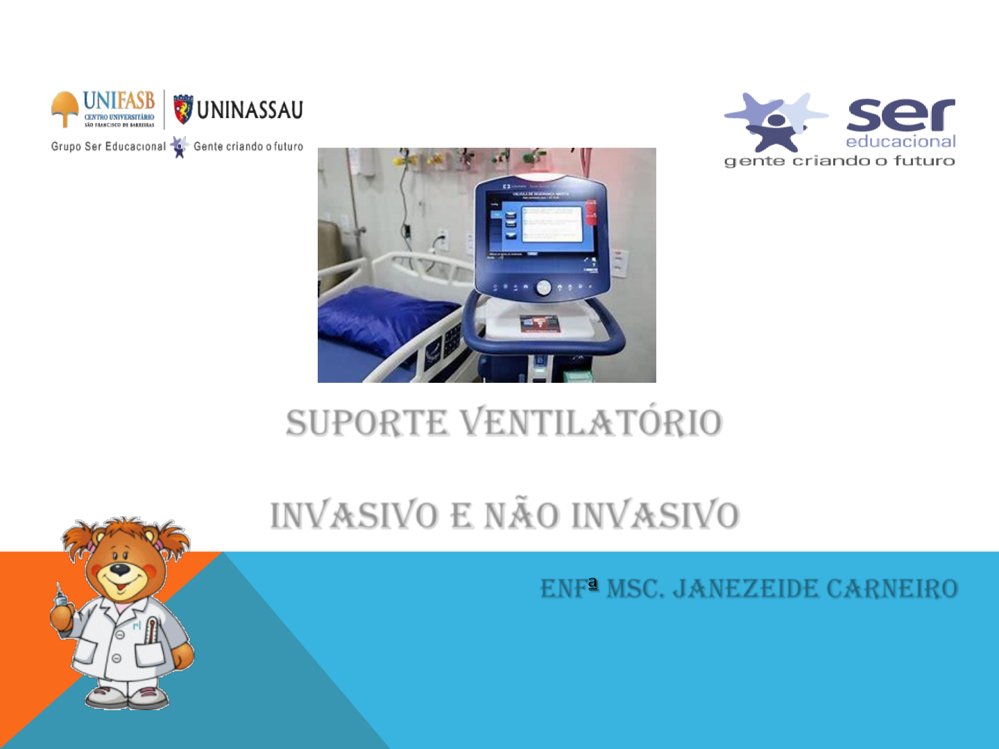 <p>SUPORTE VENTILATÓRIO</p><p>InvasivO E NÃO INVASIVO</p><p>Enfª MSC. Janezeide carneiro</p><p>FATORES QUE INTERFEREM NA VENTILAÇÃO</p><p>MECÂNICA</p><p>Relacionado ao paciente Relacionado aos acessórios</p><p>ventilatórios</p><p>1. Complacência pulmonar = Volume/pressão 1. Tubo endotraqueal</p><p>- A cânula endotraqueal é um fator que aumenta a</p><p>Rva.</p><p>- Depende do tamanho e comprimento do tubo.</p><p>- As cânula mais finas oferecem maior resistência.</p><p>Ex: TQT menos RVa</p><p>2. Resistência da vias aéreas = Dificuldade da</p><p>passagem do gás pelo interior do tubo</p><p>- Resistência=pressão/fluxo</p><p>3. Constante de tempo: Expressa quão rapidamente</p><p>as unidades pulmonares reagem a um alteração de</p><p>pressão, fornecendo uma indicação da velocidade</p><p>de enchimento e esvaziamento dessas unidades.</p><p>- Constante de tempo = Resistência x complacência</p><p>( em segundos)</p><p>2. Circuitos ventilatórios</p><p>- Tubulações: Aumenta a resistência se tubulação</p><p>grande/circuitos intermediários de material</p><p>menos distensível/água no interior.</p><p>- Ventilador</p><p>- Os umidificadores de ar podem reduzir o volume</p><p>corrente</p><p>4. Trabalho respiratório: Refere-se o trabalho para</p><p>movimentar a parede torácica e os pulmões:</p><p>1. As forças elásticas.</p><p>2. As forças não elásticas.</p><p>Ventilação Mecânica</p><p>Não Invasiva</p><p>.</p><p>Hipercapnia ou Hipoxemia</p><p>Agudização do DPOC</p><p>Asma</p><p>Doenças Neuromusculares</p><p>Pós-extubação / Retirada de Ventilação</p><p>Mecânica</p><p>Edema Agudo de Pulmão</p><p>SARA</p><p>Pneumonia</p><p>Pós-operatório</p><p>Durante broncoscopia</p><p>INDICAÇÕES DA VNI</p><p>OBJETIVOS: Prevenir a fadiga muscular e/ou uma parada respiratória....etc</p><p>AS CONTRAINDICAÇÕES DA VNI PODEM SER</p><p>DIVIDIDAS ENTRE ABSOLUTAS E RELATIVAS</p><p>Ventilação Mecânica</p><p>A ventilação mecânica deve ser utilizada de forma</p><p>adequada e segura, pois intervenções erradas podem</p><p>ser deletérias aos pacientes críticos (RODRIGUES et</p><p>al., 2012; MELO et al., 2014).</p><p>A principal função da ventilação mecânica (VM) é fornecer suporte</p><p>para respiração durante o tratamento do processo subjacente que</p><p>causou insuficiência respiratória. A movimentação dos gases durante</p><p>a ventilação pulmonar vai depender das forças desenvolvidas pelos</p><p>músculos respiratórios e das propriedades mecânicas do sistema</p><p>respiratório.</p><p>INDICAÇÕES DA VENTILAÇÃO MECÂNICA VM</p><p>NÃO EXISTEM CRITÉRIOS UNIFORMES NA LITERATURA QUE</p><p>DETERMINAM A NECESSIDADE DE INTUBAÇÃO OROTRAQUEAL E INÍCIO</p><p>DE VM INVASIVA. ESSA DECISÃO DEPENDE DE DIFERENTES FATORES:</p><p>-Incapacidade de manutenção de oxigenação adequada (SatO2 ></p><p>90%) a despeito de máxima oxigenioterapia suplementar;</p><p>-Ventilação espontânea inadequada e/ou esforço respiratório muito</p><p>aumentado a despeito de suporte ventilatório não invasivo;</p><p>-Incapacidade de proteção de vias aéreas devido a rebaixamento do</p><p>nível de consciência (Escala de Coma de Glasgow <= 8 utilizada</p><p>geralmente como critério; também pode ser verificada ausência do reflexo</p><p>de tosse).</p><p>QUAIS AS INDICAÇÕES DA VM???</p><p>Oxigenação e ventilação seguras podem ser</p><p>realizadas em um modo de ventilação por volume</p><p>ou pressão. O modo escolhido geralmente é</p><p>baseado na preferência do médico assistente. É</p><p>improvável que os resultados dos pacientes sejam</p><p>alterados pelo modo de ventilação.</p><p>‘</p><p>VENTILADORES MECÂNICOS:</p><p>Atenção:</p><p>• •População de pacientes será aplicado o suporte ventilatório</p><p>(população adulta, pediátrica, neonatal)?</p><p>• •Quais são as situações clínicas mais prevalentes nessa UTI?</p><p>• •Com que frequência são internados pacientes com elevada dificuldade</p><p>ventilatória (Ex. SDRA, doenças obstrutivas graves, fístulas</p><p>pulmonares, obesos mórbidos, etc.)?</p><p>• A unidade possui protocolos de conduta específicos para diferentes</p><p>situações clínicas? Há a necessidade de respiradores que possibilitem</p><p>a aplicação de altas pressões nas vias aéreas? Há a necessidade de</p><p>liberar drogas através de nebulizadores do equipamento?</p><p>• •Quais informações (dados de monitoração) o ventilador pode fornecer</p><p>que auxiliam nas decisões de ventilação na UTI?</p><p>• •Como realizar o desmame da ventilação mecânica dos pacientes? Qual</p><p>modo ventilatório, quais índices fisiológicos precisam ser</p><p>monitorados?</p><p>• •Com que frequência e em que situações a ventilação não-invasiva será</p><p>utilizada?</p><p>VENTILADORES MECÂNICOS:</p><p>Características particulares dos diferentes ventiladores:</p><p>1) Modos ventilatórios;</p><p>2) Possibilidade de utilizar o equipamento na ventilação não invasiva;</p><p>3) Características de segurança ex. Alarmes, detectar apnéia, fonte de gás</p><p>remanescente, bateria por 30 min.......etc</p><p>4) Monitoração básica (medida da pressão de pico inspiratório, pressão</p><p>expiratória e pressão de platô, freqüência respiratória e volume corrente</p><p>inspirado). Alguns ventiladores além da monitoração básica oferecem mais</p><p>detalhes da ventilação como: volume corrente expirado (permitindo</p><p>detectar perdas), volume minuto inspirado e expirado, tempo inspiratório,</p><p>relação TI:TE, fluxo inspirado e expirado e concentração de O2 real</p><p>fornecida, além da temperatura do gás no ramo inspiratório.</p><p>ENTENDENDO A DINÂMICA VENTILATÓRIA DO VM</p><p>A ventilação mecânica é feita através do uso de pressão positiva nas vias aéreas, e</p><p>envolve 4 fases:</p><p>1. Fase Inspiratória - O ventilador insufla os pulmões do doente, "vencendo" a 