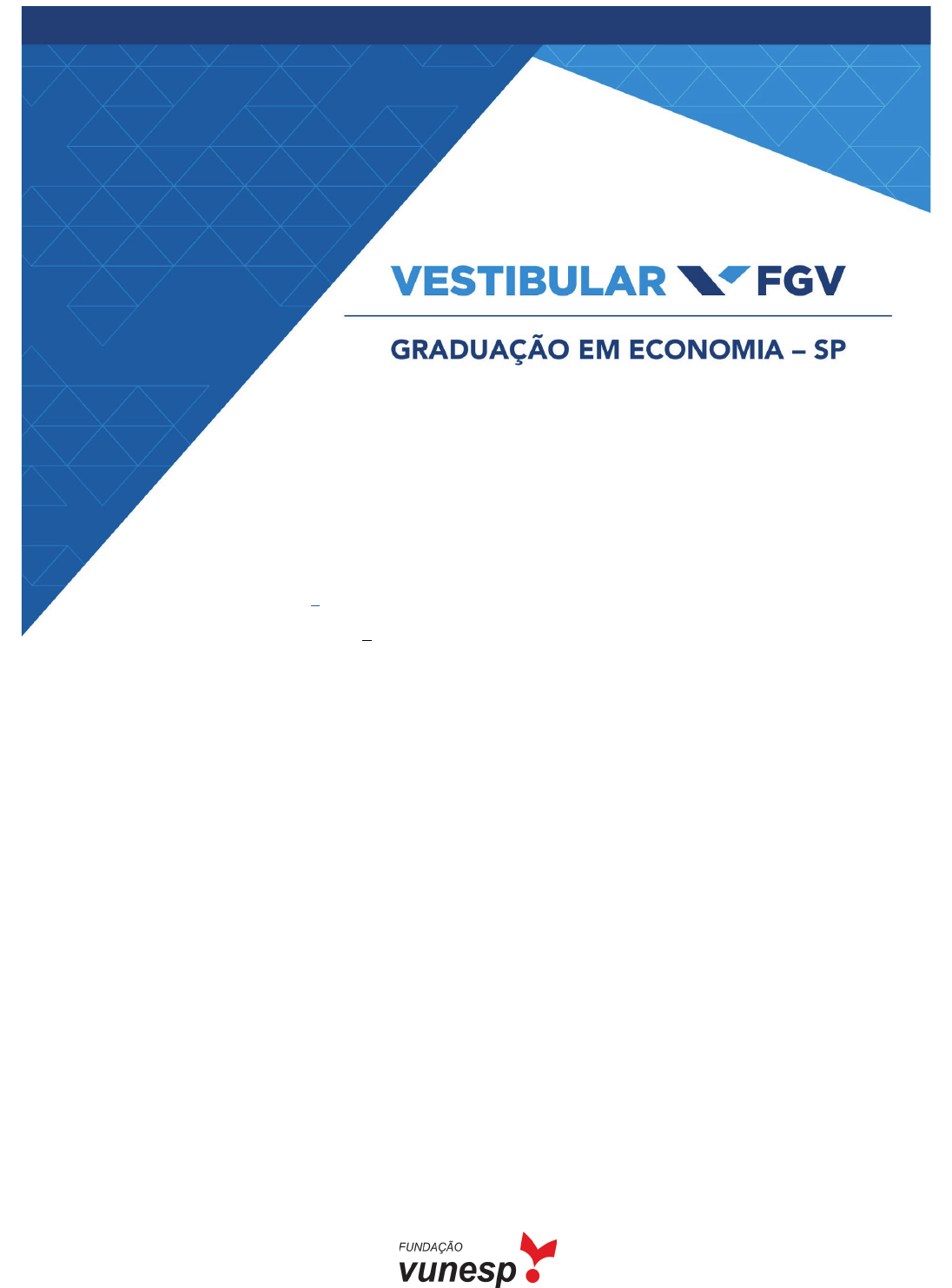 <p>1a FASE | PROCESSO SELETIVO</p><p>1o SEMESTRE DE 2021</p><p>001. PROVAS DE MATEMÁTICA,</p><p>BIOLOGIA, GEOGRAFIA E HISTÓRIA</p><p>22.11.2020 | manhã</p><p>FGVS2001 • Prova 001 • 1ª Fase Página 2</p><p>FGVS2001 • Prova 001 • 1ª Fase Página 3</p><p>BLOCO 1</p><p>MATEMÁTICA</p><p>01. A tabela indica as vendas de veículos, por categoria, de uma concessionária nos três primeiros</p><p>meses de um ano, com a omissão de apenas dois valores, indicados por x e y.</p><p>Considerando as três categorias de veículos, a porcentagem de veículos Flex vendidos em</p><p>fevereiro foi de</p><p>o 68,75%.</p><p>o 62,50%.</p><p>o 56,25%.</p><p>o 43,75%.</p><p>o 37,50%.</p><p>02. Em relação à expressão algébrica , sua condição de existência no universo dos</p><p>números reais e sua simplificação máxima são, respectivamente,</p><p>o</p><p>o</p><p>o</p><p>o</p><p>o</p><p>FGVS2001 • Prova 001 • 1ª Fase Página 4</p><p>03. Um imposto progressivo sobre a renda anual do trabalhador será aplicado de acordo com a tabela:</p><p>Sérgio possui carteira assinada e recebe mensalmente R$ 7.000,00, sendo esta sua única renda.</p><p>Considerando que a renda anual de Sérgio inclui a parcela do 13º salário que recebe, o valor total</p><p>do imposto progressivo que terá que pagar sobre sua renda anual será de</p><p>o R$ 16.500,00.</p><p>o R$ 18.600,00.</p><p>o R$ 22.200,00.</p><p>o R$ 27.300,00.</p><p>o R$ 34.500,00.</p><p>04. Fátima usou suas economias para comprar dólares, gastando R$ 46.400,00. Se Fátima tivesse feito</p><p>a compra um ano atrás, com o mesmo montante, em reais, ela teria comprado US$ 1.280,00 a mais,</p><p>já que o preço de compra do dólar era R$ 0,80 menor. Desconsiderando-se taxas e impostos, a</p><p>cotação de compra de um dólar, em reais, quando Fátima fez o investimento era um número</p><p>pertencente ao intervalo de números reais dado por</p><p>o [5,70; 5,74[</p><p>o [5,74; 5,78[</p><p>o [5,78; 5,82[</p><p>o [5,82; 5,86]</p><p>o [5,86; 5,90]</p><p>FGVS2001 • Prova 001 • 1ª Fase Página 5</p><p>05. Considere a função polinomial f(x) = (1 – 2k)x + 3k + 1, em que k é um número real. Sorteando-</p><p>se aleatoriamente o valor de k do conjunto , a</p><p>probabilidade de que a função f(x) seja estritamente crescente e seu gráfico intersecte o eixo y</p><p>em um valor maior ou igual a 2 é de</p><p>o</p><p>o</p><p>o</p><p>o</p><p>o</p><p>06. Um conjunto é composto por sete números naturais, repetidos ou não, cuja ordenação é dada</p><p>por a1 ≤ a2 ≤ a3 ≤ a4 ≤ a5 ≤ a6 ≤ a7. O maior dos números é igual a 18 e o menor é igual a 3. A</p><p>única moda desse conjunto coincide com o valor da mediana, que é igual a 5. Se a média</p><p>aritmética dos sete números é igual a 9, o total de possibilidades distintas para a quádrupla</p><p>ordenada (a2, a3, a5, a6) é igual a</p><p>o 6.</p><p>o 7.</p><p>o 8.</p><p>o 9.</p><p>o 10.</p><p>FGVS2001 • Prova 001 • 1ª Fase Página 6</p><p>07. Observe a figura construída em uma malha quadriculada com unidade de área igual a 1 cm².</p><p>A área da região destacada em cinza na figura é igual a</p><p>o 18 cm².</p><p>o 19 cm².</p><p>o 21 cm².</p><p>o 24 cm².</p><p>o 28 cm².</p><p>08. Observe a figura com a representação gráfica de uma função constante e de uma função</p><p>trigonométrica, ambas definidas para todos os números reais.</p><p>Sendo P e Q os pontos de intersecção dos gráficos das funções indicadas na figura, a medida</p><p>de , em unidades de comprimento do plano cartesiano, é igual a</p><p>o</p><p>o</p><p>o</p><p>o</p><p>o</p><p>FGVS2001 • Prova 001 • 1ª Fase Página 7</p><p>09. Em 8 horas diárias de trabalho, 20 caminhões carregam 160 m³ de terra em 15 dias. Se o</p><p>empreiteiro da obra deseja aumentar a frota em 4 caminhões para realizar o mesmo serviço em</p><p>6 dias, o número diário de horas que os caminhões terão que trabalhar para cumprir o novo</p><p>prazo é de</p><p>o 16 horas e 40 minutos.</p><p>o 16 horas e 33 minutos.</p><p>o 15 horas e 50 minutos.</p><p>o 15 horas e 45 minutos.</p><p>o 15 horas e 30 minutos.</p><p>10. Os lados do paralelogramo FGVE medem 5 e 8 centímetros. As mediatrizes de e ,</p><p>indicadas por m e n, intersectam-se no ponto C, que é centro da circunferência λ, de raio</p><p>CE = CF, como mostra a figura.</p><p>Sabendo que a mediatriz m passa pelo vértice F, a área do triângulo FEC é igual a</p><p>o</p><p>o</p><p>o</p><p>o</p><p>o</p><p>FGVS2001 • Prova 001 • 1ª Fase Página 8</p><p>11. O maior valor que pode ser assumido pela função real definida por é</p><p>o</p><p>o</p><p>o</p><p>o</p><p>o</p><p>12. No plano cartesiano, os gráficos das funções reais definidas por f(x) = log(2x + 12) e</p><p>g(x) = log100 (x + 6) intersectam-se em</p><p>o um único ponto, cuja abscissa é um número racional não inteiro.</p><p>o um único ponto, cuja abscissa é um número inteiro.</p><p>o um único ponto, cuja abscissa é um número irracional.</p><p>o dois pontos, ambos de abscissa racional.</p><p>o dois pontos, sendo um de abscissa racional e outro de abscissa irracional.</p><p>FGVS2001 • Prova 001 • 1ª Fase Página 9</p><p>13. As retas r e s são secantes à circunferência λ, de equação (x – 3)2 + (y – 1)2 = 13, nos pontos</p><p>P, Q e T, sendo que em P elas se intersectam formando um ângulo de 30°, como mostra a</p><p>figura.</p><p>Sendo C o centro de λ, a área do setor circular destacado em cinza na figura, em unidades de</p><p>área do sistema cartesiano de eixos ortogonais, é igual a</p><p>o</p><p>o</p><p>o</p><p>o</p><p>o</p><p>FGVS2001 • Prova 001 • 1ª Fase Página 10</p><p>14. A figura indica a planificação de dois dados cúbicos e honestos utilizados em um jogo.</p><p>Na sua jogada, um jogador lança aleatoriamente o dado A e, em seguida, o dado B. Após os</p><p>lançamentos, ele precisa escolher um resultado entre duas opções:</p><p>I. somar o