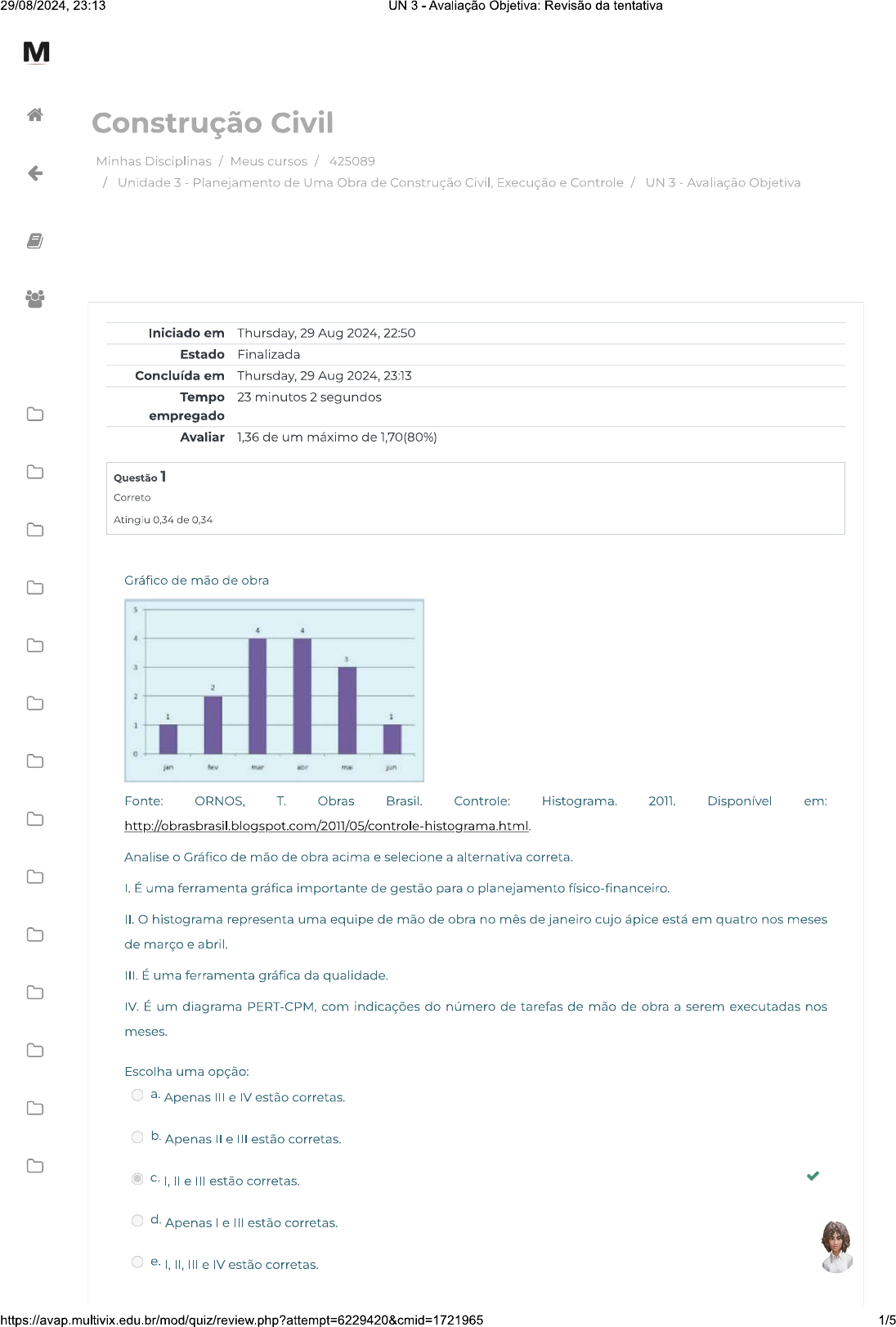<p>29/08/2024, 23:13 UN 3 - Avaliação Objetiva: Revisão da tentativa M Construção Civil Minhas Disciplinas / Meus cursos / 425089 / Unidade 3 - Planejamento de Uma Obra de Construção Civil, Execução e Controle / UN 3 Avaliação Objetiva Iniciado em Thursday, 29 Aug 2024, 22:50 Estado Finalizada Concluída em Thursday, 29 Aug 2024, 23:13 Tempo 23 minutos 2 segundos empregado Avaliar 1,36 de um máximo de 1,70(80%) Questão 1 Correto Atingiu 0,34 de 0,34 Gráfico de mão de obra 4 4 4 3 3 2 2 1 1 jan jun Fonte: ORNOS, T. Obras Brasil. Controle: Histograma. 2011. Disponível em: http://obrasbrasil.blogspot.com/2011/05/controle-histograma.html Analise Gráfico de mão de obra acima e selecione a alternativa correta. I. É uma ferramenta gráfica importante de gestão para planejamento físico-financeiro. II. histograma representa uma equipe de mão de obra no mês de janeiro cujo ápice está em quatro nos meses de março e abril. III. É uma ferramenta gráfica da qualidade. IV. É um diagrama PERT-CPM, com indicações do número de tarefas de mão de obra a serem executadas nos meses. Escolha uma opção: a. Apenas III e IV estão corretas. b. Apenas e III estão corretas. C. I, e III estão corretas. d. Apenas e III estão corretas. e. I, II, III e IV estão corretas. 1/5</p><p>29/08/2024, 23:13 UN 3 - Avaliação Objetiva: Revisão da tentativa Questão 2 M Incorreto Atingiu 0,00 de 0,34 E 5 4 B J A 4 D 2 4 10 K 12 1 6 2 1 LEGENDA A PREPARO DO LOCAL G INSTALAÇÕES ELÉTRICAS B FUNDAÇÕES H INSTALAÇÕES C ALVENARIA CARPINTARIA Atividade ESGOTOS PINTURA INTERNA Duração E TELHADO PINTURA EXTERNA PISO LIMPEZA Representação de ume atividade fantasma DIAGRAMA DE REDE REPRESENTAÇÃO Fonte: R. Diagrama de precedência: saiba para que serve no gerenciamento de projetos. Gerenciamento de projetos, jan. 2020. Disponível em: https://robsoncamargo.com.br/blog/Diagrama-de- precedencia. Acesso em: 31 mar. 2023. Analise o gráfico acima e selecione a alternativa correta. I. É um diagrama PERT-CPM de gestão para o planejamento físico-financeiro. II. É um histograma de mão de obra e equipe fantasma. III. É um histograma representando as atividades preliminares da obra. IV. É um diagrama PERT-CPM, representando as atividades de uma obra. Escolha uma opção: a. e IV estão corretas. b. III e IV estão corretas. x C. e III estão corretas. d. I, II, III e IV estão corretas. e. e II estão corretas. 2/5</p><p>29/08/2024, 23:13 UN 3 Avaliação Objetiva: Revisão da tentativa Questão 3 M Correto Atingiu 0,34 de CHUVAS EM NOVEMBRO 100% 80% 60% 40% 68% 86% 49% 20% 28% 32% 3% 0% -24% -3 -20% -52% -40% -60% Região Norte Região Nordeste Região Centro-Oeste Região Sudeste R 2020 2021 Fonte: BRASIL. Ministério da Agricultura e Instituo Nacional de Meteorologia. Comparativo de chuvas em novembro 2020 e 2021 no Brasil. Brasília, DF: 10 dez. 2021. Disponível em: Acesso em: 31 mar. 2023. Observando o gráfico acima, relativo ao clima (porcentagem de chuvas) nas regiões do Brasil, é possível afirmar que: I. no total, 2021 foi um ano mais castigado pelas chuvas que 2020. II. a Região Nordeste, em 2020, foi prejudicada nas obras e, em 2021, ficou preocupante setor pelo excesso de chuvas. III. a Região Sul, em 2021, entrou em estado preocupante, com chuvas ficando muito acima da previsão de 0%. IV. a Região Centro-Oeste teve a maior variação entre os anos, chegando a 84%. Selecione a alternativa correta. Escolha uma opção: a. I, e IV estão corretas. b. I. II, III e IV estão corretas. C. I, e IV estão corretas. d. I, e III estão corretas. e. Apenas e estão corretas. 3/5</p><p>29/08/2024, 23:13 UN 3 Avaliação Objetiva: Revisão da tentativa Questão 4 M Correto Atingiu 0,34 de 0,34 Um dos mais importantes controles na execução de um empreendimento da construção civil é o Relatório Diário de Obras (RDO), que reúne as informações temporizadas dos serviços, suas interfaces, dificuldades e condições climáticas, quando da execução dos serviços. Este documento deve ser preenchido com cópias para a direção central da empresa, para a fiscalização e para controle local. Fonte: QUALHARINI, E. Canteiro de Obras. Rio de Janeiro: Elsevier, 2018. (Coleção Construção Civil na Prática) Sobre o RDO, analise as asserções a seguir e assinale a alternativa correta. I. RDO deve ser realizado todos os dias, sob responsabilidade do engenheiro, do técnico, do gerente da obra, do auxiliar administrativo ou do estagiário, sempre sob aprovação do profissional habilitado responsável. II. RDO é regulamentado pela Resolução n. 1.024, de 21 de agosto de 2009, que dispõe sobre a obrigatoriedade de adoção do Livro de Ordem de obras e serviços de engenharia, arquitetura, agronomia, geografia, geologia, meteorologia e demais profissões vinculadas ao Sistema CONFEA. III. RDO também pode ser digital, em que as informações da obra são colocadas em um aplicativo para acompanhar desde planejamento e a execução até o controle de gastos, mantendo um histórico e apresentando uma visão real da evolução da obra. Fica disponível para todos poderem analisar, inclusive a fiscalização. Escolha uma opção: a. I, e III estão corretas. b. Apenas e III estão corretas. C. Apenas e III estão corretas. d. Apenas e II estão corretas. e. Apenas está correta. 4/5</p><p>29/08/2024 23:13 UN 3 - Avaliação Objetiva: Revisão da tentativa Questão 5 M Correto Atingiu 0,34 de 0,34 A caracterização e a classificação dos resíduos de construção civil são necessárias para estudar as alternativas de sua gestão e reciclagem, sendo os resíduos gerados na construção civil considerados entulhos. entulho é um resíduo heterogêneo, mas que pode ser reciclado em sua maioria, composto por: 1. blocos, tijolos e cerâmicas, concretos, argamassas e rochas - podem ser triturados e reciclados para utilização como matéria-prima na produção de cimentos e argamassas; 2. arei