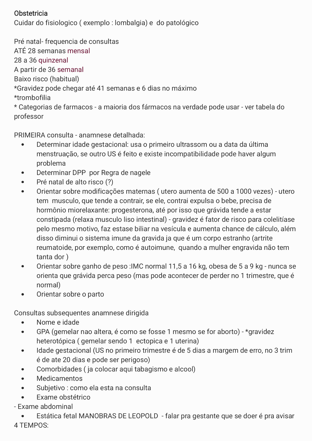 <p>Obstetricia Cuidar do fisiologico ( exemplo : lombalgia) e do patológico Pré natal- frequencia de consultas ATÉ 28 semanas mensal 28 a 36 quinzenal A partir de 36 semanal Baixo risco (habitual) *Gravidez pode chegar até 41 semanas e 6 dias no máximo *trombofilia * Categorias de farmacos a maioria dos fármacos na verdade pode usar ver tabela do professor PRIMEIRA consulta anamnese detalhada: Determinar idade gestacional: usa o primeiro ultrassom ou a data da última menstruação, se outro US é feito e existe incompatibilidade pode haver algum problema Determinar DPP por Regra de nagele Pré natal de alto risco (?) Orientar sobre modificações maternas ( utero aumenta de 500 a 1000 vezes) utero tem musculo, que tende a contrair, se ele, contrai expulsa o bebe, precisa de hormônio miorelaxante: progesterona, até por isso que grávida tende a estar constipada (relaxa musculo liso intestinal) gravidez é fator de risco para colelitíase pelo mesmo motivo, faz estase biliar na vesícula e aumenta chance de cálculo, além disso diminui o sistema imune da gravida ja que é um corpo estranho (artrite reumatoide, por exemplo, como é autoimune, quando a mulher engravida não tem tanta dor ) Orientar sobre ganho de peso :IMC normal 11,5 a 16 kg, obesa de 5 a 9 kg nunca se orienta que grávida perca peso (mas pode acontecer de perder no 1 trimestre, que é normal) Orientar sobre o parto Consultas subsequentes anamnese dirigida Nome e idade GPA (gemelar nao altera, é como se fosse 1 mesmo se for aborto) *gravidez heterotópica ( gemelar sendo 1 ectopica e 1 uterina) Idade gestacional (US no primeiro trimestre é de 5 dias a margem de erro, no 3 trim é de ate 20 dias e pode ser perigoso) Comorbidades ( ja colocar aqui tabagismo e alcool) Medicamentos Subjetivo : como ela esta na consulta Exame obstétrico Exame abdominal Estática fetal MANOBRAS DE LEOPOLD falar pra gestante que se doer é pra avisar 4 TEMPOS:</p><p>1 - palpaçao do fundo uterino 2- palpa dos dois lados, pnde estiver afundando mais sao os bracos e o iutro o dkrwo 3- prender a mao na cabeca do bebe e ver se é movel ou se esta encaixado 4- nao se faz na pratica porque é agressivo Altura uterina (AU) (da sinfise pubica até ?) cada semana corresponde a 1cm, a tolerancia é de 3 cm pra mais ou pra menos (Na gravidez o utero é intrapelvico, com 12 semanas ele sai da pelve e ai pode-se auscultar com o sonar) (com 20 semanas ele atinge a cicatriz umbilical- a partir daqui pode sentir movimentos fetais ) Ausculta fetal (BCF) Movimentos fetais (20 semanas) Exame especular: somente se tiver alguma queixa, se necessario *candidiase, vaginite bacteriana ( odor peixe), gonorreia (cervicite) Toque vaginal (quando ?) MMII 80% tem edema, principalmente no 3 trimestre, ja que o útero comprime a veia cava Varizes (em MMII ou vulvar que não é comum mas é normal, precisa cuidsr na horado parto para nao causar hemorragia um pouco maior) Exames complementares * as vezes pedem citomegalovirus mas nao muda a conduta porque nao tem tratamentom entao nao teria por que pedir, rubeola tambem 1 trim (10 exames) Tipagem sanguinea e Rh (eritroblastose fetal) Hemograma (volume sanguineo da gravidaba aumenta em 50%, e hemacias em 30%, dessa forma ocorre anemia dilucional normalmente, se tiver cardiopatia pode ter que interromper a gravidez, se tiver anemia tem que tratar porque pode causar parto prematuro) Glicemia jejum até 92 ( o feto só usa glicose lactogenio placentario dificulta a acao sa insulina a gravida esta jormalmente em um estado diabetogenico) se for maior ou igual a 126 é DM previ Urina 1 + urocultura HIV SIFILIS TOXOPLASMOSE HEPATITE B E C 2 trim Coombs indireto (se ela for Rh neg) TOTG se glicemia menor que 92 no 1trim Toxoplasmose se ela nao for imune</p><p>3 trim Repete o primeiro trim sem ser a tipagem 36 a 38 semanas Swab vaginal e retal GBS(streptococus agalacticae principal causa de sepse neonatal precoce) - se positivo, faz profilaxia intraparto antibiotico Ultrassonografia obstetrica 1 trim: US transvaginal porque ainda é intrapelvico 11 a 14 semanas - translucencia nucal: normal se menor que 2,5 mm, se for maior tem risco de anomalia cromossômica (comum em Sd. de Down) morfológico 20 a 24 semanas perfil biofisico fetal respiracao, tonus e movimento) Doppler Vacinas Recomendadas - se estiver de eswuema completo nao precisa) - Influenza (sazonal, lembrando que e grupo de risco) - hepatite B (3 doses) -tetano dT (3 doses + reforco) -Coqueluche dTpa ( lembrar que aqui ja tem a dT), tomar 1 dose em toda gravidez a partir de 20 semanas, nao importa se vai "sobrar" a vacina no tétano - COVID 19 (sem ser virus atenuado) - febre amarela só se em area endemica ? Contraindicadas Vírus atenuado Suplemenros e vitaminas Acido folico Prevencao de defeito no tubo neural Ideal: iniciar 3 meses antes de engravidar Dose 0,4 mg por dia Uso de anticonvulsivante ou filho anterior acometido dose 10x maior Metilfolato se tiver condicoes Ferro Dose 40ma 60mg ferro elementar ao dja Anemia patologica dose 3x maior</p>