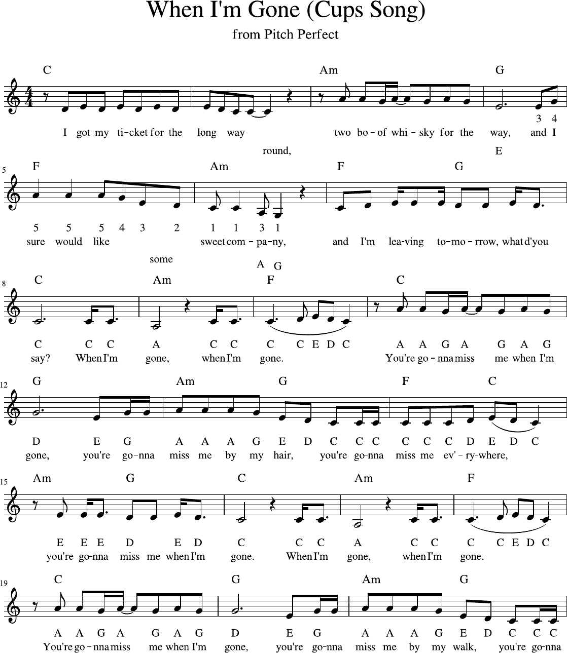 <p>When I'm Gone (Cups Song) from Pitch Perfect C Am G 3 4 I got my ti-cket for the long way two bo - of whi - sky for the way, and I round, E 5 F Am F G 5 5 5 4 3 2 1 1 3 1 sure would like sweetcom - pa-ny, and I'm lea-ving - some 8 C Am F C C C C A C A GAG say? gone, whenI'm gone. You're go - nnamiss me when I'm 12 G Am G F C D E G A A A G E gone, you're go-nna miss me by my hair, you're go-nna miss me ev' - ry-where, 15 Am G C Am F EEE D E D C C C A C CEDC you're go-nna miss me gone. gone, when I'm gone. 19 C G Am G A A G A GAG D E G AAAGEDCCC - nnamiss me when I'm gone, you're go-nna miss me by my walk, you're go-nna</p><p>22 F C Am G C C C C D E D C E E E D E D C miss me by me talk, you're go-nna miss me when I'm gone. 2</p>