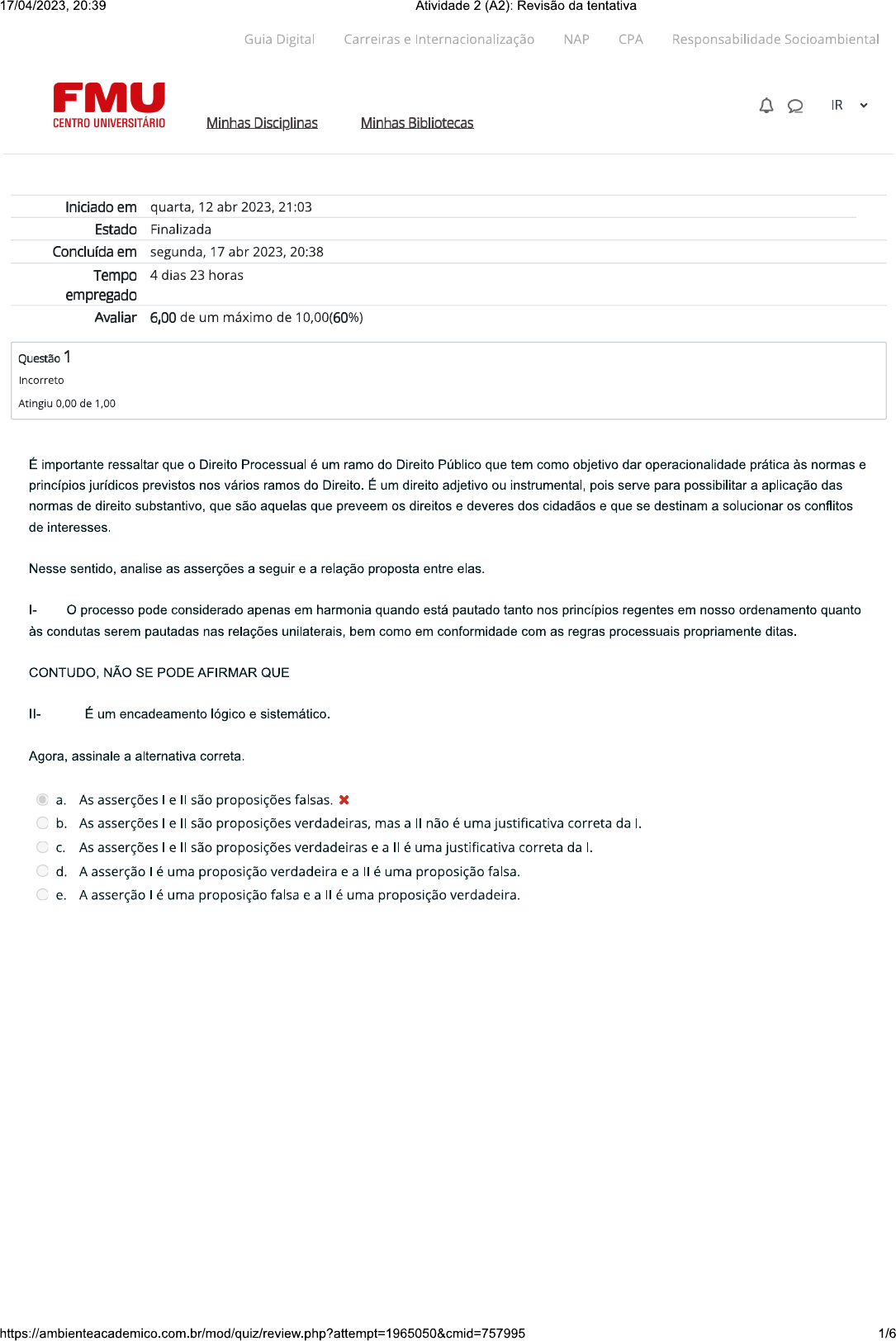<p>17/04/2023, 20:39 Atividade 2 (A2): Revisão da tentativa Guia Digital Carreiras e Internacionalização NAP CPA Responsabilidade Socioambiental FMU IR CENTRO UNIVERSITÁRIO Minhas Disciplinas Minhas Bibliotecas Iniciado em quarta, 12 abr 2023, 21:03 Estado Finalizada Concluída em segunda, 17 abr 2023, 20:38 Tempo 4 dias 23 horas empregado Avaliar 6,00 de um máximo de 10,00(60%) Questão 1 Incorreto Atingiu 0,00 de 1,00 É importante ressaltar que o Direito Processual é um ramo do Direito Público que tem como objetivo dar operacionalidade prática às normas e princípios jurídicos previstos nos vários ramos do Direito. É um direito adjetivo ou instrumental, pois serve para possibilitar a aplicação das normas de direito substantivo, que são aquelas que preveem os direitos e deveres dos cidadãos e que se destinam a solucionar os conflitos de interesses. Nesse sentido, analise as asserções a seguir e a relação proposta entre elas. I- processo pode considerado apenas em harmonia quando está pautado tanto nos princípios regentes em nosso ordenamento quanto às condutas serem pautadas nas relações unilaterais, bem como em conformidade com as regras processuais propriamente ditas. CONTUDO, NÃO SE PODE AFIRMAR QUE II- É um encadeamento lógico e sistemático. Agora, assinale a alternativa correta. a. As asserções e são proposições falsas. x b. As asserções e são proposições verdadeiras, mas a não é uma justificativa correta da I. As asserções e são proposições verdadeiras e a é uma justificativa correta da I. d. A asserção é uma proposição verdadeira e a é uma proposição falsa. e. A asserção é uma proposição falsa e a é uma proposição verdadeira. 1/6</p><p>17/04/2023, 20:39 Atividade 2 (A2): Revisão da tentativa Guia Digital Carreiras e Internacionalização NAP CPA Responsabilidade Socioambiental FMU IR CENTRO UNIVERSITÁRIO Minhas Disciplinas Minhas Bibliotecas "O provimento jurisdicional atuará de maneira diversa, com o objetivo de produzir resultados úteis às partes. A cada direito violado ou ameaçado de lesão, portanto, deve corresponder uma forma de tutela jurisdicional capaz de segurá-lo" (CÂMARA, 2007, p. 88). CÂMARA, A. F. Lições de direito processual civil. 16. ed. Rio de Janeiro: Lumen Juris, 2007. p. 88. Nesse sentido, analise as asserções a seguir e a relação proposta entre elas. I- Quando o direito subjetivo é lesado, pode-se invocar o uso da tutela jurisdicional subjetivo lesado. II- Entre as espécies de tutelas jurisdicionais, a classificação de menor abrangência restringe-se cuja pretensão acaba por ser apresentada ao sistema judicial para apreciação, que pode ser de cunho cognitivo, executivo e reflexivo. Agora, assinale a alternativa correta. a. As asserções e II são proposições verdadeiras e a é uma justificativa correta da I. b. As asserções e II são proposições verdadeiras, mas a não é uma justificativa correta da I. C. A asserção é uma proposição verdadeira e a é uma proposição falsa. d. As asserções e são proposições falsas. e. A asserção I é uma proposição falsa e a é uma proposição verdadeira. Questão 3 Correto Atingiu 1,00 de 1,00 Comenius foi uma significativa liderança religiosa no contexto em que viveu, de 1592 a 1670. Ele era devotado seguidor de Jan Huss e, predecessor do filósofo Jean Jacques Rousseau, foi o criador da Pedagogia Moderna. Seu ideal pedagógico era movido pelo preceito "Ensinar tudo a todos", o qual resumia as bases e as normas que regem o Homem no seu desempenho na esfera terrena, como criador de sua trajetória. em 15 de julho de 2019. A partir do texto, avalie as asserções a seguir e a relação proposta por elas. I. A organização escolar proposta por comenius propunha instrução em todas as coisas, capazes de tornar o homem sábio e piedoso. PORQUE II. O homem está inserido no mundo, sendo que seu fim último é a eterna bem-aventurança com Deus devendo ser preparado por meio da instrução, virtude e piedade. A respeito dessas asserções, assinale a alternativa correta. A respeito das asserções, assinale a opção correta. a. A asserção é uma proposição verdadeira, e a é uma proposição falsa. b. As asserções e são proposições verdadeiras, mas a não é uma justificativa correta da I. C. A asserção I é uma proposição falsa, e a é uma proposição verdadeira. d. As asserções e são proposições falsas. e. As asserções e são proposições verdadeiras, e a é uma justificativa correta da I. 2/6</p><p>17/04/2023, 20:39 Atividade 2 (A2): Revisão da tentativa Guia Digital Carreiras e Internacionalização NAP CPA Responsabilidade Socioambiental FMU IR CENTRO UNIVERSITÁRIO Minhas Disciplinas Minhas Bibliotecas movimentos dos corpos celestes gerou muitas observações, pesquisas e teorias religiosas e científicas sobre esse fenômeno. Disponivel Acesso em 11 de julho de 2019. Sobre o Geocentrismo e heliocentrismo, é correto afirmar que: I. heliocentrismo também chamado de sistema copernicano, não foi aceito pela Igreja Católica, que adotava a teoria do Geocentrismo, elaborada por Ptolomeu. II. A teoria geocêntrica afirmava que a Terra está no centro do Sistema Solar, e os demais astros orbitam ao redor dela. III. primeiro a questionar a teoria geocêntrica foi Aristóteles. É correto o que se afirma em a. e II, apenas. b. III, apenas. C. e III, apenas. d. I, apenas. e. I, e III. Questão 5 Correto Atingiu 1,00 de 1,00 Em 1549, com o apoio do primeiro governador-geral, Tomé de Souza, a Companhia de Jesus chegou às terras brasileiras, especificamente à Bahia, com os primeiros padres os chamados verdadeiros soldados de Cristo; entre eles destacavam-se os padres Manoel da Nóbrega, José de Anchieta e Antônio Vieira, subordinados a um regime de privações que os preparava para viver em locais distantes e se adaptar às mais adversas condições. Disponível Acesso em 14 de julho de 2019. A 