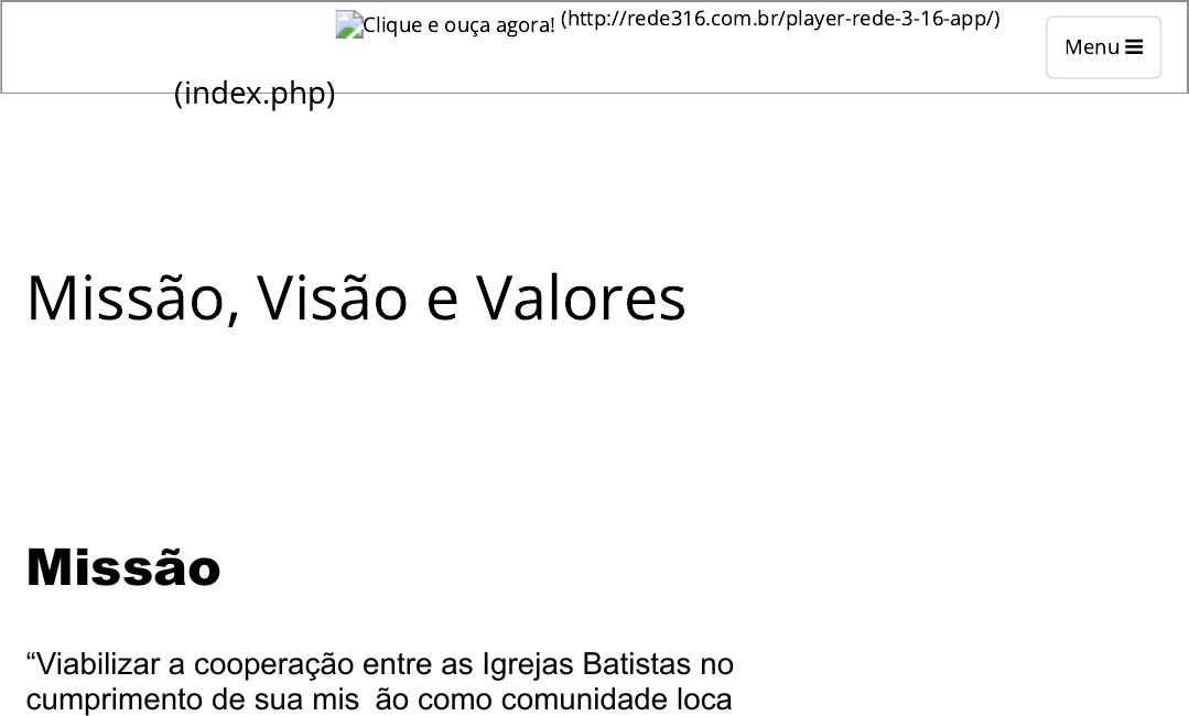 <p>03/11/2023, 15:26 Convenção Batista Brasileira - CBB</p><p>https://convencaobatista.com.br/siteNovo/pagina.php?MEN_ID=20 1/4</p><p>(index.php)</p><p>Clique e ouça agora! (http://rede316.com.br/player-rede-3-16-app/)</p><p>Menu </p><p>Missão, Visão e Valores</p><p>Missão</p><p>“Viabilizar a cooperação entre as Igrejas Batistas no</p><p>cumprimento de sua missão como comunidade local.”</p><p>A Missão define a nossa razão de ser. Ela deve ser simples e clara, entendida e</p><p>praticada por todas as equipes. Todos que integram à Convenção Batista Brasileira</p><p>devem conhecer e estar comprometidos com a Missão. As organizações da CBB,</p><p>Convenções Estaduais e Regionais, Associações e demais entidades, devem estar</p><p>unidas e trabalhando alinhadas com a Missão da CBB.</p><p>Somos um corpo unido pelos mesmos objetivos e desafios. Nosso principal foco é</p><p>a Igreja local. Existimos para que ela cumpra a sua Missão. Trabalhamos em</p><p>função dela. O espírito de cooperação, marca histórica dos Batistas, é um dos</p><p>principais vetores da unidade dos batistas brasileiros.</p><p>A cooperação entre as Igrejas Batistas é a principal estratégia da CBB para</p><p>avançarmos no</p><p>cumprimento da Grande Comissão e na edificação do Corpo de Cristo.</p><p>A multiplicação de discípulos e Igrejas no Brasil e no mundo depende do nível de</p><p>cooperação e unidade das Igrejas, pastores, missionários, líderes, Organizações,</p><p>Convenções e Associações.</p><p>O futuro dos Batistas brasileiros como Convenção depende do fortalecimento da</p><p>cooperação entre todos. Portanto, nossa Missão nos impõe uma agenda</p><p>permanente de trabalho para que o pacto cooperativo entre as Igrejas Batistas</p><p>cresça e se fortaleça em todo o tempo. O conceito de cooperação permeia todas</p><p>as oportunidades que temos de atuar unidos em benefício da expansão do</p><p>Evangelho.</p><p>A Igreja pertence ao Senhor Jesus. Ela existe para corresponder com os interesses</p><p>https://convencaobatista.com.br/siteNovo/index.php</p><p>http://rede316.com.br/player-rede-3-16-app/</p><p>http://rede316.com.br/player-rede-3-16-app/</p><p>03/11/2023, 15:26 Convenção Batista Brasileira - CBB</p><p>https://convencaobatista.com.br/siteNovo/pagina.php?MEN_ID=20 2/4</p><p>dEle, o noivo. Ninguém pode usar a Igreja para interesses e glória pessoais. Tudo</p><p>que fizermos deve ser para a glória daquele que nos chamou e enviou para fazer o</p><p>maior número de discípulos de todas as nações até que Ele volte.</p><p>Como instituição, a Convenção Batista Brasileira tem como objetivo:</p><p>• Apoiar as Igrejas em sua missão evangelizadora, discipuladora e transformadora;</p><p>• Integrar as Igrejas como organismos fraternos, celebrativos e coparticipativos;</p><p>• Promover a disseminação dos princípios Batistas entre os membros das Igrejas e</p><p>na</p><p>sociedade;</p><p>• Ser órgão de referência, orientação e consulta às Igrejas.</p><p>Consequentemente, todas as Organizações, Convenções, Associações e demais</p><p>entidades Batistas têm os mesmos objetivos institucionais.</p><p>"Transformados pelo Poder do Reino de Deus"</p><p>Visão</p><p>Nossa visão como Convenção Batista Brasileira é:</p><p>“Ser uma instituição relevante às Igrejas Batistas, no cumprimento de sua missão</p><p>de fazer discípulos de Cristo no Brasil e no mundo, que atua de maneira ágil e</p><p>eficaz.”</p><p>"Fazei discípulos de todas as nações..." Esse é o objetivo da Grande Comissão de</p><p>acordo com o Evangelho de Mateus 28: 18 – 20.</p><p>Ser relevante para que as Igrejas Batistas cumpram a sua missão como Igreja local</p><p>é a dimensão da visão estratégica da CBB. A multiplicação de discípulos de Cristo</p><p>Jesus no Brasil e no mundo norteia a matriz estratégica da Convenção Batista</p><p>Brasileira.</p><p>Tanto as diretrizes quanto os objetivos, metas e ações estratégicas dentro do</p><p>Planejamento Estratégico precisam estar alinhados à Visão. Sem visão</p><p>pereceremos e comprometeremos o futuro da Convenção Batista Brasileira. Mas</p><p>não basta ter uma declaração de Visão. É preciso traçar planos e executá-los</p><p>perseverantemente com muita determinação e na total dependência do Espírito</p><p>Santo.</p><p>Todas as organizações Batistas só devem existir se a sua missão e visão forem</p><p>relevantes para a Igreja local e estiverem em sintonia com os princípios da Palavra</p><p>de Deus.</p><p>03/11/2023, 15:26 Convenção Batista Brasileira - CBB</p><p>https://convencaobatista.com.br/siteNovo/pagina.php?MEN_ID=20 3/4</p><p>A Visão da CBB desafia todas as Organizações que integram o corpo</p><p>denominacional a desenvolver e empreender ações de maneira ágil e eficaz para</p><p>que a Igreja local cumpra a sua missão.</p><p>Como instituição buscamos:</p><p>• Alcançar qualidade máxima no atendimento total às Igrejas através das áreas:</p><p>Gestão, Comunicação, Evangelismo, Missões, Educação Ministerial e Educação</p><p>Cristã;</p><p>• Promover o fortalecimento e a multiplicação das Igrejas com um intenso,</p><p>permanente e contínuo programa que leve ao progresso e crescimento espiritual e</p><p>social dos seus membros;</p><p>• Consolidar nossa liderança como uma denominação voltada para a obra de</p><p>expansão do Reino de Deus através da evangelização discipuladora e de missões</p><p>no Brasil e no mundo;</p><p>• Alcançar, estabelecer e manter contato permanente com todas as Igrejas</p><p>arroladas na CBB através de um amplo programa com as Organizações,</p><p>Convenções estaduais e regionais e Associações;</p><p>• Fazer chegar a todas as Igrejas, com o intuito de as manter atualizadas, os</p><p>documentos norteadores da denominação: Declaração doutrinária, princípios,</p><p>filosofia, estrutura operacional e lo