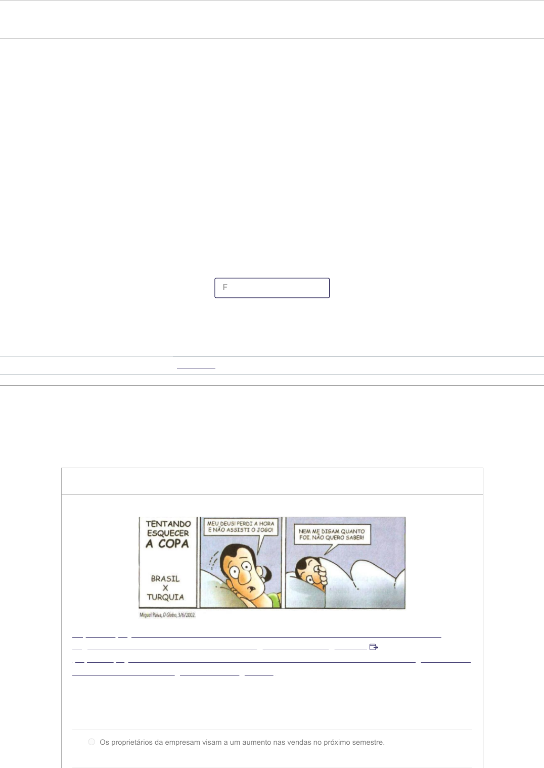 <p>Q05 - Questionário Semana 05</p><p>Entrega 4 jun em 23:59 Pontos 0,4 Perguntas 4 Disponível 1 mai em 19:00 - 4 jun em 23:59</p><p>Limite de tempo Nenhum Tentativas permitidas 2</p><p>Instruções</p><p>Histórico de tentativas</p><p>Tentativa Tempo Pontuação</p><p>MAIS RECENTE Tentativa 1 8 minutos 0,4 de 0,4</p><p> As respostas serão mostradas após a última tentativa</p><p>Pontuação desta tentativa: 0,4 de 0,4</p><p>Enviado 10 mai em 12:47</p><p>Esta tentativa levou 8 minutos.</p><p>Instruções do Questionário!</p><p>1. Antes de responder o Questionário: Assista a videoaula e leia o capitulo correspondente do livro!</p><p>2. Abra o questionário somente quando for responder;</p><p>3. Ao abrir o questionário você terá 4 questões para responder;</p><p>4. Leia com calma todas as questões e entenda o que pede a questão: se pede a incorreta, a correta e qual o tema da questão;</p><p>5. Lembre de Clicar no botão "Enviar Teste";</p><p>6. Você tem duas tentativas para fazer o teste, a segunda tentativa é opcional;</p><p>7. Lembre-se que as respostas mudam de lugar em cada tentativa;</p><p>8. As respostas corretas só aparecem após o envio da segunda tentativa;</p><p>9. O sistema considera a maior nota entre as duas tentativas;</p><p>10. Lembre-se que a segunda tentativa vai zerar TODAS as questões, inclusive as que você acertou na primeira tentativa;</p><p>11. Caso queira ter o questionário para arquivo pessoal, basta selecionar a impressão do questionário e escolher a opção de "salvar em PDF";</p><p>Bons estudos! 😀</p><p>Fazer o teste novamente</p><p>0,1 / 0,1 ptsPergunta 1</p><p>https://docplayer.com.br/56505950-Universidade-federal-de-uberlandia-instituto-de-letras-e-</p><p>linguistica-curso-de-mestrado-em-estudos-linguisticos-aline-segate.html</p><p>(https://docplayer.com.br/56505950-Universidade-federal-de-uberlandia-instituto-de-letras-e-linguistica-curso-</p><p>de-mestrado-em-estudos-linguisticos-aline-segate.html)</p><p>A tirinha acima apresenta erro quanto à regência do verbo ASSISTIR. Assinale a alternativa que também</p><p>apresenta erro de regência verbal</p><p>Os proprietários da empresam visam a um aumento nas vendas no próximo semestre.</p><p>https://ucaead.instructure.com/courses/62354/quizzes/178195/history?version=1</p><p>https://ucaead.instructure.com/courses/62354/quizzes/178195/take?user_id=43962</p><p>https://docplayer.com.br/56505950-Universidade-federal-de-uberlandia-instituto-de-letras-e-linguistica-curso-de-mestrado-em-estudos-linguisticos-aline-segate.html</p><p>Informamos aos funcionários que não haverá expediente no próximo sábado.</p><p>O diretor visou o documento.</p><p>Quando aspiro perfume, tenho crises de rinite.</p><p>O funcionário aspirava um cargo de gerência, mas foi demitido.</p><p>0,1 / 0,1 ptsPergunta 2</p><p>https://www.pensador.com/frase/MjU3NTU2OA/ (https://www.pensador.com/frase/MjU3NTU2OA/)</p><p>Na imagem acima, o verbo IMPLICAR foi utilizado com o sentido de GERAR e, por isso, foi utilizado sem</p><p>preposição. Portanto, regência do verbo está correta. Assinale a alternativa que NÃO apresenta erro de</p><p>regência de acordo com a norma culta da língua</p><p>Prefiro séries a filmes. Séries são mais interessantes.</p><p>Muitas crianças, hoje em dia, não obedecem os pais.</p><p>A queda nas vendas implica em demissão dos funcionários.</p><p>Aos finais de semana, prefiro descansar do que sair.</p><p>Vou na festa com meus amigos no fim de semana.</p><p>0,1 / 0,1 ptsPergunta 3</p><p>https://enem.estuda.com/questoes/?id=302065 (https://enem.estuda.com/questoes/?id=302065)</p><p>Os erros de pontuação são muito comuns e podem até mudar o sentido de uma frase. Assinale a</p><p>alternativa que apresenta erro com relação ao uso da vírgula</p><p>O que vocês querem comer no almoço amanhã?</p><p>https://www.pensador.com/frase/MjU3NTU2OA/</p><p>https://enem.estuda.com/questoes/?id=302065</p><p>As casas, que estão com problemas na estrutura, precisam de reforma urgentemente. (todas as casas estão</p><p>com problemas na estrutura e precisam de reforma)</p><p>Precisamos comprar produtos de limpeza e comida.</p><p>As casas, que estão com problemas na estrutura, precisam de reforma urgentemente. (apenas algumas casas</p><p>estão com problemas na estrutura e somente essas precisam de reforma)</p><p>As casas que estão com problemas na estrutura precisam de reforma urgentemente. (apenas algumas casas</p><p>estão com problemas na estrutura e somente essas precisam de reforma)</p><p>0,1 / 0,1 ptsPergunta 4</p><p>https://infoenem.com.br/as-virgulas-e-a-mudanca-de-sentido/ (https://infoenem.com.br/as-virgulas-</p><p>e-a-mudanca-de-sentido/)</p><p>O uso incorreto da vírgula ou a ausência dela pode fazer com que nossa frase tenha um sentido</p><p>totalmente diferente daquilo que era nossa intenção. Assinale a alternativa que NÃO apresenta erro com</p><p>relação ao uso da vírgula</p><p>Os talheres, que estão sujos, devem ser lavados. Os limpos devem ser guardados na gaveta.</p><p>Vamos logo pessoal.</p><p>O funcionário contratado para cuidar da organização do evento, não veio trabalhar hoje.</p><p>Fizemos, na semana passada, uma revisão do projeto.</p><p>Antônio o chefe do departamento entrará em féria no dia 29.</p><p>Pontuação do teste: 0,4 de 0,4</p><p>https://infoenem.com.br/as-virgulas-e-a-mudanca-de-sentido/</p>