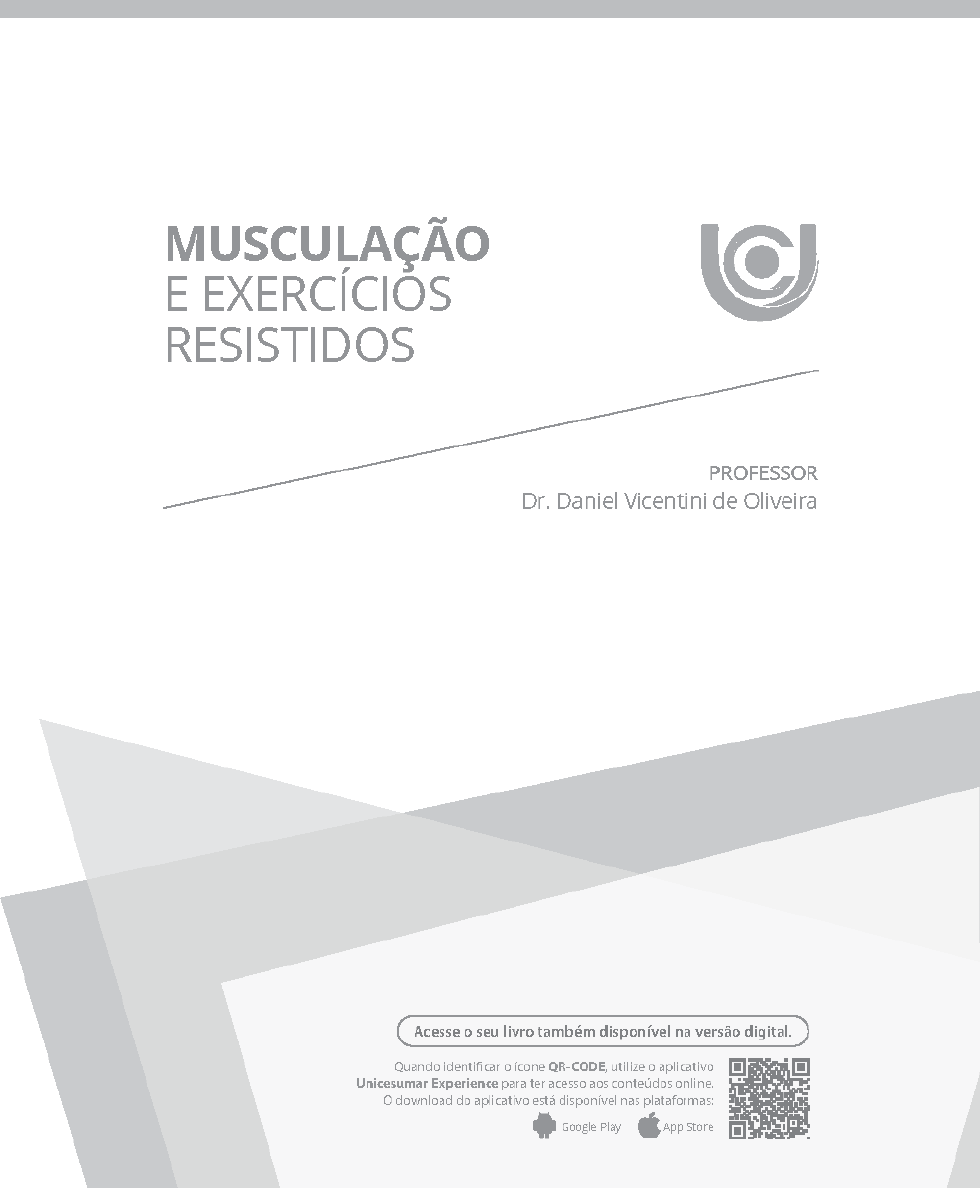 <p>https://apigame.unicesumar.edu.br/qrcode/3266</p><p>2</p><p>NEAD - Núcleo de Educação a Distância</p><p>Av. Guedner, 1610, Bloco 4 - Jd. Aclimação</p><p>Cep 87050-900 - Maringá - Paraná - Brasil</p><p>www.unicesumar.edu.br | 0800 600 6360</p><p>DIREÇÃO UNICESUMAR</p><p>Reitor Wilson de Matos Silva, Vice-Reitor Wilson de Matos Silva Filho, Pró-Reitor Executivo de EAD William Victor</p><p>Kendrick de Matos Silva, Pró-Reitor de Ensino de EAD Janes Fidélis Tomelin, Presidente da Mantenedora Cláudio</p><p>Ferdinandi.</p><p>NEAD - NÚCLEO DE EDUCAÇÃO A DISTÂNCIA</p><p>Diretoria Executiva Chrystiano Mincoff, James Prestes, Tiago Stachon, Diretoria de Graduação Kátia Coelho, Diretoria</p><p>de Cursos Híbridos Fabricio R. Lazilha, Diretoria de Pós-Graduação Bruno do Val Jorge, Diretoria de Permanência</p><p>Leonardo Spaine, Diretoria de Design Educacional Débora Leite, Head de Curadoria e Inovação Tania Cristiane Yoshie</p><p>Fukushima, Gerência de Processos Acadêmicos Taessa Penha Shiraishi Vieira, Gerência de Curadoria Carolina Abdalla</p><p>Normann de Freitas, Gerência de Contratos e Operações Jislaine Cristina da Silva, Gerência de Produção de Conteúdo</p><p>Diogo Ribeiro Garcia, Gerência de Projetos Especiais Daniel Fuverki Hey, Supervisora de Projetos Especiais Yasminn</p><p>Talyta Tavares Zagonel Supervisora de Produção de Conteúdo Daniele C. Correia</p><p>Coordenador(a) de Conteúdo Mara Cecília Rafael Lopes, Projeto Gráico José Jhonny Coelho, Editoração</p><p>Lucas Pinna Silveira Lima, Designer Educacional Bárbara Neves, Revisão Textual Érica Fernanda Ortega,</p><p>Ilustração Bruno Pardinho, Fotos Shutterstock.</p><p>C397 CENTRO UNIVERSITÁRIO DE MARINGÁ. Núcleo de Educação a Distância;</p><p>OLIVEIRA, Daniel Vicentini de.</p><p>Musculação e Exercícios Resistidos. Daniel Vicentini de Oliveira.</p><p>Maringá - PR.:Unicesumar, 2021.</p><p>212 p.</p><p>“Graduação em Educação Física - EaD”.</p><p>1.Musculação. 2. Exercícios. 3. Resistidos EaD. I. Título.</p><p>ISBN 978-65-5615-222-6 CDD - 22ª Ed. 612.76</p><p>CIP - NBR 12899 - AACR/2</p><p>Ficha Catalográica Elaborada pelo Bibliotecário</p><p>João Vivaldo de Souza - CRB-8 - 6828</p><p>Impresso por:</p><p>Em um mundo global e dinâmico, nós trabalhamos</p><p>com princípios éticos e proissionalismo, não somente</p><p>para oferecer uma educação de qualidade, mas, acima</p><p>de tudo, para gerar uma conversão integral das</p><p>pessoas ao conhecimento. Baseamo-nos em 4 pilares:</p><p>intelectual, proissional, emocional e espiritual.</p><p>Iniciamos a Unicesumar em 1990, com dois cursos de</p><p>graduação e 180 alunos. Hoje, temos mais de 100 mil</p><p>estudantes espalhados em todo o Brasil: nos quatro</p><p>campi presenciais (Maringá, Curitiba, Ponta Grossa e</p><p>Londrina) e em mais de 500 polos de educação a distância</p><p>espalhados por todos os estados do Brasil e, também,</p><p>no exterior, com dezenas de cursos de graduação e</p><p>pós-graduação. Produzimos e revisamos 500 livros</p><p>e distribuímos mais de 500 mil exemplares por ano.</p><p>Somos reconhecidos pelo MEC como uma instituição de</p><p>excelência, com IGC 4 em 7 anos consecutivos. Estamos</p><p>entre os 10 maiores grupos educacionais do Brasil.</p><p>A rapidez do mundo moderno exige dos educadores</p><p>soluções inteligentes para as necessidades de todos.</p><p>Para continuar relevante, a instituição de educação</p><p>precisa ter pelo menos três virtudes: inovação,</p><p>coragem e compromisso com a qualidade. Por</p><p>isso, desenvolvemos, para os cursos de Engenharia,</p><p>metodologias ativas, as quais visam reunir o melhor</p><p>do ensino presencial e a distância.</p><p>Tudo isso para honrarmos a nossa missão que é</p><p>promover a educação de qualidade nas diferentes áreas</p><p>do conhecimento, formando proissionais cidadãos</p><p>que contribuam para o desenvolvimento de uma</p><p>sociedade justa e solidária.</p><p>Vamos juntos!</p><p>Wilson Matos da Silva</p><p>Reitor da Unicesumar</p><p>boas-vindas</p><p>Prezado(a) Acadêmico(a), bem-vindo(a) à</p><p>Comunidade do Conhecimento.</p><p>Essa é a característica principal pela qual a Unicesumar</p><p>tem sido conhecida pelos nossos alunos, professores</p><p>e pela nossa sociedade. Porém, é importante</p><p>destacar aqui que não estamos falando mais daquele</p><p>conhecimento estático, repetitivo, local e elitizado, mas</p><p>de um conhecimento dinâmico, renovável em minutos,</p><p>atemporal, global, democratizado, transformado pelas</p><p>tecnologias digitais e virtuais.</p><p>De fato, as tecnologias de informação e comunicação</p><p>têm nos aproximado cada vez mais de pessoas, lugares,</p><p>informações, da educação por meio da conectividade</p><p>via internet, do acesso wireless em diferentes lugares</p><p>e da mobilidade dos celulares.</p><p>As redes sociais, os sites, blogs e os tablets aceleraram</p><p>a informação e a produção do conhecimento, que não</p><p>reconhece mais fuso horário e atravessa oceanos em</p><p>segundos.</p><p>A apropriação dessa nova forma de conhecer</p><p>transformou-se hoje em um dos principais fatores de</p><p>agregação de valor, de superação das desigualdades,</p><p>propagação de trabalho qualiicado e de bem-estar.</p><p>Logo, como agente social, convido você a saber cada</p><p>vez mais, a conhecer, entender, selecionar e usar a</p><p>tecnologia que temos e que está disponível.</p><p>Da mesma forma que a imprensa de Gutenberg</p><p>modiicou toda uma cultura e forma de conhecer,</p><p>as tecnologias atuais e suas novas ferramentas,</p><p>equipamentos e aplicações estão mudando a nossa</p><p>cultura e transformando a todos nós. Então, priorizar o</p><p>conhecimento hoje, por meio da Educação a Distância</p><p>(EAD), signiica possibilitar o contato com ambientes</p><p>cativantes, ricos em informações e interatividade. É</p><p>um pr