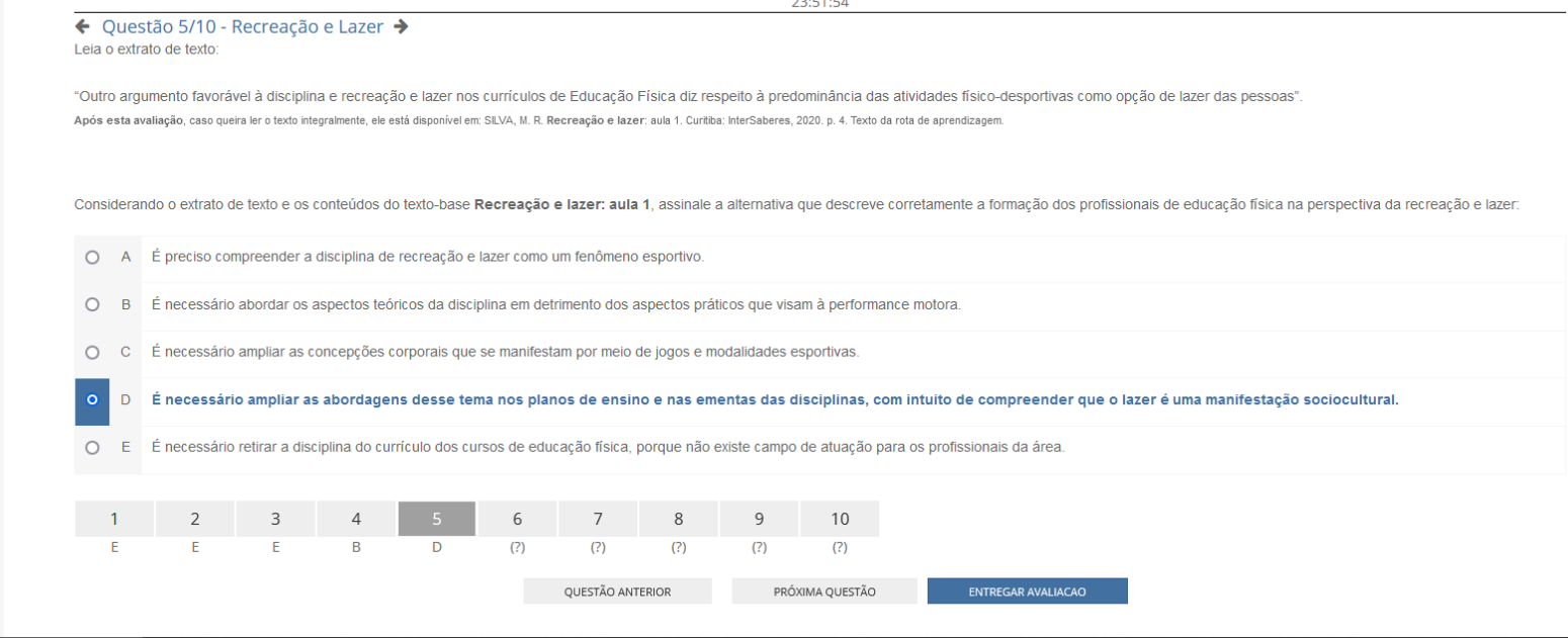 <p>Questão 5/10 - Recreação e Lazer Leia extrato de texto: "Outro argumento favorável à disciplina e recreação e lazer nos curriculos de Educação Física diz respeito à predominância das atividades físico-desportivas como opção de lazer das Após esta avaliação, caso queira ler texto integralmente, ele está disponível em M.R. Recreação e aula 1. p. 4. Texto da rota de Considerando o extrato de texto e os do texto-base Recreação e lazer: aula 1. assinale a alternativa que descreve corretamente a formação dos profissionais de educação na perspectiva da recreação e A É preciso compreender a disciplina de recreação e lazer como um fenômeno esportivo. B É necessário abordar os aspectos teóricos da disciplina em detrimento dos aspectos práticos que visam à performance motora É necessário ampliar as concepções corporais que se manifestam por meio de jogos e modalidades esportivas. D É necessário ampliar as abordagens desse tema nos planos de ensino e nas ementas das disciplinas, com intuito de compreender que lazer é uma manifestação E É necessário retirar a disciplina do currículo dos cursos de educação porque não existe campo de atuação para os profissionais da 1 2 3 4 5 6 7 8 9 10 E E E B D (?) (?) (?) (?) (?) QUESTÃO ANTERIOR PRÓXIMA QUESTÃO ENTREGAR AVALIACAO</p>