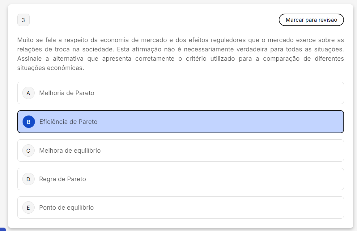 <p>3 Marcar para revisão Muito se fala a respeito da economia de mercado e dos efeitos reguladores que o mercado exerce sobre as relações de troca na sociedade. Esta afirmação não é necessariamente verdadeira para todas as situações. Assinale a alternativa que apresenta corretamente critério utilizado para a comparação de diferentes situações econômicas. A Melhoria de Pareto B Eficiência de Pareto C Melhora de equilíbrio D Regra de Pareto E Ponto de equilíbrio</p>