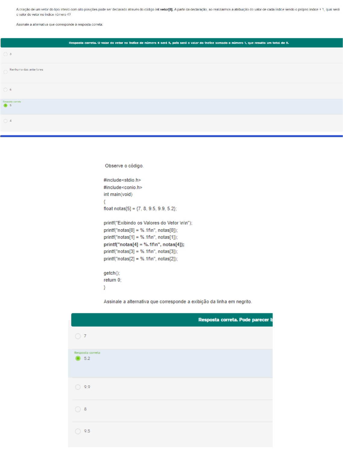<p>A criação de um vetor do tipo inteiro com oito posições pode ser declarado através do código int vetor[8]. A partir da declaração, ao realizarmos a atribuição do valor de cada sendo o próprio índice qual será valor do vetor no índice número 4? Assinale a alternativa que corresponde à resposta correta: Resposta correta. valor do vetor no indice de número 4 será 5. pois valor do indice somado número 1, que resulta um total de 5. 3 Nenhuma das anteriores 6 Resposta correta 5 4 Observe o código. #include<conio.h> int main(void) { float notas[5] = {7. 8, 9.9. 5.2}; os Valores do Vetor printf("notas[0] = notas[0]): printf("notas[1] = notas[1]): printf("notas[4] = printf("notas[3] = notas[3]): printf("notas[2] = return 0; } Assinale a alternativa que corresponde a exibição da linha em negrito. Resposta correta. Pode parecer 7 Resposta correta 5.2 9,9 8</p><p>A linguagem C define uma matriz como um vetor multidimensional, no qual ambos os elementos são vetores do mesmo tipo e também do mesmo Por exemplo, uma matriz que possui um vetor do tipo char com tamanho 5, todos os outros serão iguais. Assinale a alternativa que complementa a explicação de uma matriz. Resposta correta. A resposta que complementa uma matriz é que uma matriz pode ser multidimensional, podendo ter dimensões maiores do que apenas 2, ou seja, matriz com 3 dimensões existe e é utilizado. Resposta correta Uma matriz pode ter múltiplas dimensões, por exemplo matriz[3][3][3]. Matriz pode ter apenas um valor Matriz e vetor são a mesma coisa. Uma matriz pode ter apenas uma dimensão, por exemplo matriz[3]. Uma matriz não pode ser maior que 2 Observe o código a seguir: #include <stdio.h> int main() { int matriz[3,5]; return 0; } Qual será o retorno do código ao ser executado? Resposta correta. Conforme visto no código, a definição de uma m código irá retornar Q. Nenhuma das opções anteriores. Resposta correta código não irá executar, pois está errado. código irá retornar true. código está correto e não irá retornar nada.</p><p>A matriz é uma quantidade de variáveis de mesmo tipo, compreensíveis com um singularnome e guardados contiguamente na A individualização de cada variável de um vetor é realizada por meio da utilização De acordo com podemos afirmar que: 1. Matriz é uma lista de 2. Matriz pode ser declarada do tipo char. 3. Matriz não pode ser declarada do tipo double Assinale a alternativa correta. Resposta correta. A única afirmativa que é falsa é a III, pois uma matriz pode ser declarada com tipo double sim. A afirmativa I e II são verdadeiras, já que matriz é uma lista de veto Resposta correta II são verdadeiras Nenhuma das I. II III são II III são I falsa. Observe 0 código a seguir: #include <stdio.h> int main(void) { int matriz[2][5]: = j + } return 0: } exemplo mostrado realiza a atribuição e impressão de valores da Quantas vezes número 2 irá ser exibido na tela. Assinale a alternativa correta. Resposta correta. De acordo com a quantidade de vezes que for irá realizar a repetição, 1 Q 4 3 Resposta correta 2</p><p>Matriz é uma generalização de um vetor, ou seja, uma matriz é uma tabela de vários valores que possuem o mesmo tipo, e são armazenados sequencialmente assim como um vetor. As po- sições na memória são criadas Assinale a alternativa que completa a definição de matriz. Resposta correta. Conforme está descrito no material, as posições da memórias são criadas sequencialmente a partir da definição de uma matriz. Semelhante ao vetor, ambos têm mesma de definição na memória. Através de uma variável definida pelo tipo char. Nenhuma das anteriores. Da origem de um vetor definido pelo tipo matriz. Sequencialmente através de uma tabela definida como vetor. Resposta correta Sequencialmente a partir da definição de uma matriz. Ao ser declarado duas matrizes com seus respectivos nomes, matrizA e matrizB, as duas são do tipo inteiro, porém a matrizA é do tamanho 4 por 5 (matrizA[4][5]), e a matrizB é do tama- nho 5 por 4 (matrizB[5][4]). Pensando nisso, assinale a alternativa correta: Resposta correta. A alternativa correta é a que informa que a matrizB possui 5 linhas e 4 colunas devido ao jeito que foi declarado, pois sempre a primeira parte do colchete refere quantidade de e a segunda refere-se a quantidade de colunas. A matrizA possui 5 linhas e 4 colunas. Nenhuma das anteriores Resposta correta A matrizB possui 5 linhas e 4 colunas. A matrizB possui 5 colunas. A matrizA possui 5</p><p>Observe o código a seguir e analise de acordo com o que foi estudado até agora: #include <stdio.h> int main() { int vetor[5]; int indice; printf("Escreva 5 números: "); for (indice = 0; indice < 5; indice++) { scanf("%d", &vetor[indice] ); } return 0; } Podemos observar que este é um código onde há interação com usuário, ou seja, para o programa funcionar corretamente, o usuário terá que digitar alguns valores. Se o usuário digitar os seguintes valores 20143. Qual é a alternativa que apresenta o primeiro número que será lido pelo programa ? Q 4 3 Resposta correta 2 1 De acordo com que foi apresentado, analise seguinte código: #include <stdio.h> int main() { int int } return } Assinale a alternativa que corresponde ao retorno exibido pelo Resposta correta.0 valor exibido pelo programa é de 10 11 12, pois ao 123 Resposta correta 10 11 12 8910 10 567</p>