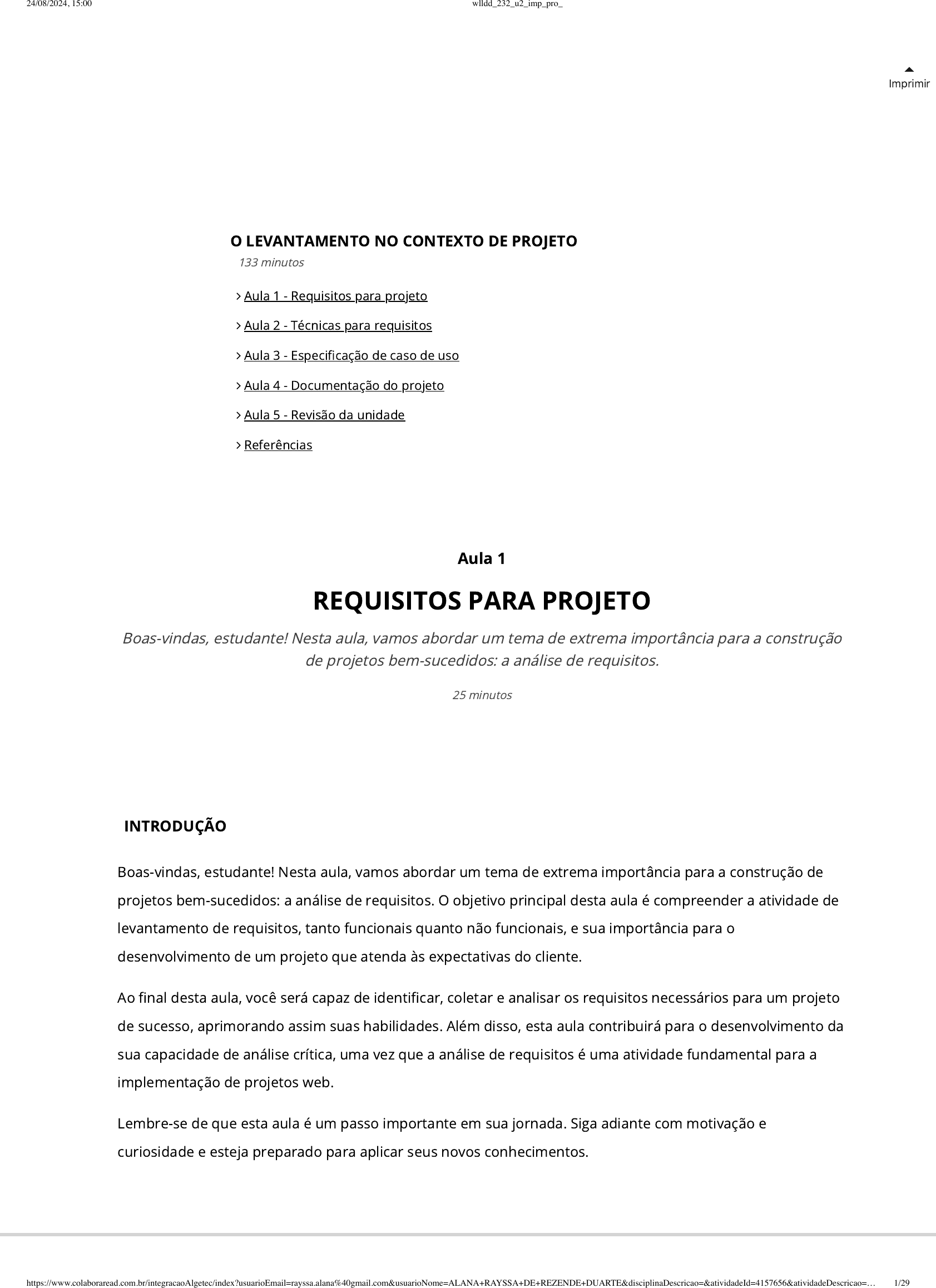 <p>Imprimir</p><p>INTRODUÇÃO</p><p>Boas-vindas, estudante! Nesta aula, vamos abordar um tema de extrema importância para a construção de</p><p>projetos bem-sucedidos: a análise de requisitos. O objetivo principal desta aula é compreender a atividade de</p><p>levantamento de requisitos, tanto funcionais quanto não funcionais, e sua importância para o</p><p>desenvolvimento de um projeto que atenda às expectativas do cliente.</p><p>Ao �nal desta aula, você será capaz de identi�car, coletar e analisar os requisitos necessários para um projeto</p><p>de sucesso, aprimorando assim suas habilidades. Além disso, esta aula contribuirá para o desenvolvimento da</p><p>sua capacidade de análise crítica, uma vez que a análise de requisitos é uma atividade fundamental para a</p><p>implementação de projetos web.</p><p>Lembre-se de que esta aula é um passo importante em sua jornada. Siga adiante com motivação e</p><p>curiosidade e esteja preparado para aplicar seus novos conhecimentos.</p><p>Aula 1</p><p>REQUISITOS PARA PROJETO</p><p>Boas-vindas, estudante! Nesta aula, vamos abordar um tema de extrema importância para a construção</p><p>de projetos bem-sucedidos: a análise de requisitos.</p><p>25 minutos</p><p>O LEVANTAMENTO NO CONTEXTO DE PROJETO</p><p> Aula 1 - Requisitos para projeto</p><p> Aula 2 - Técnicas para requisitos</p><p> Aula 3 - Especi�cação de caso de uso</p><p> Aula 4 - Documentação do projeto</p><p> Aula 5 - Revisão da unidade</p><p> Referências</p><p>133 minutos</p><p>24/08/2024, 15:00 wlldd_232_u2_imp_pro_</p><p>https://www.colaboraread.com.br/integracaoAlgetec/index?usuarioEmail=rayssa.alana%40gmail.com&usuarioNome=ALANA+RAYSSA+DE+REZENDE+DUARTE&disciplinaDescricao=&atividadeId=4157656&atividadeDescricao=… 1/29</p><p>FUNDAMENTOS DO LEVANTAMENTO DE REQUISITOS</p><p>Nesta aula, exploraremos os conceitos essenciais relacionados a essa atividade crucial no desenvolvimento de</p><p>sistemas.</p><p>1. Compreendendo a atividade de levantamento de requisitos</p><p>O levantamento de requisitos é uma atividade fundamental no processo de desenvolvimento de software.</p><p>Consiste em identi�car, coletar e compreender as necessidades, expectativas e restrições dos usuários e</p><p>outras partes interessadas para o sistema em questão. O objetivo é estabelecer uma base sólida para o</p><p>projeto, garantindo que o software desenvolvido atenda às necessidades reais dos usuários.</p><p>O levantamento de requisitos pode ser dividido em dois tipos principais:</p><p>a) Requisitos funcionais: esses requisitos descrevem as funcionalidades e os comportamentos especí�cos que</p><p>o sistema deve oferecer. Eles respondem à pergunta "O que o sistema deve fazer?" e são geralmente</p><p>expressos como ações, operações ou serviços esperados pelo usuário. Por exemplo, em um sistema de e-</p><p>commerce, os requisitos funcionais podem incluir "realizar a busca de produtos", "adicionar itens ao carrinho"</p><p>e "�nalizar o pedido".</p><p>b) Requisitos não funcionais: esses requisitos abordam as características não relacionadas às funcionalidades</p><p>diretas do sistema, mas que são igualmente importantes. Eles tratam de aspectos como desempenho,</p><p>segurança, usabilidade, con�abilidade e escalabilidade. Por exemplo, requisitos não funcionais podem incluir</p><p>"tempo de resposta do sistema inferior a 2 segundos", "acesso seguro aos dados do usuário" e "interface</p><p>intuitiva e de fácil aprendizado".</p><p>2. Tipos de requisitos para projeto</p><p>Além dos requisitos funcionais e não funcionais, é importante entender outros tipos de requisitos que podem</p><p>surgir durante o levantamento e a análise. Alguns exemplos comuns incluem:</p><p>a) Requisitos de negócio: esses requisitos estão relacionados aos objetivos e às estratégias de negócio da</p><p>organização. Eles re�etem as necessidades do cliente e a visão geral do sistema dentro do contexto</p><p>organizacional.</p><p>b) Requisitos de usuário: esses requisitos se concentram nas necessidades dos usuários �nais do sistema. São</p><p>derivados de suas atividades, expectativas e restrições especí�cas. É importante envolver ativamente os</p><p>usuários durante a fase de levantamento para obter uma compreensão precisa de suas necessidades.</p><p>c) Requisitos de sistema: esses requisitos de�nem as características e restrições do sistema como um todo.</p><p>Eles incluem requisitos de hardware, software, rede, segurança e outros aspectos relacionados à</p><p>infraestrutura do sistema.</p><p>3. A importância da análise de requisitos para o projeto</p><p>Ao analisar e validar os requisitos coletados durante o levantamento, podemos garantir que eles sejam claros,</p><p>consistentes, completos e testáveis. Alguns benefícios importantes da análise de requisitos incluem:</p><p>24/08/2024, 15:00 wlldd_232_u2_imp_pro_</p><p>https://www.colaboraread.com.br/integracaoAlgetec/index?usuarioEmail=rayssa.alana%40gmail.com&usuarioNome=ALANA+RAYSSA+DE+REZENDE+DUARTE&disciplinaDescricao=&atividadeId=4157656&atividadeDescricao=… 2/29</p><p>a) Evitar retrabalho: a análise adequada de requisitos ajuda a identi�car possíveis problemas ou</p><p>inconsistências antecipadamente, evitando retrabalho no desenvolvimento do software. Isso economiza</p><p>tempo e recursos signi�cativos ao longo do projeto.</p><p>b) Sincronizar expectativas: a análise de requisitos permite que as expectativas do cliente e das partes</p><p>interessadas sejam compreendidas e alinhadas com o produto �nal. Isso ajuda a evitar mal-entendidos e</p><p>garante que o software atenda às necessidades reais dos usuários.</p><p>c) Orientar o projeto: a análise de requisitos fornece uma base sólida para o projeto de software, orientando</p><p>as decisões de design, arquitetura e implementação. Isso garante que o sistema seja desenvolvido de forma</p><p>coerente e atenda aos objetivos e