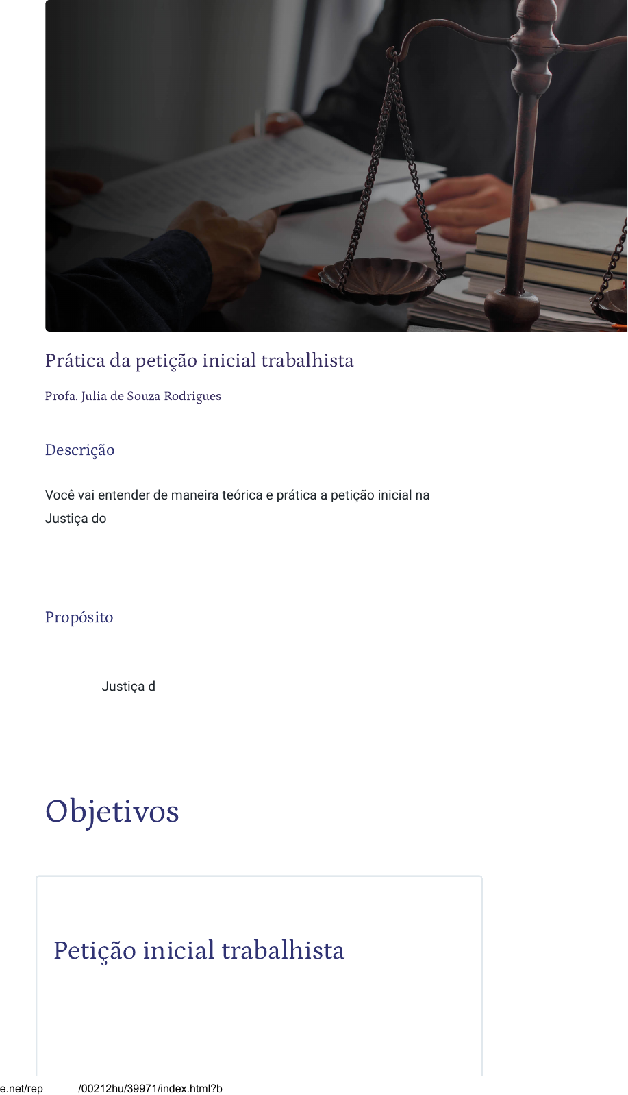 <p>Prática da petição inicial trabalhista</p><p>Profa. Julia de Souza Rodrigues</p><p>Descrição</p><p>Você vai entender de maneira teórica e prática a petição inicial na</p><p>Justiça do Trabalho, assim como as definições de reclamação</p><p>trabalhista verbal e escrita, os requisitos legais previstos na CLT e a</p><p>estrutura para a elaboração da reclamação trabalhista.</p><p>Propósito</p><p>A petição inicial é a peça processual utilizada para o ajuizamento de</p><p>ações na Justiça do Trabalho. A reclamação é a principal petição inicial</p><p>para pleitear a reparação de direitos. É essencial que os profissionais do</p><p>direito possuam conhecimento teórico e prático sobre sua elaboração.</p><p>Objetivos</p><p>Módulo 1</p><p>Petição inicial trabalhista</p><p>30/08/2024, 12:13 Prática da petição inicial trabalhista</p><p>https://stecine.azureedge.net/repositorio/00212hu/39971/index.html?brand=estacio# 1/30</p><p>Identificar os principais aspectos da petição inicial na Justiça do</p><p>Trabalho.</p><p>Módulo 2</p><p>Requisitos legais da reclamação</p><p>trabalhista</p><p>Analisar os requisitos legais da CLT para a elaboração da reclamação</p><p>trabalhista.</p><p>Módulo 3</p><p>Elaboração da reclamação</p><p>trabalhista</p><p>Estruturar a reclamação trabalhista.</p><p>Introdução</p><p>O processo na Justiça do Trabalho começa com uma petição</p><p>inicial, por meio da qual é rompida a inércia do Poder Judiciário. A</p><p>principal petição inicial para que a reparação do direito seja</p><p>pleiteada na Justiça do Trabalho é denominada reclamação (art.</p><p>840 da CLT).</p><p>A propositura da ação por meio da reclamação na Justiça do</p><p>Trabalho possui algumas especificidades: a reclamação pode ser</p><p>verbal (princípio da oralidade) ou escrita, e também pode ser</p><p>ajuizada sem o assessoramento de advogado (princípio do jus</p><p>postulandi).</p><p></p><p>30/08/2024, 12:13 Prática da petição inicial trabalhista</p><p>https://stecine.azureedge.net/repositorio/00212hu/39971/index.html?brand=estacio# 2/30</p><p>Os requisitos legais que devem ser observados para a elaboração</p><p>da reclamação foram ampliados pela Lei nº 13.467/2017</p><p>(Reforma Trabalhista), passando, assim, a exigir maior rigor</p><p>técnico para a elaboração da reclamação trabalhista (art. 840, §</p><p>1º, da CLT).</p><p>A Lei nº 13.467/2017 estabelece que o pedido da reclamação</p><p>deve ser certo, determinado e com indicação dos seus valores.</p><p>Os pedidos que não atenderem aos requisitos do parágrafo</p><p>primeiro do art. 840 serão julgados sem resolução do mérito. A</p><p>jurisprudência vem entendendo que tal exigência se trata apenas</p><p>de uma estimativa preliminar do crédito, que será apurado na</p><p>fase de liquidação da sentença (princípios da finalidade e da</p><p>efetividade social do processo, da simplicidade e da</p><p>informalidade).</p><p>O presente estudo apresenta um conteúdo prático-teórico</p><p>importante acerca da petição inicial trabalhista, com ênfase na</p><p>elaboração da principal peça processual para a propositura da</p><p>ação na Justiça do Trabalho, apresentando as particularidades da</p><p>reclamação escrita e verbal, os requisitos legais do art. 840 da</p><p>CLT e a estruturação da reclamação.</p><p>1 - Petição inicial trabalhista</p><p>Ao �nal deste módulo, você será capaz de identi�car os principais aspectos</p><p>da petição inicial na Justiça do Trabalho.</p><p>30/08/2024, 12:13 Prática da petição inicial trabalhista</p><p>https://stecine.azureedge.net/repositorio/00212hu/39971/index.html?brand=estacio# 3/30</p><p>Conceito e características</p><p>Assista ao vídeo e acompanhe uma breve introdução sobre a petição</p><p>inicial trabalhista.</p><p>Vamos conhecer a petição inicial trabalhista e, especialmente, os</p><p>aspectos que envolvem a reclamação (verbal e escrita), principal peça</p><p>para pleitear a reparação do direito na Justiça do Trabalho.</p><p>A Justiça do Trabalho tem competência para processar e julgar as</p><p>ações decorrentes da relação de trabalho (art. 114 da CFRB). Ela é</p><p>responsável pelas ações judiciais entre trabalhadores e empregadores,</p><p>bem como por outros conflitos decorrentes da relação de trabalho,</p><p>incluindo as demandas originadas no cumprimento de suas sentenças,</p><p>inclusive as coletivas.</p><p>A ação trabalhista consiste no direito de propor uma</p><p>demanda judicial para pleitear direitos trabalhistas</p><p>existentes que foram violados na relação de trabalho.</p><p>As ações na Justiça do Trabalho podem ser divididas em dissídios</p><p>individuais e coletivos, vejamos!</p><p>Dissídio individual</p><p>Tem como base o conflito entre o empregado e o empregador.</p><p>Dissídio coletivo</p><p>Tem como partes os sindicatos representantes de determinada</p><p>categoria profissional e econômica.</p><p>Os legitimados processuais para propor ação na Justiça do Trabalho</p><p>são os empregados e os empregadores (art. 791 da CLT) e, em</p><p>determinados casos, também o Ministério Público do Trabalho (MPT). A</p><p>30/08/2024, 12:13 Prática da petição inicial trabalhista</p><p>https://stecine.azureedge.net/repositorio/00212hu/39971/index.html?brand=estacio# 4/30</p><p>ação na Justiça do Trabalho pode ser ajuizada pessoalmente pelo</p><p>interessado (princípio do jus postulandi) ou por meio de um advogado.</p><p>A petição inicial é o ato processual praticado pelo</p><p>autor em que a demanda é apresentada para</p><p>apreciação pelo Poder Judiciário. Por meio da petição</p><p>inicial, o autor apresenta o pedido de tutela</p><p>jurisdicional ao Estado-juiz, buscando a aplicação do</p><p>direito ao caso concreto. A petição inicial rompe a</p><p>inércia da jurisdição, provocando assim a prestação da</p><p>tutela j