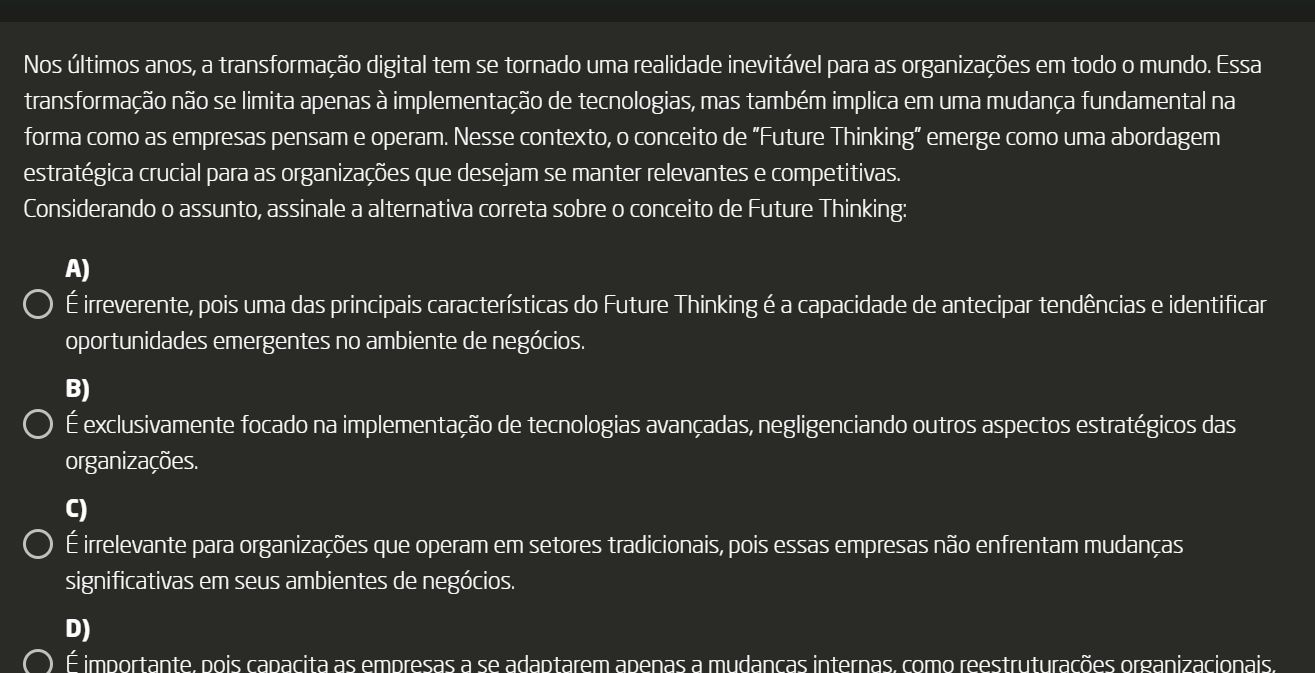 <p>Nos últimos anos, a transformação digital tem se tornado uma realidade inevitável para as organizações em todo mundo. Essa transformação não se limita apenas à implementação de tecnologias, mas também implica em uma mudança fundamental na forma como as empresas pensam e operam. Nesse contexto, conceito de "Future Thinking" emerge como uma abordagem estratégica crucial para as organizações que desejam se manter relevantes e competitivas. Considerando assunto, assinale a alternativa correta sobre conceito de Future Thinking: A) É irreverente, pois uma das principais características do Future Thinking é a capacidade de antecipar tendências e identificar oportunidades emergentes no ambiente de negócios. B) É exclusivamente focado na implementação de tecnologias avançadas, negligenciando outros aspectos estratégicos das organizações. C) É irrelevante para organizações que operam em setores tradicionais, pois essas empresas não enfrentam mudanças significativas em seus ambientes de negócios. D) É importante. capacita as empresas a se adaptarem apenas a internas. como reestruturações organizacionais.</p>