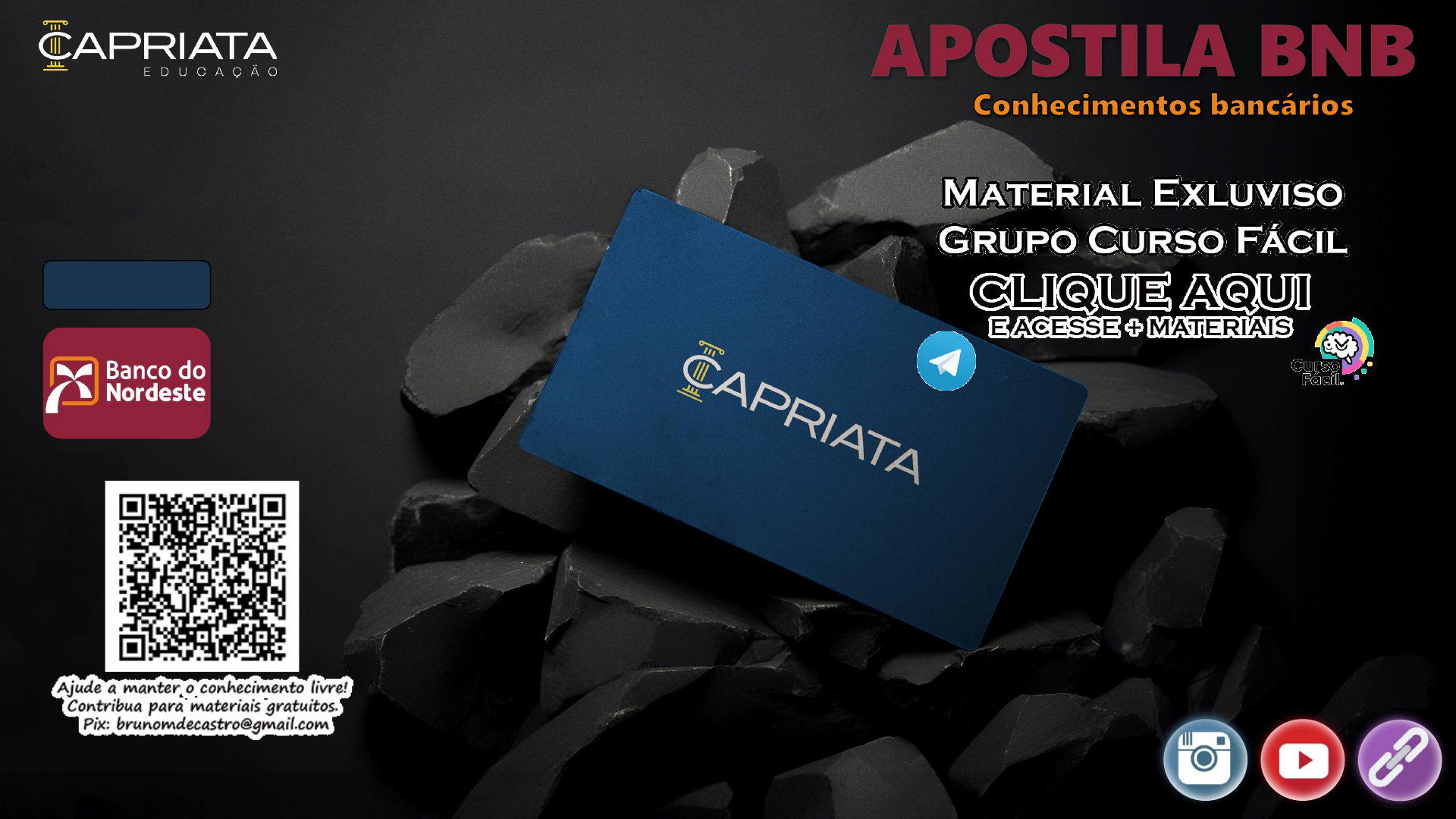 <p>APOSTILA BNB</p><p>Escola especializada em Certificações</p><p>Financeiras e Concursos Bancários.</p><p>Confira nossos Cursos Preparatórios:</p><p>CPA-10, CPA-20, CEA, AAI.</p><p>Clique aqui</p><p>Conhecimentos bancários</p><p>profcapriata.com.br</p><p>https://www.instagram.com/profwilliancapriata/</p><p>https://www.youtube.com/channel/UCDDt_IFAVG9OhDnYxj_Dg4Q</p><p>https://profcapriata.com.br/</p><p>https://t.me/curso_facil</p><p>• Conhecimentos Bancários</p><p>Para assistir as videoaulas correspondentes a esse material:</p><p>• Conhecimentos Bancários: CLIQUE AQUI PARA SER DIRECIONADO(A) PARA PLAYLIST NO YOUTUBE</p><p>Assista as videoaulas</p><p>https://www.youtube.com/watch?v=qFxtuP8yb08&list=PLlEeFe9_z5K2DkY5yV4FwzxALZ1jvxgLL</p><p>Concurso Banco do Nordeste (BNB)</p><p>• Banca organizadora: CESGRANRIO</p><p>• Vagas: 410 vagas imediatas + 300 Cadastro de Reserva</p><p>• Cargos: Analista bancário (nível médio)</p><p>• Salário: R$ 3.788,16</p><p>• Carga horária: 6 horas diárias (totalizando 30 horas semanais)</p><p>• Benefícios:</p><p>• auxílio refeição;</p><p>• Auxílio alimentação;</p><p>• 13ª cesta alimentação;</p><p>• Auxílio creche;</p><p>• Seguro de vida em grupo;</p><p>• Direitos previstos na CLT;</p><p>• Possibilidade de plano de previdência complementar;</p><p>• Oportunidade de ascensão profissional.</p><p>• Data da prova: 28/04/2024</p><p>Conteúdo programático</p><p>1 Sistema Financeiro Nacional. 1.1 Instituições do Sistema Financeiro Nacional - tipos, finalidades e atuação. 1.2 Banco</p><p>Central do Brasil e Conselho Monetário Nacional - funções e atividades. 1.3 Instituições Financeiras Oficiais Federais -</p><p>papel e atuação. 2 Operações de Crédito Bancário. 2.1 Cadastro de pessoas físicas. 2.2 Cadastro de pessoas jurídicas.</p><p>2.2.1 Tipos e constituição das pessoas. 2.2.2 Composição societária/acionária. 2.2.3 Forma de tributação. 2.2.4</p><p>Mandatos e procurações. 2.3 Fundamentos do crédito. 2.3.1 Conceito de crédito. 2.3.2 Elementos do crédito. 2.3.3</p><p>Requisitos do crédito. 2.4 Riscos da atividade bancária. 2.4.1 De crédito. 2.4.2 De mercado. 2.4.3 Operacional. 2.4.4</p><p>Sistêmico. 2.4.5 De liquidez. 2.5 Principais variáveis relacionadas ao risco de crédito. 2.5.1 Clientes. 2.5.2 Operação.</p><p>2.6 Tipos de operações de crédito bancário (empréstimos, descontos, financiamentos e adiantamentos). 2.7 Operações</p><p>de Crédito Geral. 2.7.1 Crédito pessoal e Crédito Direto ao Consumidor. 2.7.2 Desconto de duplicatas, notas</p><p>promissórias e cheques pré-datados. 2.7.3 Contas garantidas. 2.7.4 Capital de giro. 2.7.5 Cartão de crédito. 2.7.6</p><p>Microcrédito urbano. 2.8 Operações de Crédito Especializado. 2.8.1 Crédito Rural. 2.8.1.1 Conceito, beneficiários,</p><p>preceitos e funções básicas; 2.8.1.2 Finalidades: operações de investimento, custeio e comercialização. 2.8.1.3</p><p>Programa Nacional de Fortalecimento da Agricultura Familiar (PRONAF): base legal, finalidades, beneficiários,</p><p>destinação, condições. 2.8.2 Crédito industrial, agroindustrial, para o comércio e para a prestação de serviços: conceito,</p><p>finalidades (investimento fixo e capital de giro associado), beneficiários. 2.9 Recursos utilizados na contratação de</p><p>financiamentos. 2.9.1 Fundo Constitucional de Financiamento do Nordeste (FNE): base legal, finalidades, regras,</p><p>administração. 2.9.2 BNDES/FINAME: base legal, finalidade, regras, forma de atuação. 2.9.3 Fundo de Amparo ao</p><p>Trabalhador (FAT): base legal, finalidades, regras, forma de atuação. 2.10 Microfinanças: base legal, finalidade, forma</p><p>de atuação. 3 Serviços bancários e financeiros. 3.1 Conta corrente: abertura, manutenção, encerramento, pagamento,</p><p>devolução de cheques e cadastro de emitentes de cheques sem fundos (CCF). 3.2 Depósitos à vista. 3.3 Depósitos a</p><p>prazo (CDB e RDB). 3.4 Fundos de Investimentos. 3.5 Caderneta de poupança. 3.6 Títulos de capitalização. 3.7 Planos</p><p>de aposentadoria e de previdência privados. 3.8 Seguros. 3.9 Convênios de arrecadação/pagamentos (concessionárias</p><p>de</p><p>serviços públicos, tributos, INSS e folha de pagamento de clientes). 3.10 Serviço de Compensação de Cheque e Outros</p><p>Papéis. 3.11 Cobrança. 3.12 Sistema de Pagamentos Brasileiro (SPB). 4 Aspectos jurídicos. 4.1 Noções de direito aplicadas</p><p>às operações de crédito. 4.1.1 Sujeito e Objeto do Direito. 4.1.2 Fato e ato jurídico. 4.1.3 Contratos: conceito de contrato,</p><p>requisitos dos contratos, classificação dos contratos; contratos nominados, contratos de compra e venda, empréstimo,</p><p>sociedade, fiança, contratos formais e informais. 4.2 Instrumentos de formalização das operações de crédito. 4.2.1 Contratos</p><p>por instrumento público e particular. 4.2.2 Cédulas e notas de crédito. 4.3 Garantias. 4.3.1 Fidejussórias: fiança e aval. 4.3.2</p><p>Reais: hipoteca e penhor. 4.3.3 Alienação fiduciária de bens móveis. 4.4 Títulos de Crédito - nota promissória, duplicata,</p><p>cheque. 5 O Banco do Nordeste do Brasil S.A.: legislação básica, programas e informações gerais de sua atuação como</p><p>agente impulsionador do desenvolvimento sustentável da região nordeste. 6 Ética aplicada: ética, moral, valores e virtudes.</p><p>6.1 noções de ética empresarial e profissional. 6.2 A gestão da ética nas empresas públicas e privadas. 6.3 Código de</p><p>Conduta Ética e Integridade do Banco do Nordeste do Brasil (disponível na página do BNB na internet). 7 Política de</p><p>Responsabilidade Socioambiental do Banco do Nordeste do Brasil (disponível na página do BNB na internet). 8 Estratégia</p><p>ASG (Ambiental, Social e Governança): Estratégia de sustentabilidade do Banco do Nordeste do Brasil (disponível na página</p><p>do BNB na internet). 9 Atualidade