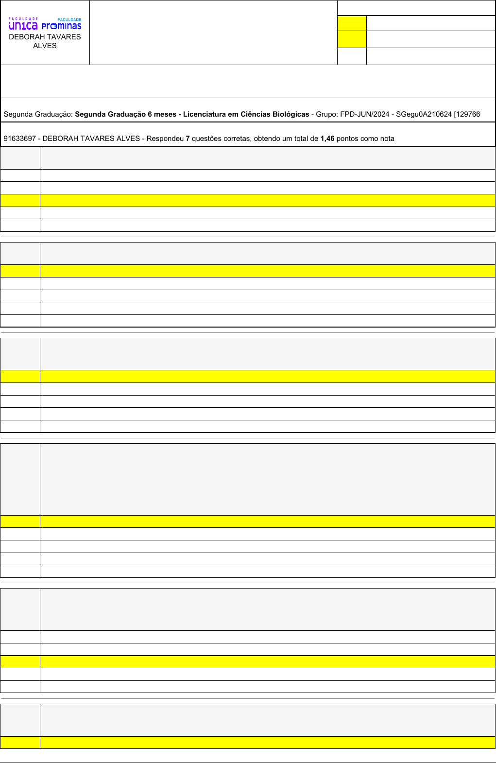 <p>Pincel Atômico - 30/08/2024 14:35:17 1/2</p><p>DEBORAH TAVARES</p><p>ALVES</p><p>Exercício Caminho do Conhecimento - Etapa 10 (16870)</p><p>Atividade finalizada em 11/07/2024 13:21:30 (2241887 / 1)</p><p>LEGENDA</p><p>Resposta correta na questão</p><p># Resposta correta - Questão Anulada</p><p>X Resposta selecionada pelo Aluno</p><p>Disciplina:</p><p>PRÁTICA PEDAGÓGICA INTERDISCIPLINAR: FUNDAMENTOS E METODOLOGIA DE BIOLOGIA CELULAR, TECIDUAL E GENÉTICA [1159148] -</p><p>Avaliação com 8 questões, com o peso total de 1,67 pontos [capítulos - 5]</p><p>Turma:</p><p>Segunda Graduação: Segunda Graduação 6 meses - Licenciatura em Ciências Biológicas - Grupo: FPD-JUN/2024 - SGegu0A210624 [129766]</p><p>Aluno(a):</p><p>91633697 - DEBORAH TAVARES ALVES - Respondeu 7 questões corretas, obtendo um total de 1,46 pontos como nota</p><p>[355707_54669]</p><p>Questão</p><p>001</p><p>(Adaptado de 2013 – CEPERJ - SEDUC-RJ - Professor – Biologia) A diferença encontrada entre DNA e RNA em relação</p><p>as bases nitrogenadas é:</p><p>X RNA possui uracila mas não possui timina como base purínica.</p><p>DNA apresenta a adenina e uracila como bases purínicas.</p><p>DNA apresenta timina e não uracila como base pirimidínica.</p><p>DNA tem adenina e guanina como bases pirimidínicas.</p><p>RNA possuía adenina, citosina e guanina como bases purínicas.</p><p>[355706_54672]</p><p>Questão</p><p>002</p><p>(PUC-MG)</p><p>Um filamento duplo de DNA com 320 nucleotídeos formará, na transcrição, RNAm com número de nucleotídeos igual a:</p><p>X 160</p><p>320</p><p>480</p><p>1</p><p>2</p><p>[355706_54659]</p><p>Questão</p><p>003</p><p>No ano de 1970, os cientistas moleculares Oscar Miller, Jr., Barbara Hamkalo e Charles Thomas usaram o microscópio</p><p>eletrônico para examinar os conteúdos celulares e demonstrar que o processo de transcrição é aquele onde uma molécula</p><p>de RNA é formada utilizando-se como molde:</p><p>X um dos filamentos da molécula de DNA.</p><p>uma molécula de tRNA.</p><p>uma dupla hélice de DNA.</p><p>uma molécula de rRNA.</p><p>uma molécula de mRNA.</p><p>[355706_54685]</p><p>Questão</p><p>004</p><p>Observe as asserções abaixo relacionadas ao estudo dessa unidade.</p><p>Os processos relacionados ao conhecido dogma central da biologia molecular resultaram no desenvolvimento da área da</p><p>engenharia genética</p><p>PORQUE</p><p>As pesquisas moleculares iniciadas no século passado resultaram na descoberta molecular das estruturas do DNA, RNA e</p><p>dos processos de replicação, transcrição e tradução nas células bacterianas e eucarióticas.</p><p>Sobre as asserções acima é correto dizer:</p><p>X as duas asserções são proposições verdadeiras, e a segunda é uma justificativa correta da primeira.</p><p>a primeira asserção é uma proposição falsa, e a segunda, uma proposição verdadeira.</p><p>as duas asserções são proposições verdadeiras, mas a segunda não é uma justificativa correta da primeira.</p><p>a primeira asserção é uma proposição verdadeira, e a segunda, uma proposição falsa.</p><p>as duas asserções são proposições falsas.</p><p>[355706_54647]</p><p>Questão</p><p>005</p><p>(Adaptado de 2015– IBFC - SEE-MG - Professor de Educação Básica - Nível I - Grau A - Biologia/Ciências). Os</p><p>ácidos nucleicos (DNA e RNA) são constituídos de muitas unidades denominadas nucleotídeos. Cada nucleotídeo é</p><p>constituído por um grupo fosfato, uma pentose e uma base nitrogenada. Assinale a alternativa que apresenta a (s)</p><p>diferença (s) entre os nucleotídeos do DNA e RNA.</p><p>São diferentes apenas nas bases nitrogenadas.</p><p>São diferentes apenas na pentose e no fosfato.</p><p>X São diferentes apenas na pentose e nas bases nitrogenadas.</p><p>São diferentes apenas no fosfato e nas bases nitrogenadas.</p><p>São diferentes apenas na pentose.</p><p>[355706_54661]</p><p>Questão</p><p>006</p><p>(2012 - PR-4 Concursos – UFRJ – Biomédico). Um pesquisador queria marcar com radioatividade o RNA de uma</p><p>bactéria em divisão, mas não seu DNA. Para isso, a base nitrogenada marcada radioativamente, que ele deve adicionar ao</p><p>meio de cultura é:</p><p>X uracila.</p><p>INF-10</p><p>Realce</p><p>INF-10</p><p>Realce</p><p>INF-10</p><p>Realce</p><p>Pincel Atômico - 30/08/2024 14:35:17 2/2</p><p>timina.</p><p>guanina.</p><p>citosina.</p><p>adenina.</p><p>[355706_54688]</p><p>Questão</p><p>007</p><p>(https://www.qconcursos.com/questoes-de-concursos/disciplinas/biologia-biologia/transcricao-e-traducao/questoes?page=2)</p><p>O esquema a seguir mostra um trecho da fita ativa de uma molécula hipotética de DNA, encontrada no núcleo de uma</p><p>célula eucariótica. Nesse trecho estão sendo mostrados três éxons e dois íntrons, cada um deles com o quantitativo de</p><p>suas bases nitrogenadas, respectivamente.</p><p>Após ocorrer o splicing gênico, o número total de aminoácidos da cadeia poplipetídica, formada a partir dessa fita de DNA,</p><p>considerando que não houve supressão de nenhum aminoácido e nem o surgimento de um códon de parada, é de:</p><p>69.</p><p>X 44.</p><p>225.</p><p>25.</p><p>396.</p><p>[355707_54691]</p><p>Questão</p><p>008</p><p>(CEFET/MG – 2019 modificada) Preencha corretamente as lacunas do texto a seguir a respeito do processo de</p><p>transcrição, fundamental para que a expressão gênica ocorra.</p><p>O processo de transcrição, em células eucarióticas, acontece no __________. Este processo consiste na síntese de uma</p><p>cadeia de __________ a partir da sequência de nucleotídeos no DNA. A proteína responsável por esse processo é a</p><p>_________ polimerase. O transcrito, __________ da célula, liga-se ao __________ onde acontece sua tradução e,</p><p>consequentemente, a formação da cadeia de aminoácidos.</p><p>A sequência que preenche corretamente as lacunas do texto é a:</p><p>nucléolo, RNAm, DNA, no hialoplasma, r