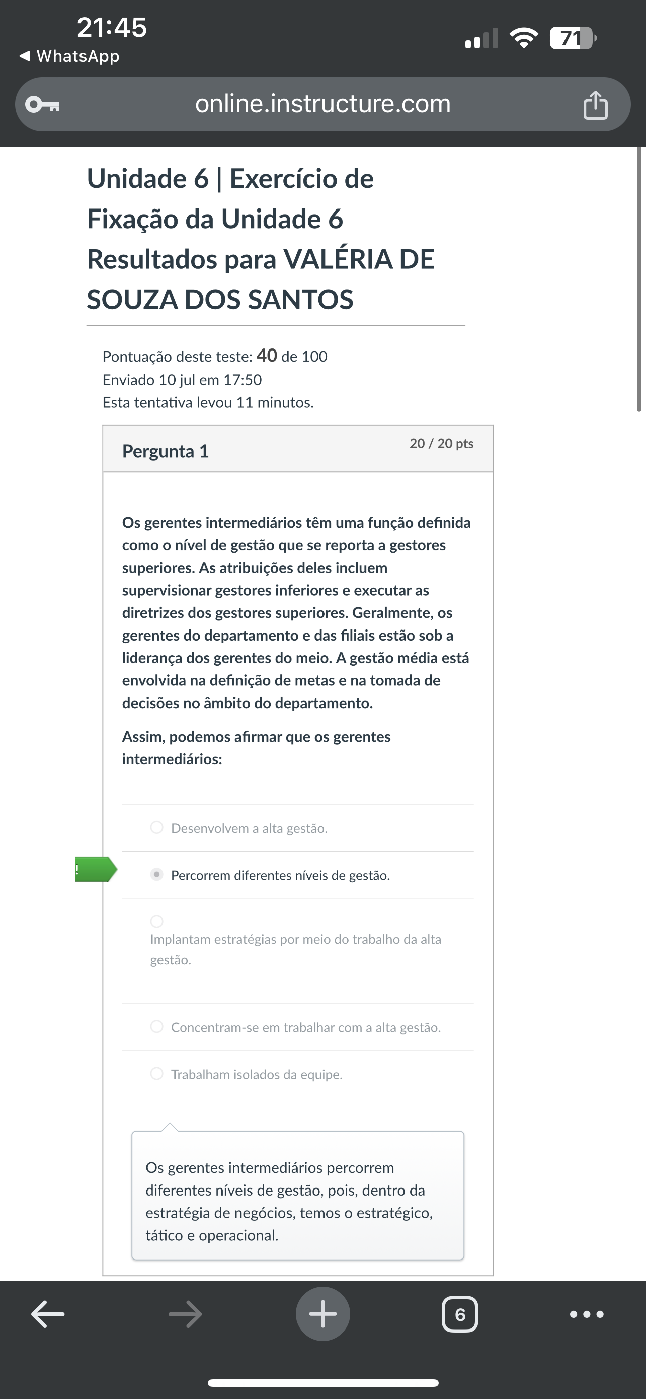 <p>21:45 71 WhatsApp online.instructure.com Unidade 6 Exercício de Fixação da Unidade 6 Resultados para VALÉRIA DE SOUZA DOS SANTOS Pontuação deste teste: 40 de 100 Enviado 10 jul em 17:50 Esta tentativa levou 11 minutos. Pergunta 1 20 / 20 pts Os gerentes intermediários têm uma função definida como o nível de gestão que se reporta a gestores superiores. As atribuições deles incluem supervisionar gestores inferiores e executar as diretrizes dos gestores superiores. Geralmente, os gerentes do departamento e das filiais estão sob a liderança dos gerentes do meio. A gestão média está envolvida na definição de metas e na tomada de decisões no âmbito do departamento. Assim, podemos afirmar que os gerentes intermediários: Desenvolvem a alta gestão. Percorrem diferentes níveis de gestão. Implantam estratégias por meio do trabalho da alta gestão. Concentram-se em trabalhar com a alta gestão. Trabalham isolados da equipe. Os gerentes intermediários percorrem diferentes níveis de gestão, pois, dentro da estratégia de negócios, temos o estratégico, tático e operacional. + 6</p>