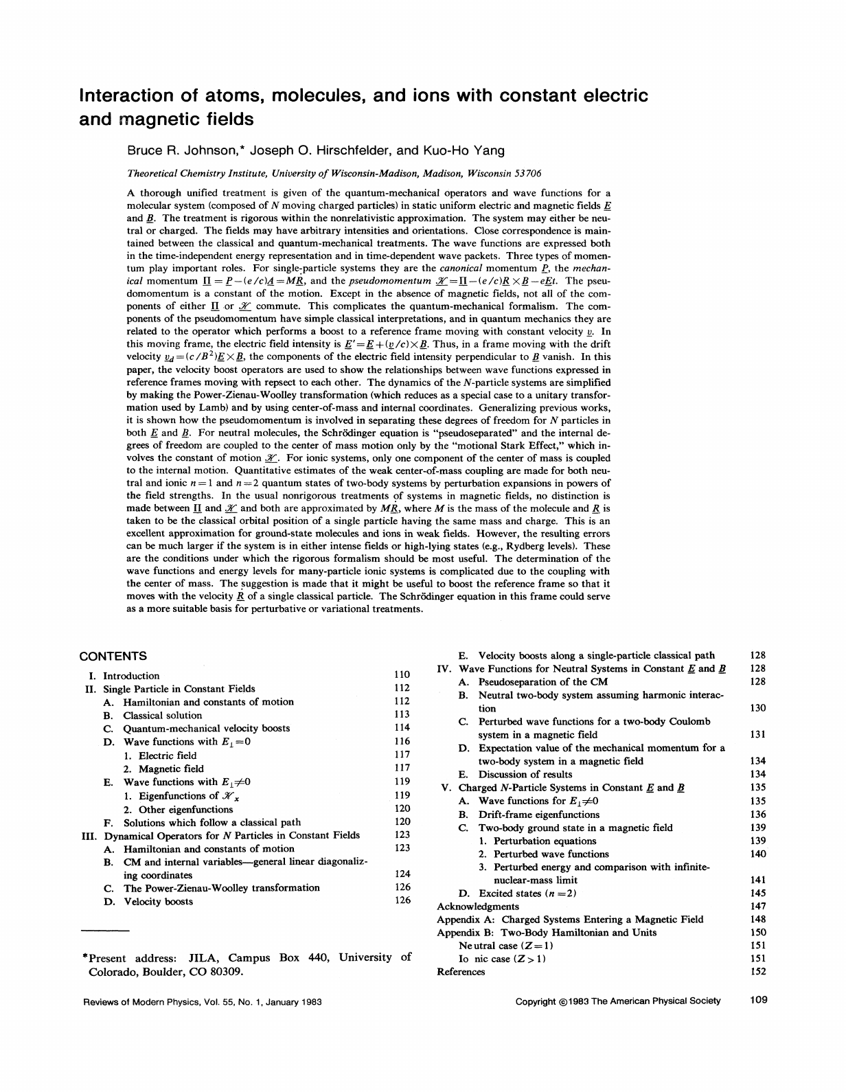 <p>Interaction of atoms, molecules, and ions with constant electric</p><p>and magnetic fields</p><p>Bruce R. Johnson,* Joseph O, Hirschfelder, and Kuo-Ho Yang</p><p>Theoretical Chemistry Institute, University of Wisconsin-Madison, Madison, Wisconsin 53706</p><p>A thorough unified treatment is given of the quantum-mechanical operators and wave functions for a</p><p>molecular system (composed of N moving charged particles) in static uniform electric and magnetic fields E</p><p>and B. The treatment is rigorous within the nonrelativistic approximation. The system may either be neu</p><p>tral or charged. The fields may have arbitrary intensities and orientations. Close correspondence is main</p><p>tained between the classical and quantum-mechanical treatments. The wave functions are expressed both</p><p>in the time-independent energy representation and in time-dependent wave packets. Three types of momen</p><p>tum play important roles. For single:particle systems they are the canonical momentum P, the mechan</p><p>ical momentum II = P — (e/c)A—MR, and the pseudomomentum JT = 11— (e/c)R XB~eEt. The pseu-</p><p>domomentum is a constant of the motion. Except in the absence of magnetic fields, not all of the com</p><p>ponents of either II or JjT_ commute. This complicates the quantum-mechanical formalism. The com</p><p>ponents of the pseudomomentum have simple classical interpretations, and in quantum mechanics they are</p><p>related to the operator which performs a boost to a reference frame moving with constant velocity v. In</p><p>this moving frame, the electric field intensity is E'=E + (v/c)xB. Thus, in a frame moving with the drift</p><p>velocity vj = (c/B2)EXB, the components of the electric field intensity perpendicular to B vanish. In this</p><p>paper, the velocity boost operators are used to show the relationships between wave functions expressed in</p><p>reference frames moving with repsect to each other. The dynamics of the iV-particle systems are simplified</p><p>by making the Power-Zienau-Woolley transformation (which reduces as a special case to a unitary transfor</p><p>mation used by Lamb) and by using center-of-mass and internal coordinates. Generalizing previous works,</p><p>it is shown how the pseudomomentum is involved in separating these degrees of freedom for N particles in</p><p>both E and B. For neutral molecules, the Schrodinger equation is "pseudoseparated" and the internal de</p><p>grees of freedom are coupled to the center of mass motion only by the "motional Stark Effect," which in</p><p>volves the constant of motion 3g\ For ionic systems, only one component of the center of mass is coupled</p><p>to the internal motion. Quantitative estimates of the weak center-of-mass coupling are made for both neu</p><p>tral and ionic n = 1 and n = 2 quantum states of two-body systems by perturbation expansions in powers of</p><p>the field strengths. In the usual nonrigorous treatments of systems in magnetic fields, no distinction is</p><p>made between II and 3j£_ and both are approximated by MRy where M is the mass of the molecule and R is</p><p>taken to be the classical orbital position of a single particle having the same mass and charge. This is an</p><p>excellent approximation for ground-state molecules and ions in weak fields. However, the resulting errors</p><p>can be much larger if the system is in either intense fields or high-lying states (e.g., Rydberg levels). These</p><p>are the conditions under which the rigorous formalism should be most useful. The determination of the</p><p>wave functions and energy levels for many-particle ionic systems is complicated due to the coupling with</p><p>the center of mass. The suggestion is made that it might be useful to boost the reference frame so that it</p><p>moves with the velocity R of a single classical particle. The Schrodinger equation in this frame could serve</p><p>as a more suitable basis for perturbative or variational treatments.</p><p>CONTENTS</p><p>I. Introduction</p><p>II. Single Particle in Constant Fields</p><p>A. Hamiltonian and constants of motion</p><p>B. Classical solution</p><p>C. Quantum-mechanical velocity boosts</p><p>D. Wave functions with EL = 0</p><p>1. Electric field</p><p>2. Magnetic field</p><p>E. Wave functions with EL=^=Q</p><p>1. Eigenf unctions of 3fx</p><p>2. Other eigenfunctions</p><p>F. Solutions which follow a classical path</p><p>III. Dynamical Operators for N Particles in Constant Fields</p><p>A. Hamiltonian and constants of motion</p><p>B. CM and internal variables—general linear diagonaliz-</p><p>ing coordinates</p><p>C. The Power-Zienau-Woolley transformation</p><p>D. Velocity boosts</p><p>110</p><p>112</p><p>112</p><p>113</p><p>114</p><p>116</p><p>117</p><p>117</p><p>119</p><p>119</p><p>120</p><p>120</p><p>123</p><p>123</p><p>124</p><p>126</p><p>126</p><p>IV.</p><p>B.</p><p>C.</p><p>D.</p><p>V.</p><p>"Present address: JILA, Campus Box 440, University of</p><p>Colorado, Boulder, CO 80309.</p><p>E. Velocity boosts along a single-particle classical path 128</p><p>Wave Functions for Neutral Systems in Constant E and B 128</p><p>A. Pseudoseparation of the CM 128</p><p>Neutral two-body system assuming harmonic interac</p><p>tion 130</p><p>Perturbed wave functions for a two-body Coulomb</p><p>system in a magnetic field 131</p><p>Expectation value of the mechanical momentum for a</p><p>two-body system in a magnetic field 134</p><p>Discussion of results 134</p><p>Charged JV-Particle Systems in Constant E and B 135</p><p>A. Wave functions for EL^=0 135</p><p>Drift-frame eigenfunctions 136</p><p>Two-body ground state in a magnetic field 139</p><p>1. Perturbation equations 139</p><p>2. Perturbed wave functions 140</p><p>3. Perturbed energy and comparison with infinite-</p><p>nuclear-mass limit 141</p><p>Excited states (n =2) 145</p><p>Acknowledgments 147</p><p>Appendix A: Charged Systems Entering a Magnetic Field 148</p><p>Appendix B: Two-Body Hamiltonian and Units 150</p><p>Ne utral case (Z =