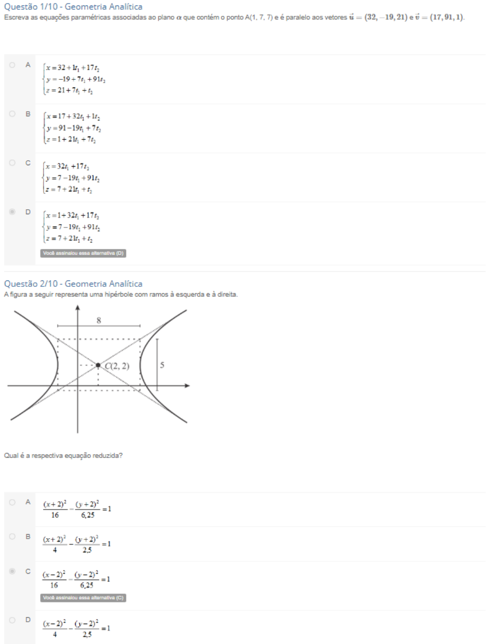 <p>Questão 1/10 - Geometria Analítica Escreva as equações paramétricas associadas ao plano que contém o ponto e é paralelo aos vetores A B C D assinalou essa Questão 2/10 - Geometria Analítica A figura a seguir representa uma hipérbole com ramos à esquerda e à direita. 8 C(2,2) 5 Qual é a respectiva equação reduzida? A 16 6,25 =1 4 2.5 C =1 16 6,25 D 4</p><p>Questão 3/10 - Geometria Analítica Escreva a equação canônica do paraboloide hiperbólico posicionado ao longo do eixo y com Zo=2, a=7 e c=5. A B C 4 D Você assinalou essa alternativa Questão 4/10 - Geometria Analítica Considere a parábola de equação Quais são as respectivas raízes desta parábola? A X1=2 e X2=7 Você assinalou essa alternativa (A) B x1=0 e X2=-14 C e X2=2 D e X2=4</p><p>Questão 5/10 - Geometria Analítica Em um determinado sistema de coordenadas cartesianas, temos as localizações dos balões A, B, C e D conforme a imagem a seguir. 87) Pixabay Sabendo que a unidade de medida destas coordenadas é 0 metro. qual é a distância entre Ae D? A 115,07 m B m C m D 142,17m Você assinalou essa alternativa Questão 6/10 - Geometria Analítica Qual é a equação vetorial associada ao plano a que contém 0 ponto A(1,7,7) e é paralelo aos vetores = (32, A 1) Você assinalou essa alternativa (A) B 7) C 1) D</p><p>Questão 7/10 - Geometria Analítica A equação y=-10x2+420x corresponde a uma parábola com a concavidade voltada para baixo. Qual é valor associado a A 19 B 20 C 21 Você assinalou essa alternativa (C) D 22 Questão 8/10 - Geometria Analítica Uma circunferência tem centro no ponto C(3, 2) e raio igual a 4. Qual é a equação reduzida desta circunferência? C(3, 2) A (x-3)2+(y-2)2-4 B C Você assinalou essa alternativa (C) D (x+3)2+(y+2)2=16</p><p>Questão 9/10 - Geometria Analítica Seja r a reta dada pelas equações e o plano dado por Dentre as alternativas a seguir, assinale apenas a correta. A Areta e o plano a são paralelos. B A reta e o plano a são ortogonais. C A reta e o plano a não são ortogonais. Você assinalou essa alternativa (C) D ângulo formado pela reta com o plano a é igual a Questão 10/10 - Geometria Analítica Qual é a distância entre o ponto P(-3, 1, 5) e a reta r:(t-2, 2t+1, -t+3)? A 0,89 B 1,12 C 1,66 D 1,87 Você assinalou essa alternativa (D)</p>