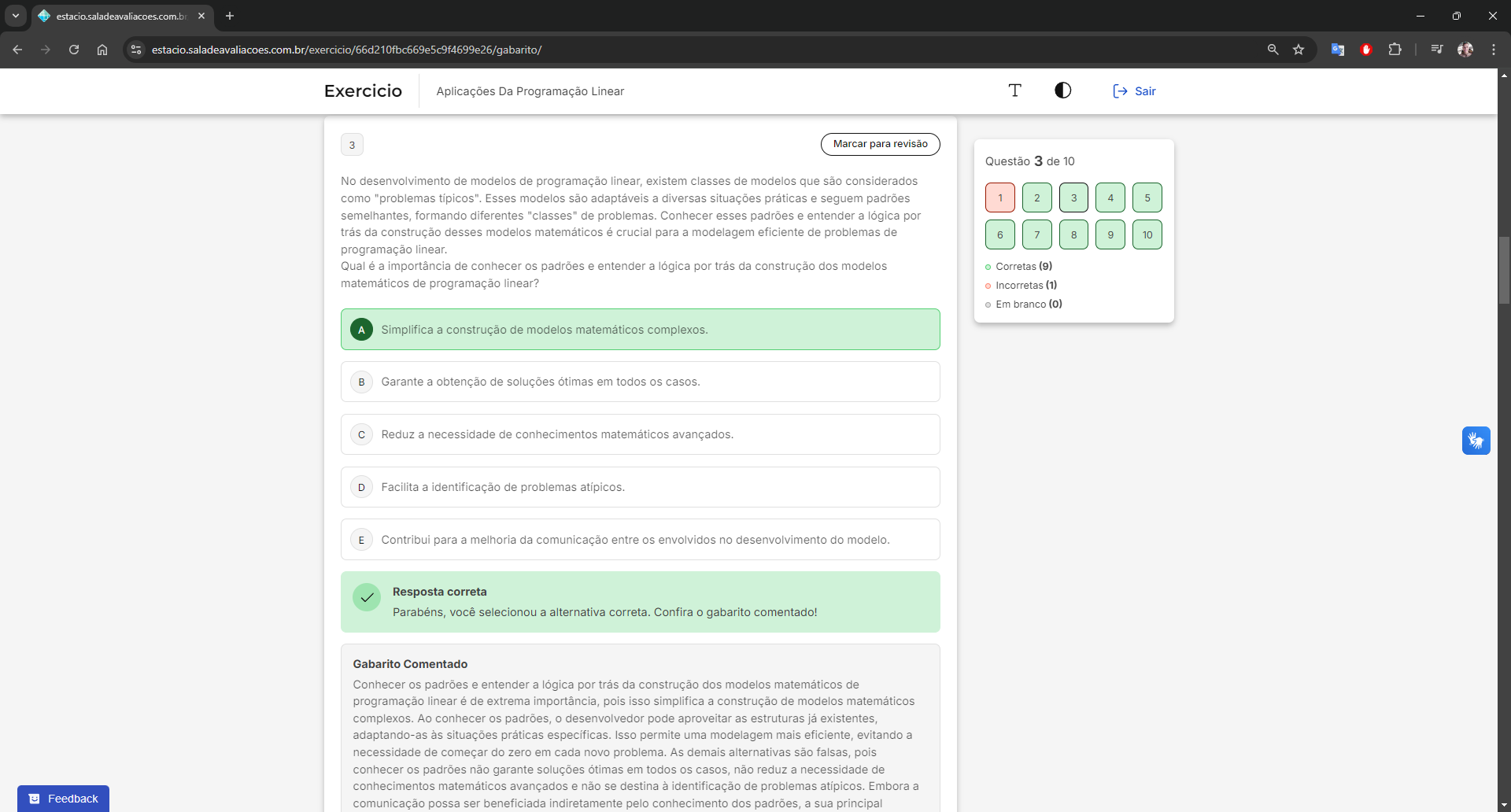 <p>Exercicio Aplicações Da Programação Linear T D 3 Marcar para revisão Questão 3 de 10 No desenvolvimento de modelos de programação linear, existem classes de modelos que são considerados como "problemas típicos". Esses modelos são adaptáveis a diversas situações práticas e seguem padrões 1 2 3 4 5 semelhantes, formando diferentes "classes" de problemas. Conhecer esses padrões e entender a lógica por trás da construção desses modelos matemáticos é crucial para a modelagem eficiente de problemas de 6 7 8 9 10 programação linear. Qual é a importância de conhecer os padrões e entender a lógica por trás da construção dos modelos Corretas (9) matemáticos de programação linear? Incorretas (1) Em branco (0) A Simplifica a construção de modelos matemáticos complexos. B Garante a obtenção de soluções ótimas em todos os casos. C Reduz a necessidade de conhecimentos matemáticos D Facilita a identificação de problemas E Contribui para a melhoria da comunicação entre os envolvidos no desenvolvimento do Resposta correta você selecionou a alternativa correta. Confira o gabarito comentado! Gabarito Comentado Conhecer os padrões e entender a lógica por trás da construção dos modelos matemáticos de programação linear é de extrema importância, pois isso simplifica a construção de modelos matemáticos complexos. Ao conhecer os padrões, desenvolvedor pode aproveitar as estruturas já existentes, adaptando-as às situações práticas específicas. Isso permite uma modelagem mais eficiente, evitando a necessidade de começar do zero em cada novo problema. As demais alternativas são falsas, pois conhecer os padrões não garante soluções ótimas em todos os casos, não reduz a necessidade de conhecimentos matemáticos avançados e não se destina à identificação de problemas Embora a Feedback comunicação possa ser beneficiada indiretamente pelo conhecimento dos padrões, a sua principal</p>