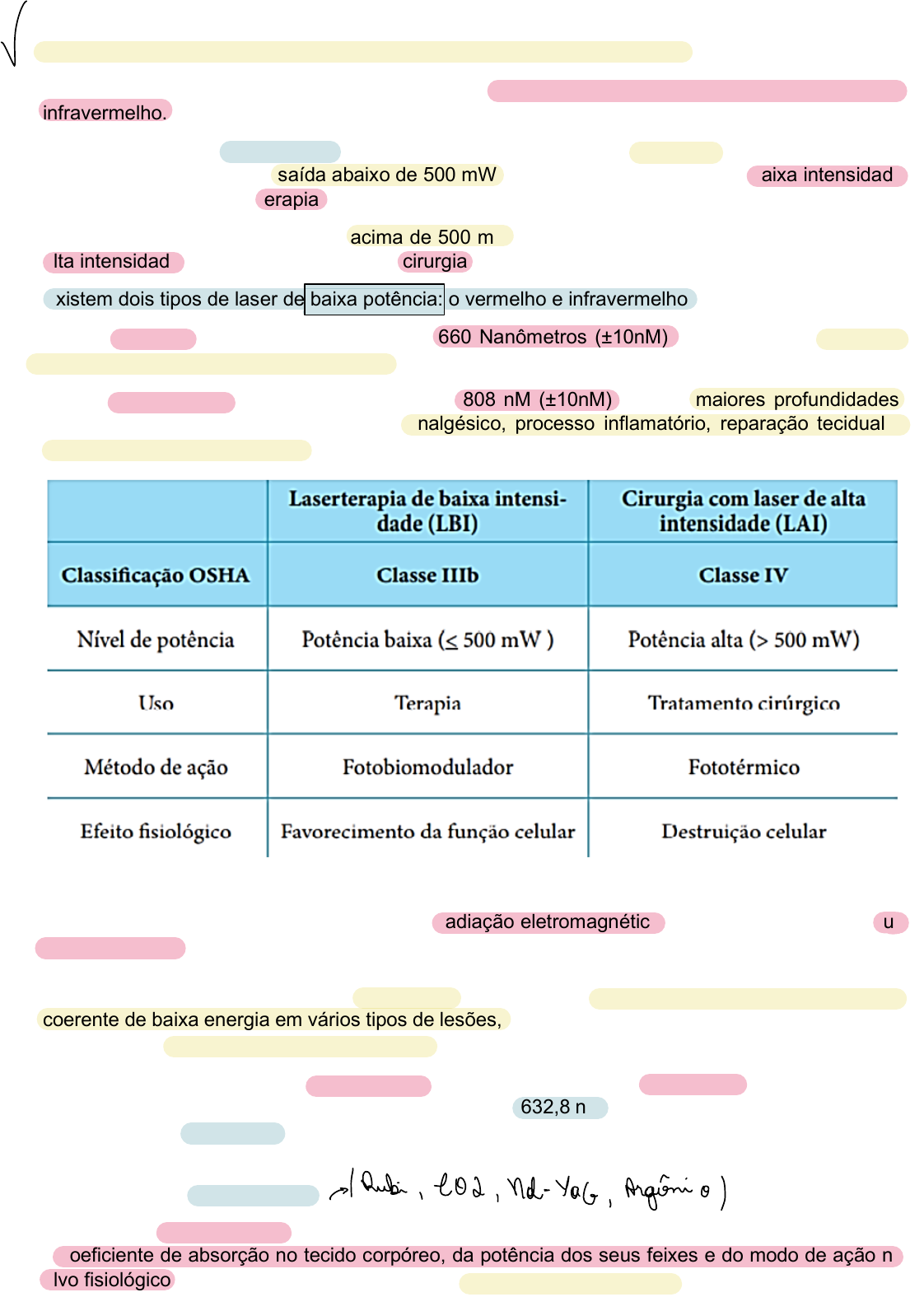 <p>-Diferenciar os tipos de laser terapêutico de alta e baixa intensidade.</p><p>Os aparelhos de laser usados na reabilitação geram luzes dentro do espectro visível e</p><p>infravermelho.</p><p>Os lasers na banda infravermelha produzem feixes de luz que são invisíveis aos olhos humanos;</p><p>aqueles com potências de saída abaixo de 500 mW são denominados lasers de baixa intensidade</p><p>(LBI) e são usados para terapia;</p><p>Já os que têm potências de saída acima de 500 mW, por outro lado, são denominados lasers de</p><p>alta intensidade (LAI) e são usados para cirurgia.</p><p>Existem dois tipos de laser de baixa potência: o vermelho e infravermelho.</p><p>O laser vermelho de comprimento de onda 660 Nanômetros (±10nM) é indicado para regular a</p><p>cicatrização e a drenagem linfática local.</p><p>O laser infravermelho com comprimento entre 808 nM (±10nM) alcança maiores profundidades,</p><p>sendo então melhor aplicado para feito analgésico, processo inflamatório, reparação tecidual e</p><p>disfunções neuromusculares.</p><p>O laser é uma luz amplificada produzida por radiação eletromagnética que se manifesta como luz</p><p>monocromática. Originou-se da abreviação de Light Amplification by Stimulated Emission of</p><p>Radiation, cuja teoria é creditada ao físico Albert Einstein. O laser terapêutico ou terapia por laser</p><p>de baixa potência é uma forma de fototerapia que envolve a aplicação de luz monocromática e</p><p>coerente de baixa energia em vários tipos de lesões, com grande índice de sucesso quando usada</p><p>para induzir a cicatrização de feridas difíceis.</p><p>O tipo de laser é definido pelo comprimento de onda utilizado e pelo meio usado para produzi-lo. O</p><p>comprimento de onda da radiação laser pode variar de 632,8 nm, faixa de luz vermelha do espectro</p><p>de radiação a 10.000 nm, faixa de luz infravermelha do espectro. Eles se dividem em alta</p><p>intensidade e baixa intensidade.</p><p>Laserterapia de alta potência</p><p>Os lasers de alta densidade, que também são chamados de cirúrgicos, diferem entre si conforme</p><p>o coeficiente de absorção no tecido corpóreo, da potência dos seus feixes e do modo de ação no</p><p>alvo fisiológico. Nesse tipo de laser, é comum o aumento da temperatura, ao contrário do de baixa</p><p>~</p><p>/Rubi</p><p>,</p><p>202</p><p>, No-Yag</p><p>, Argônio</p><p>frequência, que é atérmico. As energias térmicas variam de 40º a 100° C, e os profissionais definirão</p><p>a temperatura ideal conforme a indicação clínica.</p><p>Os tipos de lasers de baixa potência mais utilizados na fisioterapia são o Arseneto de Gálio (AsGa)</p><p>e o Hélio Neônio (HeNe), sendo que o laser de HeNe possui rápida absorção, e sua penetração é</p><p>mais superficial. O laser AsGa possui penetração mais profunda, sendo indicado para tratamento</p><p>de tendões, músculos e ossos. Os lasers HeNe e ALGaInP são visíveis a olho nu, enquanto os</p><p>AsGa e AsGaAL não operam na luz visível. Além disso, somente o AsGa opera na forma pulsada,</p><p>devido às características inerentes ao seu feixe.</p><p>Tipos de laser</p><p>Arseneto de Gálio (AsGa) - opera na região do infravermelho e são opções terapêuticas para</p><p>tratamento de lesões profundas. Pode ser aplicado em regiões específicas ou por método de</p><p>varredura. Para a administração pontual, é fundamental demarcar a região, definindo o diâmetro</p><p>do ponto e a zona que será atingida.</p><p>No método de varredura manual, os especialistas precisam demarcar o diâmetro do ponto e o</p><p>complemento da área que também receberá o laser, que será em qualquer direção, desde que seja</p><p>numa zona de segurança e seja de fácil aplicação no espaço afetado.</p><p>Hélio Neônio (HeNe) - tem a cor vermelha e consegue penetrar de 10 a 15 mm na pele. Pela pouca</p><p>penetração, é empregado para o tratamento de lesões superficiais, cicatrizes menos</p><p>complexas, manchas na pele etc. Os lasers de HeNe consistem em um tubo longo que contém</p><p>esses gases naturais à baixa pressão, cercados por um disparador de flash.</p><p>A excitação desses átomos leva os diferentes níveis de energia entre eles e causa transferência de</p><p>energia, liberando um fóton. Os fótons são refletidos de um lado para outro ao longo do tubo dando</p><p>origem a mais emissão de fótons que emergem como um feixe estreito através da extremidade</p><p>transparente. O laser HeNe estimula a síntese de proteínas e níveis de mRNA de interleucinas (IL)</p><p>1 e 8 de queratinócitos. Tais substâncias são responsáveis pela fase inflamatória inicial do processo</p><p>de reparo tecidual. Além dessas substâncias, o laser de baixa potência também regula citocinas</p><p>responsáveis por estimular a proliferação e migração de fibroblastos, como, também, promove</p><p>aumento de fatores de crescimento como VEGF, responsável pela neovascularização. Outro fator</p><p>de crescimento, o TGF-β, responsável por induzir os fibroblastos a produzirem colágeno, é regulado</p><p>pela laserterapia de baixa intensidade.</p><p>Alumínio-Gálio-Indio-Fósforo (AlGaInP) - sua potência de 30mW permite utilizar densidades de</p><p>energia menores e também um menor tempo de exposição do tecido, consequentemente um menor</p><p>tempo de terapia. Porém os mecanismos com que se obtêm efeitos terapêuticos obtidos quando</p><p>esse comprimento de onda de 660nm enquadra na faixa terapêutica e penetra o tecido, bem como</p><p>a melhor densidade de energia e a fase de melhor atuação desse tipo de laser no processo de</p><p>cicatrização precisão de melhor entendimento.</p><p>Arseneto-Gálio-Alumínio (AsGaAl) - Diodo: Os lasers de diodo são emissores de luz</p><p>especializadas, baseados em junções positivo-negativas de semicondutores. Existem vários tipos,</p><p>como o AsGaAl, Os lasers AsGaAl (
