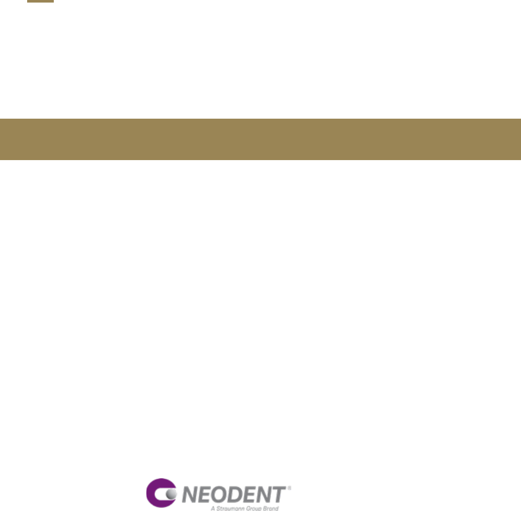 <p>MANUAL</p><p>CIRÚRGICO</p><p>GRAND MORSE®</p><p>O SISTEMA DE IMPLANTES</p><p>GRAND MORSE®</p><p>5</p><p>CONTEÚDO</p><p>1.0 INFORMAÇÕES BÁSICAS SOBRE PROCEDIMENTOS CIRÚRGICOS 8</p><p>2.0 SISTEMA DE IMPLANTES NEODENT® 8</p><p>2.1 Visão Geral 8</p><p>3.0 CARACTERÍSTICAS DOS IMPLANTES 11</p><p>3.1 Superfície 12</p><p>3.1.1 NeoPoros 12</p><p>3.1.2 Acqua 13</p><p>3.2 Desenhos de Implantes 14</p><p>3.2.1 Helix® GM 14</p><p>3.2.2 Drive GM® 14</p><p>3.2.3 Titamax GM® 15</p><p>3.3 Opções de roscas e visão geral do formato de acordo com o desenho</p><p>do implante 16</p><p>4.0 INDICAÇÕES E CONTRAINDICAÇÕES 18</p><p>5.0 PLANEJAMENTO PRÉ-OPERATÓRIO 19</p><p>5.1 Posicionamento do implante e tecido peri-implantar 19</p><p>5.1.1 Posicionamento mesiodistal do Implante 20</p><p>5.1.1.1 Exemplos de espaços unitários 21</p><p>5.1.1.2 Exemplos de espaços dentários múltiplos 22</p><p>5.1.2 Posição vestibulolingual do Implante 24</p><p>5.1.3 Posição cervicoapical do Implante 24</p><p>5.2 Auxiliares no planejamento 25</p><p>5.2.1 Bandeirinha como auxiliar no diagnóstico e posicionamento dos implantes 25</p><p>6</p><p>5.2.2 Paralelizadores para o diagnóstico do osso adjacente 26</p><p>5.2.3 Guia de perfuração cirúrgica 28</p><p>6.0 PROCEDIMENTOS CIRÚRGICOS 29</p><p>6.1 Preparação do alvéolo cirúrgico 29</p><p>6.1.1 Preparação básica do alvéolo cirúrgico 29</p><p>6.1.1.1 Preparação do alvéolo cirúrgico para implantes cônicos Helix® GM 31</p><p>6.1.1.2 Preparação do alvéolo cirúrgico para implantes cônicos Drive GM® 34</p><p>6.1.1.3 Preparação do alvéolo cirúrgico para implantes cilíndricos Titamax GM® 35</p><p>6.1.2. Detalhes sobre a preparação especial do alvéolo cirúrgico 37</p><p>6.1.2.1. Broca Cônica de Sobrecontorno 37</p><p>6.1.2.2. Broca Piloto 38</p><p>6.1.2.3. Exemplo de preparação especial do alvéolo cirúrgico 38</p><p>6.1.2.4. Opções para brocas 40</p><p>6.2. Embalagem do Implante Neodent® 40</p><p>6.3. Instalação do Implante Grand Morse® 42</p><p>6.3.1. Instalação do implante com o contra-ângulo 42</p><p>6.3.2. Instalação manual do implante 44</p><p>6.3.3. Finalização do posicionamento do implante com a Chave Catraca Torquímetro 44</p><p>6.3.4. Chave Catraca Torquímetro 45</p><p>6.4. Manejo dos tecidos moles 45</p><p>6.4.1 Cicatrização em duas etapas/submucosa 45</p><p>6.4.2 Cicatrização transmucosa: uma etapa ou carga imediata 49</p><p>6.4.2.1. Cicatrização transmucosa: uma etapa 50</p><p>7</p><p>6.5 Visão geral sobre os cicatrizadores 51</p><p>6.5.1 Visão geral sobre os intermediários GM e cicatrizadores correspondentes 52</p><p>6.5.2 Cicatrizador Personalizável Grand Morse® 53</p><p>7.0 FASE DE CICATRIZAÇÃO 54</p><p>8.0 ORIENTAÇÕES PROTÉTICAS GERAIS 54</p><p>9.0 KITS NEODENT® 55</p><p>9.1 LImpeza e Desinfecção do Estojo, Brocas e Instrumentais 55</p><p>9.2 Esterilização do Estojo, Brocas e Instrumentais 57</p><p>REFERÊNCIAS BIBLIOGRÁFICAS 58</p><p>1.0 INFORMAÇÕES BÁSICAS SOBRE PROCEDIMENTOS CIRÚRGICOS</p><p>A era da moderna Implantodontia, baseada em resultados clínicos de osseointegração, foi</p><p>originalmente publicada em periódicos ingleses em 19771. Desde então, a Odontologia sofreu importantes</p><p>alterações e o plano de tratamento de um paciente atual usualmente oferece próteses implanto-retidas</p><p>e/ou implanto-suportadas como uma solução acessível e confiável. O número de implantes dentários tem</p><p>aumentado rapidamente ao longo dos últimos anos2,3 e este conceito de tratamento requer habilidades</p><p>e conhecimento específicos, como a curva de aprendizado do cirurgião; que são relevantes para os</p><p>resultados4. Baseado nestes fatos, o presente guia tem por objetivo fornecer aos cirurgiões dentistas e</p><p>especialistas informações básicas e diretrizes sobre planejamento, procedimentos cirúrgicos e opções de</p><p>tratamento.</p><p>Este guia não substitui as instruções de uso (IFU) de cada produto. Estas podem ser encontradas</p><p>em no website: ifu.neodent.com.br. É de exclusiva responsabilidade do cirurgião analisar as condições de</p><p>saúde geral do paciente, a viabilidade do procedimento cirúrgico e os produtos mais apropriados para</p><p>cada situação clínica.</p><p>2.1 Visão Geral</p><p>2.0 SISTEMA DE IMPLANTES NEODENT®</p><p>O Sistema de Implantes Grand Morse® (GM) Neodent® oferece diferentes opções de desenhos</p><p>de implantes, roscas, ápices e dois tipos de tratamento de superfície. A filosofia da Neodent® é oferecer</p><p>uma solução em implante adaptada para cada indicação específica, sendo estas: densidade e quantidade</p><p>óssea e técnica cirúrgica. Todos os implantes podem ser instalados com o Kit Cirúrgico Grand Morse®. Os</p><p>procedimentos são padronizados e possuem passos sequenciais.</p><p>FIGURA 1 – Opções de implantes Neodent® de acordo com a sua indicação.</p><p>8</p><p>Osso tipo I, II,</p><p>III e IV</p><p>Osso tipo</p><p>III e IV</p><p>Osso tipo</p><p>I e II</p><p>9</p><p>Todos os implantes Grand Morse® (Helix®, Drive®, e Titamax®) têm a mesma dimensão na conexão</p><p>protética, independente do diâmetro do implante (figura 2) com um ângulo interno de 16º. As paredes</p><p>internas mais espessas do implante resultam em maior resistência mecânica e resultados superiores</p><p>quando comparados com diferentes conexões internas5,6 e foram estrategicamente desenhadas para o</p><p>portfólio Grand Morse®.</p><p>FIGURA 2. A conexão do implante Grand Morse® Neodent® tem uma mesma largura, independente do diâmetro do implante.</p><p>FIGURA 3. O implante Grand Morse® Neodent® tem uma profunda conexão em seu interior, desenhada para aumentar a área</p><p>de contato entre implante e intermediário protético.</p><p>3,0 mm</p><p>16º</p><p>3,7 mm</p><p>10</p><p>FIGURA 4. Indexador interno como um</p><p>hexágono, criado para guiar cirurgicamente</p><p>o