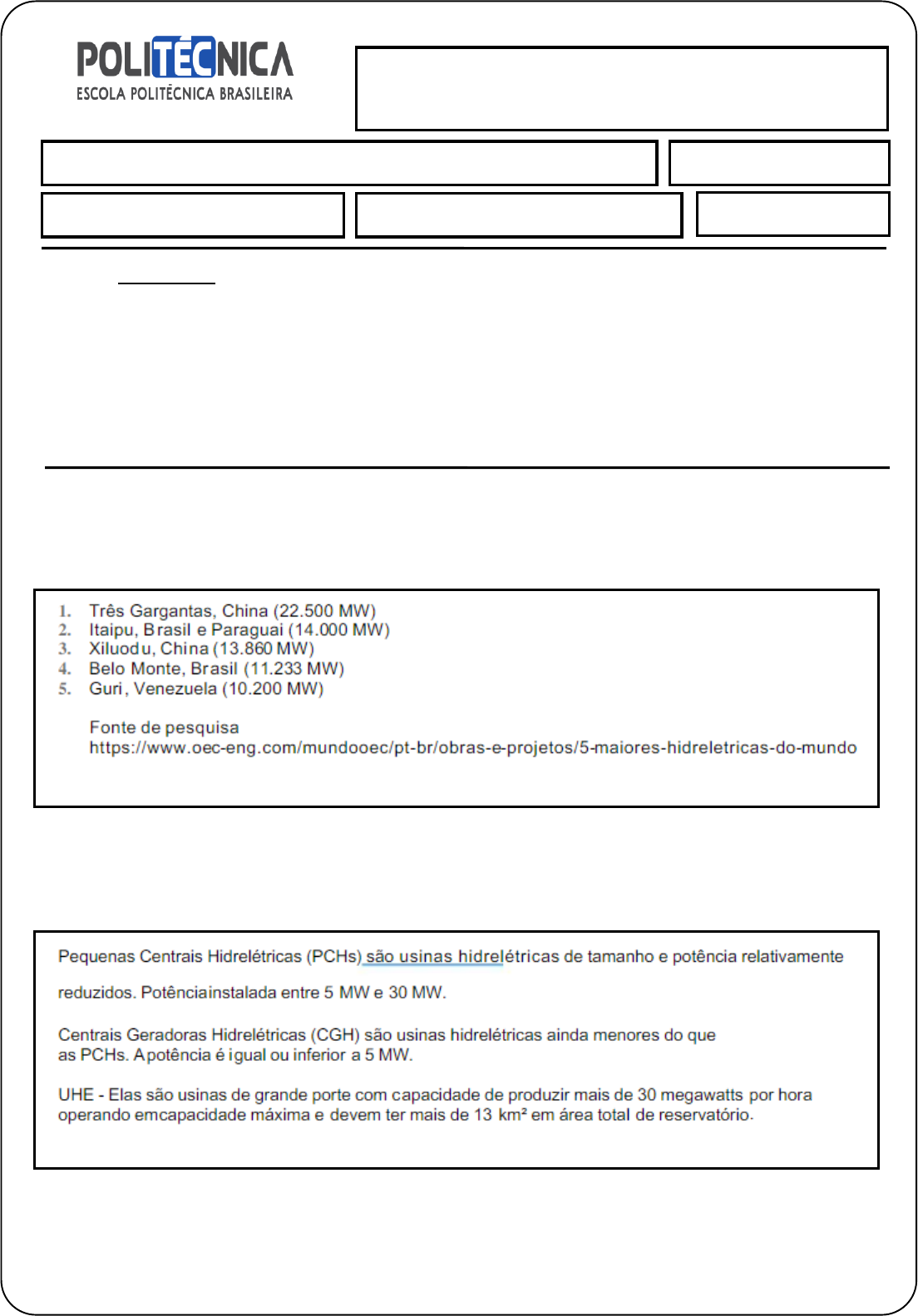 <p>Atividade de Pesquisa: SISTEMA ELÉTRICO DE POTÊNCIA</p><p>1) Faça uma pesquisa e, como resultado dela, liste abaixo, em ordem crescente, as 05 (cinco) maiores</p><p>usinas hidrelétricas do mundo. Apresente também na sua lista: o nome da usina, o país em que se</p><p>encontra localizada, o nome do rio em que a usina está instalada e a capacidade instalada em MW</p><p>ou GW. Ao final da lista coloque a(s) referência(s) de sua pesquisa.</p><p>2) Pesquise quais são as diferenças básicas entre Usinas Hidrelétricas (UHE), Pequenas Centrais</p><p>Hidrelétricas (PCH) e Centrais Geradoras Hidrelétricas (CGH). Pesquise também a quantidade</p><p>aproximada destes tipos de geração em operação atualmente no Brasil.</p><p>SISTEMA ELÉTRICO DE POTÊNCIA</p><p>Aluno (a): VANDERSON TELMAN MARTCHUK Data: 24/08/2024</p><p>Atividade de Pesquisa NOTA:</p><p>INSTRUÇÕES:</p><p>→ Esta Atividade contém 12 questões. Totalizando 10 pontos.</p><p>→ Preencher devidamente seus dados no cabeçalho.</p><p>→ Utilize o espaço delimitado abaixo de cada questão para as suas respostas.</p><p>→ Ao terminar grave o arquivo com o nome Atividade de Envio (nome do aluno).</p><p>→ Salve o arquivo no formato .pdf e envie pelo sistema.</p><p>Atividade de Pesquisa: SISTEMA ELÉTRICO DE POTÊNCIA</p><p>3) Pesquise e liste abaixo, quais são os tipos de usinas termoelétricas atualmente em operação no</p><p>Brasil quanto ao seu tipo de combustível.</p><p>4) Faça uma pesquisa, e como resultado dela, liste abaixo, em ordem crescente, os 05 (cinco) estados</p><p>da federação brasileira com a maior quantidade de parques eólicos em operação atualmente.</p><p>Apresente também na sua lista a capacidade instalada em geração eólica de cada estado em MW</p><p>ou GW. Ao final da lista coloque a(s) referência(s) de sua pesquisa.</p><p>5) Sobre a Transmissão de Energia Elétrica no Brasil, quais são os níveis de tensão padronizados que</p><p>são praticados por este setor? Faça uma pesquisa e, liste abaixo, o comprimento (em quilômetros)</p><p>das linhas de transmissão por nível de tensão aqui no Brasil. Ao final da lista coloque a(s)</p><p>referência(s) de sua pesquisa.</p><p>6) Qual o nome da empresa concessionária de distribuição de energia elétrica que atende à sua</p><p>região de moradia? Faça uma pesquisa sobre essa distribuidora, e apresente os seguintes</p><p>resultados: níveis de tensão das redes primária e secundária, área de concessão (quantidade de</p><p>municípios atendidos), população atendida, e quantidade de unidades consumidoras atendidas.</p><p>COPEL</p><p>Na Copel, o sistema elétrico foi padronizado com duas tensões nominais primárias: 13,8 kV e 34,5 kV.</p><p>Foi estabelecido ainda que as tensões primárias de fornecimento são: 13,2 kV e 33 kV, respectivamente.</p><p>A tensão secundaria atende entre fase e neutro 127v e fase fase 220v.</p><p>Atende o estado do Paraná.</p><p>Atualmente, a Companhia atende diretamente mais de 5 milhões de unidades consumidoras, em 395</p><p>municípios e 1.068 localidades (distritos, vilas e povoados).</p><p>Atividade de Pesquisa: SISTEMA ELÉTRICO DE POTÊNCIA</p><p>7) Pesquise sobre o assunto ‘Smart Grids’ e relate com suas palavras o que você entendeu sobre este</p><p>conceito.</p><p>8) Você já teve acesso à alguma norma de Fornecimento de energia elétrica, ou, norma de elaboração</p><p>de projetos de redes de distribuição da sua distribuidora local? Pesquise na página da web de sua</p><p>distribuidora local e tente procurar e fazer o download de alguma destas normas. Como resultado</p><p>dessa pesquisa, cole o(s) link(s) no espaço abaixo.</p><p>9) De acordo com a nova Resolução Normativa nº 1000/2021 da ANEEL, os consumidores de energia</p><p>elétrica estão enquadrados em dois grandes grupos. Quais são estes grupos? Quais os critérios de</p><p>enquadramento dos consumidores para pertencerem a estes grupo? Apresente também quais são</p><p>os subgrupos destes dois grandes grupos.</p><p>10) Quais são as modalidades tarifárias reguladas pela Agência Nacional de Energia Elétrica?</p><p>Sim.</p><p>A Companhia Paranaense de Energia (COPEL) lançou uma nova norma técnica para instalação de</p><p>entrada de energia em 2020, a NTC 901100 de Fornecimento em Tensão Secundária de Distribuição de</p><p>Energia. Esta norma estabelece padrões construtivos que visam uniformizar procedimentos e adotar</p><p>padrões dentro das exigências técnicas e de segurança recomendadas. A norma pode ser adquirida nas</p><p>agências da COPEL ou consultada na página da Internet no endereço www.copel.com/normas.</p><p>Atividade de Pesquisa: SISTEMA ELÉTRICO DE POTÊNCIA</p><p>11) Quais são os serviços considerados como essenciais na distribuição de energia elétrica?</p><p>12) Quais são os prazos que as distribuidoras têm para atender às solicitações de ligação nova das</p><p>unidades consumidoras?</p><p>Art. 6º A distribuidora deve alterar o cadastro do consumidor e demais usuários no prazo de até 5 dias</p><p>úteis da solicitação ou, caso haja necessidade de visita técnica, em até 10 dias úteis, observadas as</p><p>situações específicas dispostas nesta Resolução.</p>