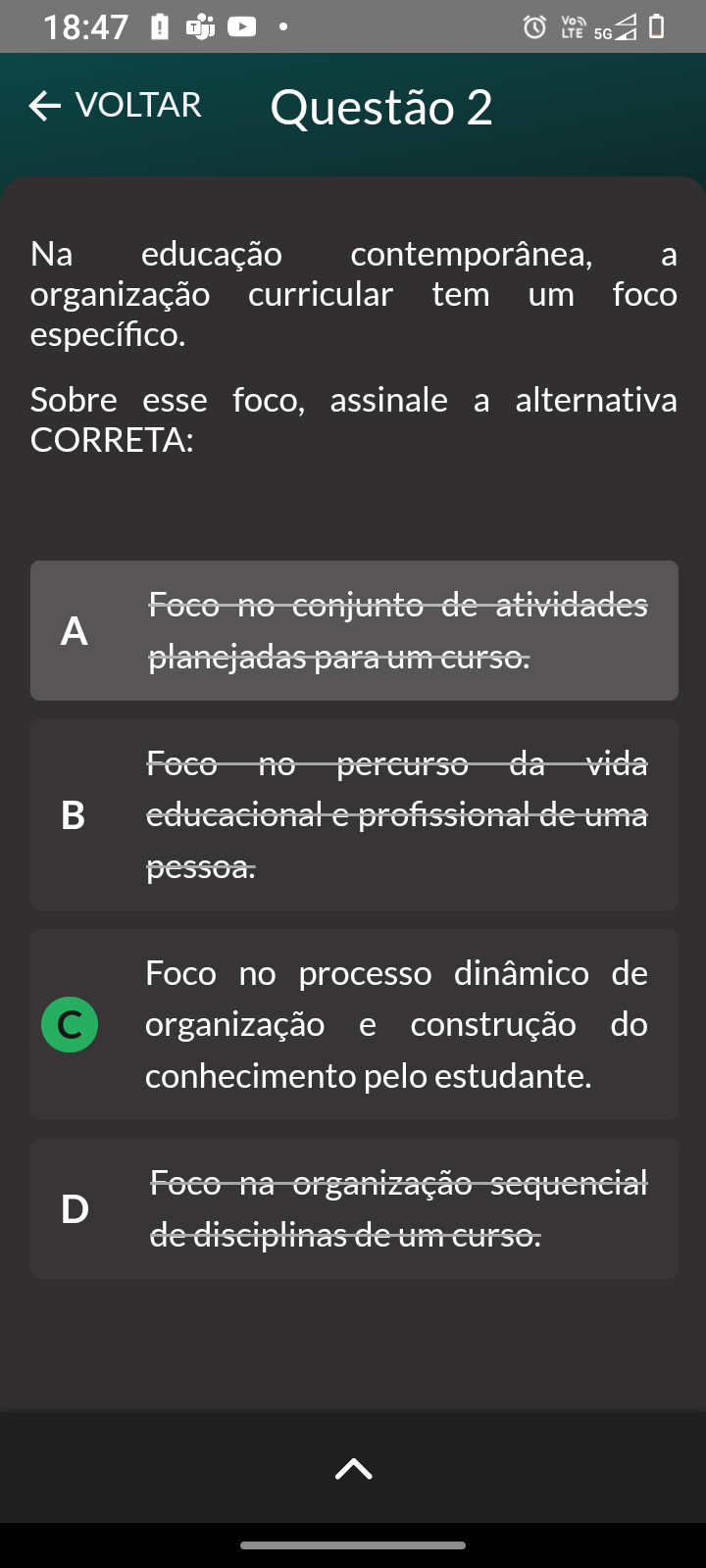 <p>18:47 ! LTE 5G 0 VOLTAR Questão 2 Na educação contemporânea, a organização curricular tem um foco específico. Sobre esse foco, assinale a alternativa CORRETA: Foco no conjunto de atividades A planejadas para um Foco no da vida B educacional e profissional de uma pessoa. Foco no processo dinâmico de C organização e construção do conhecimento pelo estudante. Foco na organização sequencial D de disciplinas de um curse.</p>