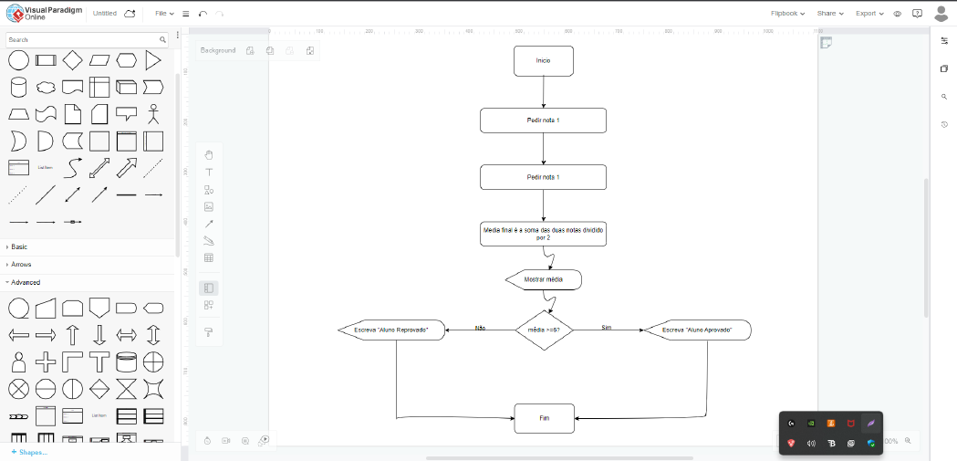 <p>Relatório Lógica e Matemática Computacional</p><p>Enrico Carvalho Souza</p><p>Introdução:</p><p>Neste projeto, desenvolvi um diagrama de blocos para o cálculo da média de um aluno, levando</p><p>em consideração a avaliação de duas provas. O objetivo foi criar um processo lógico que</p><p>permitisse a obtenção da média das notas das provas e a determinação do status de aprovação</p><p>do aluno com base na média calculada.</p><p>Prática:</p><p>Conclusão:</p><p>Em resumo, o diagrama de blocos desenvolvido proporcionou uma representação visual e lógica</p><p>do processo de cálculo da média das notas das provas e da decisão de aprovação ou reprovação</p><p>de um aluno. Esse projeto demonstrou a aplicação de conceitos de lógica de programação e</p><p>estruturas de controle condicionais para resolver um problema prático relacionado à avaliação</p><p>de desempenho acadêmico. Portanto, concluí que o diagrama de blocos atendeu aos objetivos</p><p>propostos de forma eficaz e ofereceu uma solução clara para a tomada de decisão sobre a</p><p>aprovação ou reprovação de um aluno com base em sua média de notas.</p>