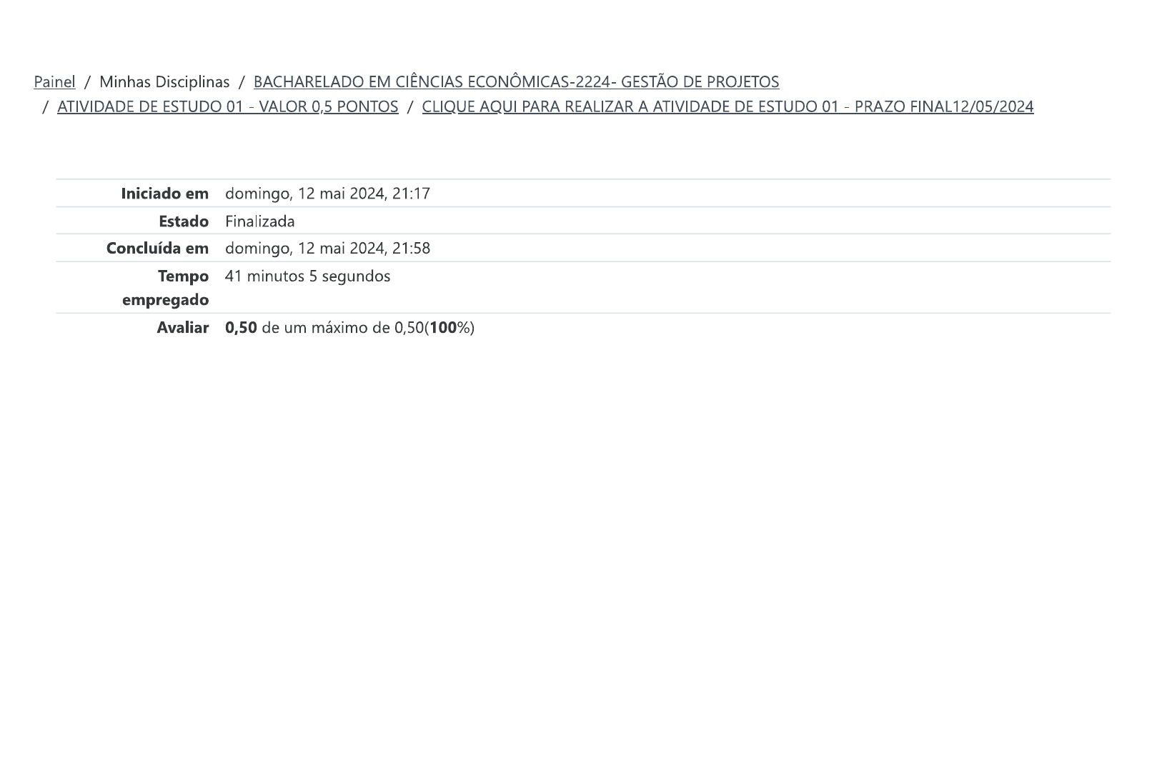 <p>Painel / Minhas Disciplinas / BACHARELADO EM CIÊNCIAS ECONÔMICAS-2224- GESTÃO DE PROJETOS / ATIVIDADE DE ESTUDO 01 - VALOR 0,5 PONTOS / CLIQUE AQUI PARA REALIZAR A ATIVIDADE DE ESTUDO 01 - PRAZO FINAL12/05/2024 Iniciado em domingo, 12 mai 2024, 21:17 Estado Finalizada Concluída em domingo, 12 mai 2024, 21:58 Tempo 41 minutos 5 segundos empregado Avaliar 0,50 de um máximo de 0,50(100%)</p><p>Questão 1 Completo Atingiu 0,05 de No entanto, dentro do período de um projeto são identificadas duas fases perfeitamente distintas do projeto. 0,05 Diante disto, analise a imagem a seguir: Planejamento S Plano do projeto n Alterar N N Aprovado S S Execução das atividades Controle Desvios N Resultado do projeto Com base na imagem, que fases do projeto são essas? Assinale a alternativa correta: a. Início e Fim. b. Planejamento e Administração. C. Controle e d. Planejamento e Execução. e. Execução e Revisão. Sua resposta está correta.</p><p>Questão 2 Completo Atingiu 0,05 de É comum em nosso dia a dia utilizarmos a palavra Projeto. Quem nunca iniciou um ano novo com vários projetos, não é 0,05 mesmo?! Mas afinal, você sabe o que é a Gestão de Projetos e como ela pode ser aplicada? Diante disso, analise as afirmativas abaixo: I. Projeto é um esforço permanente empreendido para criar um produto, serviço ou resultado exclusivo. II. Projeto é um processo único, consistindo em um grupo de atividades coordenadas e controladas com datas para início e término, empreendido para alcance de um objetivo conforme requisitos específicos, incluindo limitações de tempo, custo e recursos. III. Um Projeto individual pode fazer parte de uma estrutura de Projetos mais abrangente. IV. Os projetos devem possuir três características essenciais: ser único, temporário e progressivo. Assinale a alternativa correta: a. Apenas III e IV estão corretas. b. Apenas I e estão corretas. C. Apenas I, e III estão corretas. d. Apenas II, III e IV estão corretas. e. Todas as alternativas estão corretas. Sua resposta está correta.</p><p>Questão 3 Completo Assim, quem pensa em atuar como um gestor de projetos, isto é, em como entender, aplicar e, sobretudo, melhorar as Atingiu 0,05 de qualidades como profissional nesta área, seja atuando direta ou indiretamente, primeiramente deve ter consciência que 0,05 comandar um projeto é realizar a administração prática e realista de elementos em prol de um objetivo comum, que pode ser a construção de um imóvel, o desenvolvimento de um sistema, a construção de um modelo novo de carro, etc. Em suma, podemos afirmar que a gestão de projetos destaca-se pelos seguintes Deste modo, relacione o benefício/característica a sua respectiva justificativa: 1. Simplicidade de propósito ( ) o projeto pode ser descrito claramente em poucos termos: objetivos, escopo, limitações, recursos, administração, qualidade de resultados e assim por diante. 2. Clareza de propósito ( ) um projeto deve possuir metas e objetivos facilmente compreendidos. 3. Facilidade de mediação ( ) embora às vezes capazes de autogestão, as equipes de especialistas automotivadas reagem criticamente a certos estilos de liderança. 4. Conduz à motivação e ( ) o andamento do projeto pode ser moral da equipe monitorado por meio de sua comparação com metas e padrões (indicadores) definidos de desempenho. 5. Sensibilidade ao estilo de ( ) os projetos podem ser protegidos de ação administração e liderança hostil ou atividade de informação para defesa, pesquisa, desenvolvimento de produto ou segurança de produtos sensíveis ao mercado, ou de alto valor.</p><p>6. Favorece a discrição e a ( ) a novidade e o interesse específico do segurança trabalho do projeto devem ser atraentes às pessoas e leva à formação de equipes entusiásticas e automotivadas. 7. Mobilidade os projetos podem ser executados em locais remotos, países estrangeiros e assim por diante; são independentes. Assinale a alternativa correta: a. 2, 1, 5, 3, 6, 4, 7. b. 7, 6, 5, 4, 3, 2, 1. C. 2, 4, 5, 6, 7, 1, 3. d. 1, 2, 3, 4, 5, 6, 7. e. 5, 2, 7, 4, 1, 3, 6. Sua resposta está correta.</p><p>Questão 4 Completo Atingiu 0,05 de Assim, quem pensa em atuar como um gestor de projetos, isto é, em como entender, aplicar e, sobretudo, melhorar as 0,05 qualidades como profissional nesta área, seja atuando direta ou indiretamente, primeiramente deve ter consciência que comandar um projeto é realizar a administração prática e realista de elementos em prol de um objetivo comum, que pode ser a construção de um imóvel, o desenvolvimento de um sistema, a construção de um modelo novo de carro, etc. Posto isto, analise as afirmativas abaixo: I. Todo projeto tem início, meio e fim; II. As características do projeto são mais detalhadas à medida que em que é maior o entendimento do produto ou serviço. III. Em suma, gerir um projeto é alocar recursos necessários (material, pessoas, financeiro) para tal e se planejar de alguma forma; é administrar. IV. A Gestão de Projetos visa otimizar o tempo, o custo e a qualidade de um projeto, buscando maneiras efetivas de se atingir um objetivo. Assinale a alternativa correta: a. Todas as alternativas estão corretas. b. Apenas II, III e IV estão corretas. C. Apenas e estão corretas. d. Apenas I, e III estão corretas. e. Apenas III e IV estão corretas. Sua resposta está correta.</p><p>Questão 5 Completo Atingiu 0,05 de Baseado no PMI, o escopo pode ser compreendido como a soma dos produtos, serviços e resultados a serem fornecidos 0,05 na forma de um projeto. Consiste na definição do trabalho que deve ser executado para entregar o produto, serviço ou resultado com as características e funções especificadas. Assim sendo, quanto aos processos relacionados ao escopo, analise as afirmativas abaixo: I. Desenvolvimento conceitual: definição das linhas gerais sobre o que o produto do Projeto irá fazer; II. Desenvolvimento e controle do escopo: do