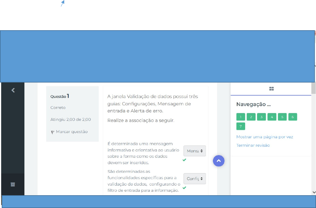 <p>INTRODUÇÃO A INFORMATICA VIII</p><p>Iniciado em</p><p>Friday, 23 Aug 2024, 23:36</p><p>Estado</p><p>Finalizada</p><p>Concluída em</p><p>Friday, 23 Aug 2024, 23:50</p><p>Tempo empregado</p><p>14 minutos 38 segundos</p><p>Avaliar</p><p>10,00 de um máximo de 10,00(100%)</p><p>Questão 2</p><p>Correto</p><p>Atingiu 1,75 de 1,75</p><p>Marcar questão</p><p>Texto da questão</p><p>Essa função significa voltar ele aos moldes iniciais do template que segue, sem perda do conteúdo que já foi editado. Marque a única alternativa correta.</p><p>Escolha uma opção:</p><p>a. Reorganizar um slide</p><p>b. Redefinir um slide</p><p>c. Reordenar um slide</p><p>d. Copiar um slide</p><p>Questão 3</p><p>Correto</p><p>Atingiu 1,00 de 1,00</p><p>Marcar questão</p><p>Texto da questão</p><p>Podemos afirmar que o Microsoft Excel possui uma interação de dados e filtros bem complexos de utilização, porém bem poderosa em termos de performance.</p><p>Escolha uma opção:</p><p>Verdadeiro</p><p>Falso</p><p>Questão 4</p><p>Correto</p><p>Atingiu 1,75 de 1,75</p><p>Marcar questão</p><p>Texto da questão</p><p>Essa função tem a finalidade de trocar um slide de lugar com outro bastando simplesmente clicar nele e arrastá-lo entre dois outros slides.</p><p>Marque a única alternativa correta.</p><p>Escolha uma opção:</p><p>a. Copiar um slide</p><p>b. Reordenar um slide</p><p>c. Reorganizar um slide</p><p>d. Redefinir um slide Questão 5</p><p>Correto</p><p>Atingiu 1,50 de 1,50</p><p>Marcar questão</p><p>Texto da questão</p><p>É determinada qual a fonte de dados que servirá de base para os valores, que ficarão como opção de preenchimento das células.</p><p>Escolha uma opção:</p><p>a. Alerta de erro</p><p>b. Fonte</p><p>c. Lista</p><p>d. Permissão</p><p>Questão 6</p><p>Correto</p><p>Atingiu 1,75 de 1,75</p><p>Marcar questão</p><p>Texto da questão</p><p>Em função de terem sido vistos apenas funcionalidades de inclusão de slides e informações, até o momento só foi utilizada a área de conteúdo do Microsoft PowerPoint.</p><p>Escolha uma opção:</p><p>a. Composição inicial da tela</p><p>b. Gerenciamento de slides</p><p>c. Templates padrão</p><p>d. Inclusão de conteúdo</p><p>Questão 7</p><p>Correto</p><p>Atingiu 1,50 de 1,50</p><p>Marcar questão</p><p>Texto da questão</p><p>Podemos afirmar que na guia Alerta de erro, além da mensagem propriamente dita, podem ser configurados outros componentes visuais de comunicação com o usuário, como é o caso da opção Título, que configura ícones para a mensagem já conhecidos pelo usuário, comumente utilizados em mensagens de entrada do sistema operacional.</p><p>Escolha uma opção:</p><p>Verdadeiro</p><p>Falso</p><p>image4.wmf</p><p>image1.png</p><p>image2.wmf</p><p>image3.wmf</p>