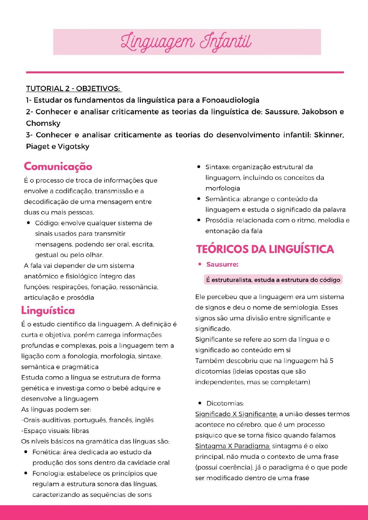 <p>Linguagem Infantil TUTORIAL 2 - OBJETIVOS: 1- Estudar os fundamentos da linguística para a Fonoaudiologia 2- Conhecer e analisar criticamente as teorias da linguística de: Saussure, Jakobson e Chomsky 3- Conhecer e analisar criticamente as teorias do desenvolvimento infantil: Skinner, Piaget e Vigotsky Comunicação Sintaxe: organização estrutural da É processo de troca de informações que linguagem, incluindo os conceitos da envolve a codificação, transmissão e a morfologia decodificação de uma mensagem entre Semântica: abrange conteúdo da duas ou mais pessoas. linguagem e estuda significado da palavra Código: envolve qualquer sistema de Prosódia: relacionada com ritmo, melodia e sinais usados para transmitir entonação da fala mensagens, podendo ser oral, escrita, TEÓRICOS DA LINGUÍSTICA gestual ou pelo olhar A fala vai depender de um sistema Sausurre: anatômico e fisiológico íntegro das É estruturalista, estuda a estrutura do código funções: respirações, fonação, ressonância, articulação e prosódia Ele percebeu que a linguagem era um sistema Linguística de signos e deu nome de semiologia. Esses signos são uma divisão entre significante e É estudo científico da linguagem. A definição é significado. curta e objetiva, porém carrega informações Significante se refere ao som da língua e profundas e complexas, pois a linguagem tem a significado ao conteúdo em si ligação com a fonologia, morfologia, sintaxe, Também descobriu que na linguagem há 5 semântica e pragmática dicotomias (ideias opostas que são Estuda como a língua se estrutura de forma independentes, mas se completam) genética e investiga como bebê adquire e desenvolve a linguagem Dicotomias: As línguas podem ser: Significado X Significante: a união desses termos -Orais-auditivas: português, francês, inglês acontece no cérebro, que é um processo -Espaço visuais: libras psíquico que se torna físico quando falamos Os níveis básicos na gramática das línguas são: Sintagma X Paradigma: sintagma é eixo Fonética: área dedicada ao estudo da principal, não muda contexto de uma frase produção dos sons dentro da cavidade oral (possui coerência), já paradigma é que pode Fonologia: estabelece os princípios que ser modificado dentro de uma frase regulam a estrutura sonora das línguas, caracterizando as sequências de sons</p><p>Linguagem Infantil Língua X Fala: A língua é resultado de Fática: tem propósito de prolongar a indivíduos que praticam a fala. A fala é comunicação individual. Metalinguística: desempenha um papel Diacronia X Sincronia: a diacronia é a importante na linguagem cotidiana, quando pesquisa histórica de como a língua evolui remetente ou destinatário tem necessidade de e muda com passar dos anos. A verificar se estão usando mesmo código sincronia é a descoberta de como a língua Chomsky: funciona em um determinado tempo Linearidade X Arbitrariedade: a linearidade Teoria geravista (gera, gera, produz, produz) é focada na ordem do significante, é Ele propõe um estudo da sintaxe das línguas quando sentido da frase muda ou deixa naturais e que a língua seja entendida com um de existir. A arbitrariedade funciona tipo objeto mental 'Por que um passarinho tem esse Trata a língua como um sistema de princípios da alguém decidiu que seria dessa maneira, mente humana que tem um módulo linguístico ou seja, tem um signo e um motivado. que é responsável por formar e interpretar Jakobson: expressões linguísticas Para ele, estado inicial da faculdade da É fundamentalista, estuda a forma como o linguagem de todas as crianças é uniforme e se código é passado constitui de princípios linguísticos determinados Ele buscava compreender com qual finalidade é biologicamente, que podem ser rígidos, utilizada a língua, ou seja, a função da linguagem invariáveis ou aberto na comunicação entre remetente e -Inatista: a linguagem nasce com a pessoa destinatário. principal objetivo dele era definir (teoria chave-fechadura) lugar da função poética com relação as demais -Competência: todos tem igual funções da linguagem. alguns são melhores -Discorda de Skinner Funções da linguagem: TEÓRICOS DA LINGUÍSTICA Emotiva ou Expressiva: tem objetivo de expressar emoções, sentimentos e visa uma Skinner: expressão direta de quem fala em relação aquilo Teoria behaviorista: comportamento infantil é que está falando modificado através de estímulos de outras pessoas Conativa: tem sua atenção centrada no ou no meio em que a criança vive destinatário. É empregada quando remetente Se não molda comportamento, não molda a tem a finalidade de traduzir a realidade para linguagem destinatário Os estímulos são classificados como: Poética: A ênfase recai sobre processo de 1. Reforço: aumento da probabilidade de elaboração da própria mensagem ocorrência do evento 2. Inibição: é estímulo que descreve a probabilidade de ocorrências do evento</p><p>Linguagem Infantil Essa teoria defende a ideia de que os pais No segundo mês, bebê começa a ter são provedores de modelos e realizam comportamentos involuntários, como colocar os reforços e inibições que irão possibilitar a dedos na boca evolução da criança desde os sons No final do primeiro ano, bebê já consegue produzidos a partir do nascimento até distinguir que é certo do que é errado. No final uma linguagem organizada em nível de desse estágio há desenvolvimento do discurso pensamento. Estágio fase dos 2 aos 7 anos Linguagem; modelo + imitação + prática \repetição + reforço seletivo Surge conceito da função simbólica, a criança vai articular objetos ao seu redor e consegue ter Essa teoria traz muitas contribuições percepção dos acontecimentos que ocorrem quando se refere aps programas de perto dela estimulação e reabilitação dos distúrbios Estágio pré-operatório concreto: fase dos 7 de comunicação aos 11 anos A criança j