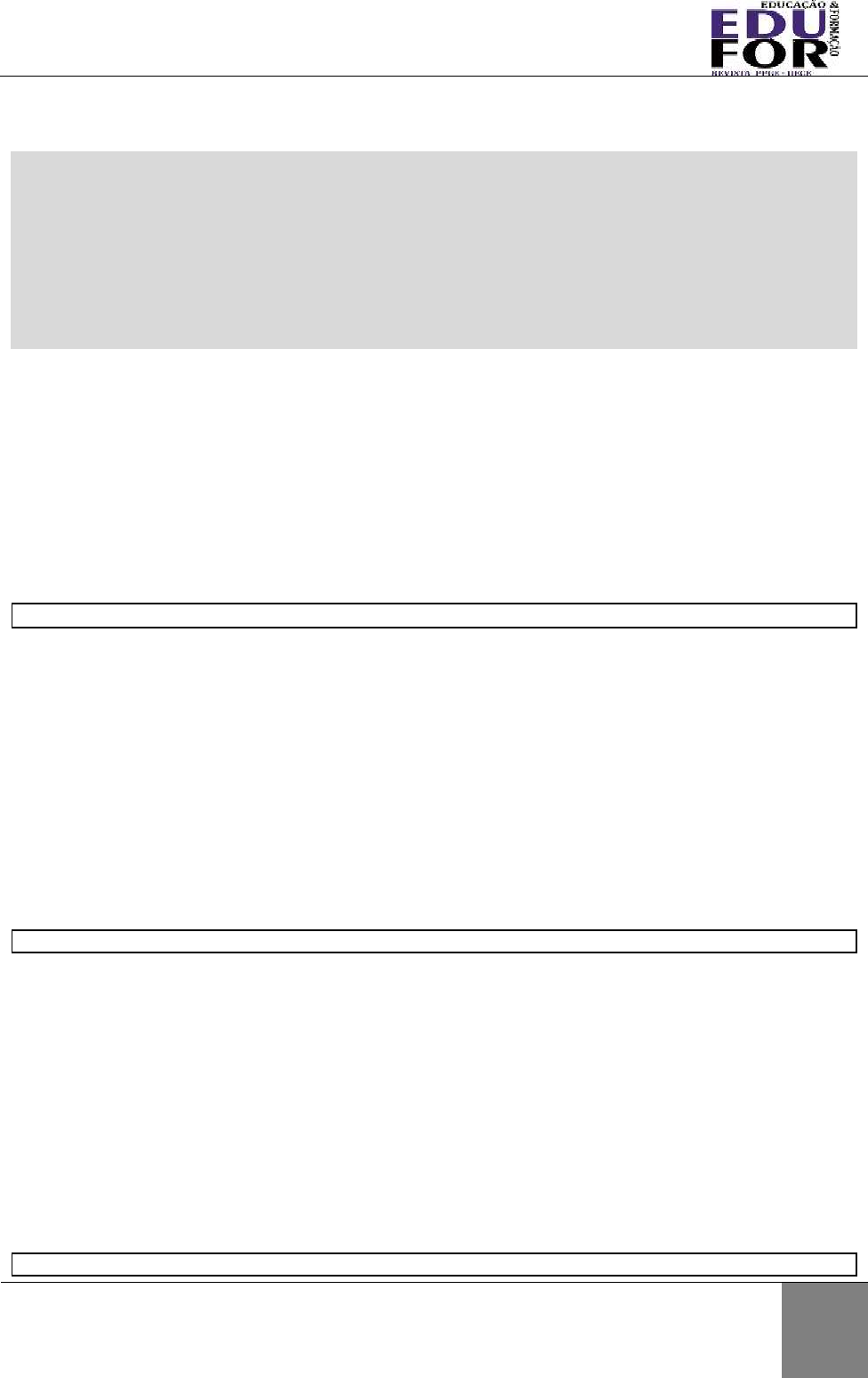 <p>EDUCAÇÃO & FORMAÇÃO</p><p>Revista do Programa de Pós-Graduação em Educação</p><p>da Universidade Estadual do Ceará (UECE)</p><p>Educação & Formação, Fortaleza, v. 4, n. 10, p. 131-147, jan./abr. 2019</p><p>DOI: https://doi.org/10.25053/redufor.v4i10.851</p><p>http://seer.uece.br/redufor</p><p>ISSN: 2448-3583</p><p>131</p><p>PRODUÇÃO DO CONHECIMENTO NA UNIVERSIDADE: REFLEXÕES E</p><p>INCUMBÊNCIAS EM TORNO DO TRABALHO DE CONCLUSÃO DE CURSO</p><p>GEVEHR, Daniel Luciano (Brasil, Taquara, Rio Grande do Sul)1*;</p><p>FETTER, Shirlei Alexandra (Brasil, Parobé, Rio Grande do Sul)2**;</p><p>KARPINSKI, Raquel Lemes (Brasil, Taquara, Rio Grande do Sul)1***</p><p>1Faculdades Integradas de Taquara</p><p>2Rede Municipal de Parobé</p><p>https://orcid.org/0000-0003-1815-4457*</p><p>https://orcid.org/0000-0001-5172-447X**</p><p>https://orcid.org/0000-0003-1742-3731***</p><p>RESUMO</p><p>Este artigo tem por objetivo discutir sobre a</p><p>contribuição da pesquisa durante o processo de</p><p>construção dos trabalhos de conclusão nos cursos</p><p>de licenciaturas de História e Pedagogia. A temática</p><p>aborda a concepção de professor pesquisador,</p><p>buscando compreender a relação estabelecida</p><p>durante o processo de formação. O estudo conta</p><p>com doze estudantes dos cursos de História e</p><p>Pedagogia de duas Instituições de Ensino Superior.</p><p>Apresenta uma análise qualitativa, baseada na</p><p>investigação exploratória. Já os resultados apontam</p><p>que o processo de pesquisa contribuiu para</p><p>compreensões atribuídas ao trabalho de conclusão</p><p>de curso pelos entrevistados, bem como a</p><p>necessidade de relação com a pesquisa entre as</p><p>disciplinas. Conclui-se que há a necessidade de</p><p>averiguar as condições de racionalidades que</p><p>emergem da prática metodológica realizada nos</p><p>cursos de licenciaturas para que a pesquisa colabore</p><p>com o processo formativo.</p><p>PALAVRAS-CHAVE: Atividade de pesquisa. Formação. Conhecimento científico.</p><p>KNOWLEDGE PRODUCTION IN THE UNIVERSITY: REFLECTIONS AND</p><p>OUTBREAKS AROUND THE WORK OF COURSE CONCLUSION</p><p>ABSTRACT</p><p>This article aims to present the contribution of the</p><p>research during the process of construction of the</p><p>conclusion work in the degree courses in History</p><p>and Pedagogy. The theme addresses the design of</p><p>a researcher teacher, with the purpose of</p><p>understanding the relationship established during</p><p>the training process. The study has twelve</p><p>undergraduate students from the History and</p><p>Pedagogy courses of two Higher Education</p><p>Institutions. It presents a qualitative analysis, which</p><p>was based on exploratory research. The results</p><p>show that the research process contributed to the</p><p>understandings attributed to completion of course</p><p>work by the interviewees as well as the need for a</p><p>relationship with the research among the</p><p>disciplines. It is concluded that there is a need to</p><p>ascertain the conditions of rationalities that emerge</p><p>from the methodological practice carried out in the</p><p>undergraduate courses so that the research</p><p>collaborates with the formative process.</p><p>KEYWORDS: Search activity. Formation. Scientific knowledge.</p><p>PRODUCCIÓN DEL CONOCIMIENTO EN LA UNIVERSIDAD: REFLEXIONES E</p><p>INCUMBENCIAS EN TORNO DEL TRABAJO DE CONCLUSIÓN DE CURSO</p><p>RESUMEN</p><p>Se objetiva presentar la contribución de la</p><p>investigación durante el proceso de construcción de</p><p>los trabajos de conclusión en los cursos de</p><p>licenciaturas de Historia y Pedagogía. La temática</p><p>aborda la concepción de profesor investigador con</p><p>el propósito de comprender la relación establecida</p><p>durante el proceso de formación. El estudio cuenta</p><p>con doce estudiantes de los cursos de Historia y</p><p>Pedagogía de dos Instituciones de Enseñanza</p><p>Superior. Presenta un análisis cualitativo, basado</p><p>en la investigación exploratoria. Los resultados</p><p>apuntan que el proceso de investigación contribuye</p><p>para las comprensiones atribuidas al trabajo de</p><p>conclusión de curso por los entrevistados, así como</p><p>la necesidad de relación con la investigación entre</p><p>las asignaturas. Se concluye que hay la necesidad</p><p>de averiguar las condiciones de racionalidades que</p><p>emergen de la práctica metodológica realizada en</p><p>los cursos de licenciaturas para que la investigación</p><p>colabore con el proceso formativo.</p><p>PALABRAS CLAVE: Actividad de investigación. Entrenamiento. Conocimiento científico.</p><p>EDUCAÇÃO & FORMAÇÃO</p><p>Revista do Programa de Pós-Graduação em Educação</p><p>da Universidade Estadual do Ceará (UECE)</p><p>Educação & Formação, Fortaleza, v. 4, n. 10, p. 131-147, jan./abr. 2019</p><p>DOI: https://doi.org/10.25053/redufor.v4i10.851</p><p>http://seer.uece.br/redufor</p><p>ISSN: 2448-3583</p><p>132</p><p>1 INTRODUÇÃO</p><p>Discute-se a relação entre pesquisa e prática docente, as quais têm se</p><p>constituído uma preocupação central na formação de professores na</p><p>contemporaneidade. Tal inquietude provoca as universidades a uma revisão e reflexão</p><p>sobre sua estrutura pedagógica e suas concepções epistemológicas, a fim de se</p><p>adequarem às exigências de formação e preparação de professores habilitados para</p><p>atuarem no contexto contemporâneo.</p><p>A formação do professor pesquisador tem sido acolhida por inúmeros estudiosos</p><p>como uma forma de promover incremento profissional docente, para que ele possa</p><p>assumir seu papel como agente de transformação social, uma vez que o seu</p><p>envolvimento com a pesquisa poderá ajudá-lo a conhecer a realidade e a ter</p><p>posicionamento crítico em relação ao seu fazer e às condições para o exercício da sua</p><p>profissão. Perceber como ocorre e