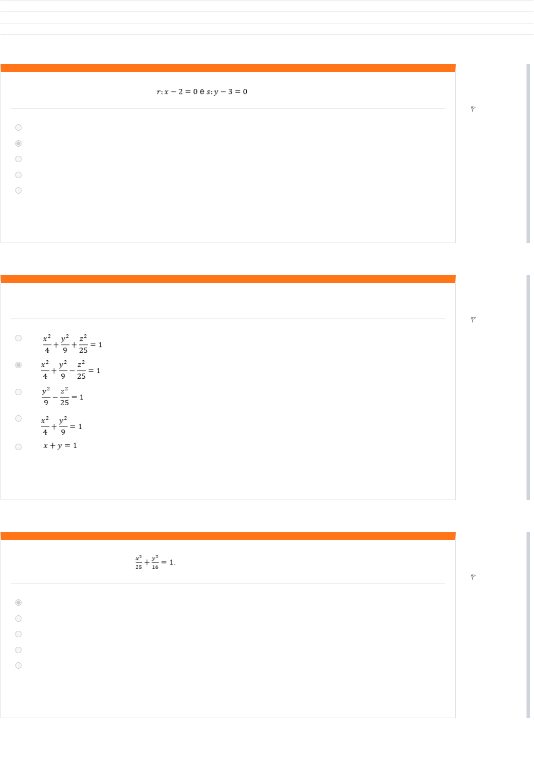 <p>Questão 1</p><p>Completo</p><p>Vale 0,60 ponto(s).</p><p>Marcar questão</p><p>Questão 2</p><p>Completo</p><p>Vale 0,60 ponto(s).</p><p>Marcar questão</p><p>Questão 3</p><p>Completo</p><p>Vale 0,60 ponto(s).</p><p>Marcar questão</p><p>Iniciado em sexta, 30 ago 2024, 20:52</p><p>Estado Finalizada</p><p>Concluída em sexta, 30 ago 2024, 21:08</p><p>Tempo</p><p>empregado</p><p>15 minutos 20 segundos</p><p>Determine o ângulo formado entre as retas</p><p>a. 30º.</p><p>b. 45º.</p><p>c. 90º.</p><p>d. 120º.</p><p>e. 60º.</p><p>Sua resposta está correta.</p><p>Qual das equações abaixo representa um hiperboloide de uma folha?</p><p>a.</p><p>b.</p><p>c.</p><p>d.</p><p>e.</p><p>Sua resposta está correta.</p><p>Determine a excentricidade da elipse</p><p>a. 0,6.</p><p>b. 0,7.</p><p>c. 0,4.</p><p>d. 0,3.</p><p>e. 0,5.</p><p>Sua resposta está correta.</p><p>30/08/2024, 21:08 AA4 - CLIQUE AQUI PARA REALIZAR A PROVA CURRICULAR - DIA 30/08/2024 A 01/09/2024 - VALOR 6,0 PONTOS - 1ª …</p><p>https://www.eadunifatecie.com.br/mod/quiz/review.php?attempt=11635903&cmid=1466707 1/4</p><p>Questão 4</p><p>Completo</p><p>Vale 0,60 ponto(s).</p><p>Marcar questão</p><p>Questão 5</p><p>Completo</p><p>Vale 0,60 ponto(s).</p><p>Marcar questão</p><p>Questão 6</p><p>Completo</p><p>Vale 0,60 ponto(s).</p><p>Marcar questão</p><p>Questão 7</p><p>Completo</p><p>Vale 0,60 ponto(s).</p><p>Marcar questão</p><p>Qual das matrizes abaixo caracteriza uma matriz quadrada?</p><p>a.</p><p>b.</p><p>c.</p><p>d.</p><p>e.</p><p>Sua resposta está correta.</p><p>Determine a norma do vetor</p><p>a.</p><p>b. 2</p><p>c.</p><p>d.</p><p>e.</p><p>Sua resposta está correta.</p><p>Em relação à representação geométrica de plano cartesiano R , o que podemos afirmar?</p><p>a. Identifica-se geometricamente um plano cartesiano, com duas retas coincidentes.</p><p>b. Identifica-se geometricamente um plano cartesiano, com duas retas paralelas.</p><p>c. Identifica-se geometricamente um plano cartesiano, com duas retas orientadas, uma na vertical e outra na horizontal.</p><p>d. Identifica-se geometricamente um plano cartesiano, com três retas.</p><p>e. Identifica-se geometricamente um plano cartesiano, com dois círculos.</p><p>2</p><p>Sua resposta está correta.</p><p>Qual das equações abaixo representa um elipsoide?</p><p>a.</p><p>b.</p><p>30/08/2024, 21:08 AA4 - CLIQUE AQUI PARA REALIZAR A PROVA CURRICULAR - DIA 30/08/2024 A 01/09/2024 - VALOR 6,0 PONTOS - 1ª …</p><p>https://www.eadunifatecie.com.br/mod/quiz/review.php?attempt=11635903&cmid=1466707 2/4</p><p>Questão 8</p><p>Completo</p><p>Vale 0,60 ponto(s).</p><p>Marcar questão</p><p>Questão 9</p><p>Completo</p><p>Vale 0,60 ponto(s).</p><p>Marcar questão</p><p>Questão 10</p><p>Completo</p><p>Vale 0,60 ponto(s).</p><p>Marcar questão</p><p>c.</p><p>d.</p><p>e.</p><p>Sua resposta está correta.</p><p>Qual das equações abaixo representa um paraboloide elíptico?</p><p>a.</p><p>b.</p><p>c.</p><p>d.</p><p>e.</p><p>Sua resposta está correta.</p><p>Dada a equação da hipérbole determine a excentricidade.</p><p>a. 3,6</p><p>b. 1,2</p><p>c. 1,6</p><p>d. 2,6</p><p>e. 0,6</p><p>Sua resposta está correta.</p><p>Calcular o determinante da matriz considerando que a mesma é de Vandermonde.</p><p>a.</p><p>b.</p><p>c.</p><p>d.</p><p>30/08/2024, 21:08 AA4 - CLIQUE AQUI PARA REALIZAR A PROVA CURRICULAR - DIA 30/08/2024 A 01/09/2024 - VALOR 6,0 PONTOS - 1ª …</p><p>https://www.eadunifatecie.com.br/mod/quiz/review.php?attempt=11635903&cmid=1466707 3/4</p><p>e.</p><p>Sua resposta está correta</p><p>30/08/2024, 21:08 AA4 - CLIQUE AQUI PARA REALIZAR A PROVA CURRICULAR - DIA 30/08/2024 A 01/09/2024 - VALOR 6,0 PONTOS - 1ª …</p><p>https://www.eadunifatecie.com.br/mod/quiz/review.php?attempt=11635903&cmid=1466707 4/4</p>