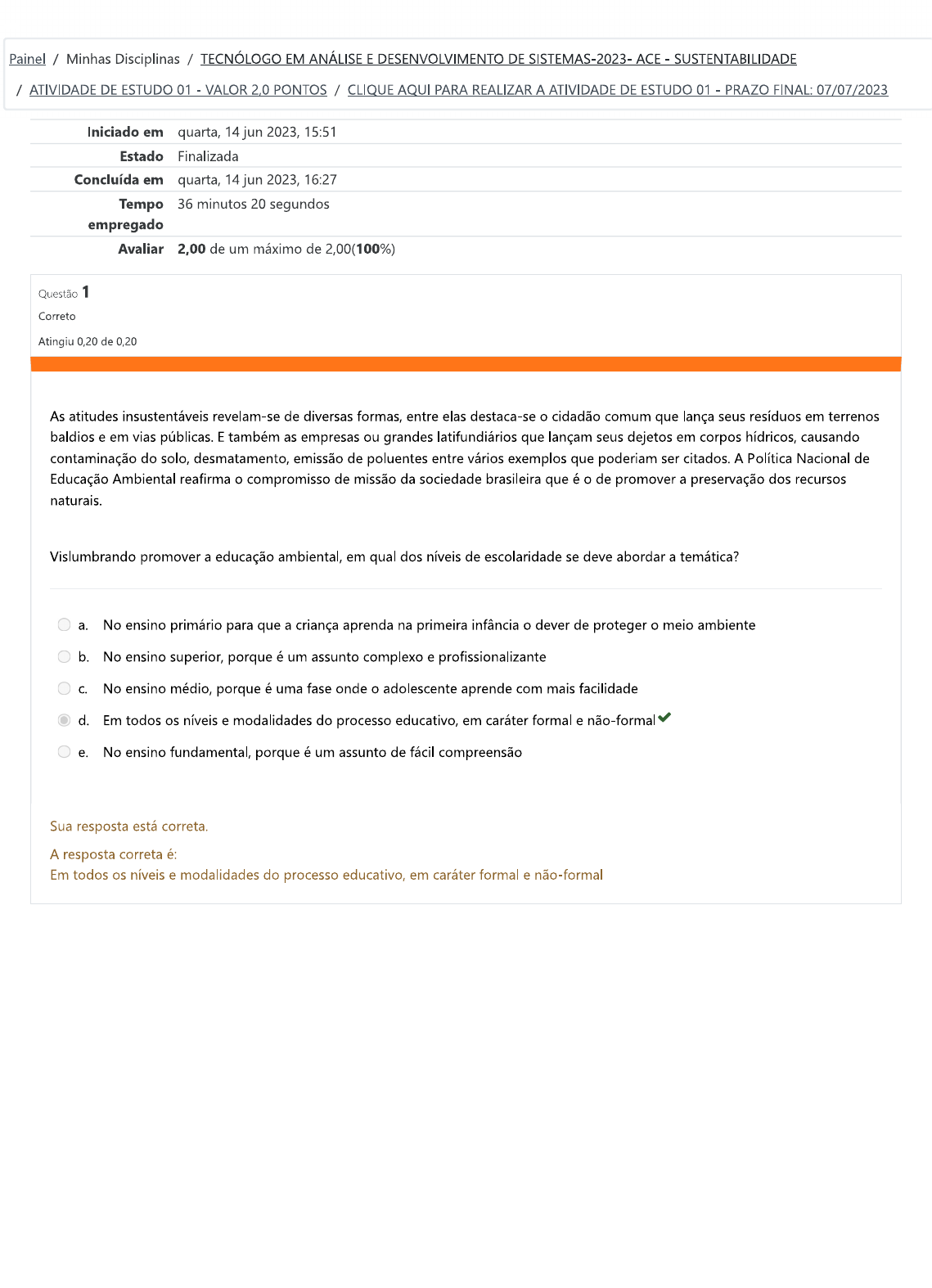 <p>Painel / Minhas Disciplinas / TECNÓLOGO EM ANÁLISE E DESENVOLVIMENTO DE SISTEMAS-2023- ACE - SUSTENTABILIDADE / ATIVIDADE DE ESTUDO 01 - VALOR 2,0 PONTOS / CLIQUE PARA REALIZAR A ATIVIDADE DE ESTUDO 01 - PRAZO FINAL: 07/07/2023 Iniciado em quarta, 14 jun 2023, 15:51 Estado Finalizada Concluída em quarta, 14 jun 2023, 16:27 Tempo 36 minutos 20 segundos empregado Avaliar 2,00 de um máximo de 2,00(100%) Questão 1 Correto Atingiu 0,20 de 0,20 As atitudes insustentáveis revelam-se de diversas formas, entre elas destaca-se o cidadão comum que lança seus resíduos em terrenos baldios e em vias públicas. E também as empresas ou grandes latifundiários que lançam seus dejetos em corpos hídricos, causando contaminação do solo, desmatamento, emissão de poluentes entre vários exemplos que poderiam ser citados. A Política Nacional de Educação Ambiental reafirma o compromisso de missão da sociedade brasileira que é o de promover a preservação dos recursos naturais. Vislumbrando promover a educação ambiental, em qual dos níveis de escolaridade se deve abordar a temática? a. No ensino primário para que a criança aprenda na primeira infância o dever de proteger o meio ambiente b. No ensino superior, porque é um assunto complexo e profissionalizante C. No ensino médio, porque é uma fase onde o adolescente aprende com mais facilidade d. Em todos os níveis e modalidades do processo educativo, em caráter formal e não-formal e. No ensino fundamental, porque é um assunto de fácil compreensão Sua resposta está correta. A resposta correta é: Em todos os níveis e modalidades do processo educativo, em caráter formal e não-formal</p><p>Questão 2 Correto Atingiu 0,20 de 0,20 No contexto contemporâneo o debate sobre meio ambiente faz parte do dia a dia das pessoas. Isso ocorre porque a vida humana depende da disponibilidade de recursos naturais. Assim, quando ocorre degradação sobre o meio ambiente a sociedade acaba sendo afetada de forma direta ou indireta, fator que colabora para a perda da qualidade de vida. Observa-se então que existe uma relação de dependência entre a vida humana e a disponibilidade de recursos naturais. Sobre o conceito de meio ambiente assinale as alternativas corretas: I) A partir da visão do desenvolvimento sustentável o meio ambiente passa a ser visto como um organismo vivo; II) meio ambiente é definido como o conjunto de condições, leis, influências e interações de ordem física, química e biológica, que permite, abriga e rege a vida em todas as suas formas; III) É o local onde ocorre a inter-relação entre os seres bióticos e abióticos em seus mais variados sentidos; IV) Meio ambiente define-se como recursos biológicos que não exerce influência sobre os recursos econômicos e sociais. a. Todas as afirmativas estão corretas b. Apenas I e estão corretas C. Apenas e IV estão corretas d. Apenas I, e III estão corretas e. Apenas II, III e IV estão corretas Sua resposta está correta. A resposta correta é: Apenas I, e III estão corretas</p><p>Questão 3 Correto Atingiu 0,20 de 0,20 desenvolvimento sustentável, assume uma visão crítica ao modelo de desenvolvimento adotado pelos países industrializados e reproduzido pelas nações em desenvolvimento, destacando que progresso econômico e social não pode ser alicerçado na exploração indiscriminada e devastadora da natureza (IPIRANGA; GODOY; BRUNSTEIN, 2011). IPIRANGA, A. S. R; GODOY A. S; BRUNSTEINM, J. Introdução. Edição especial. São Paulo: Revista de Administração Mackenzie, 2011. Disponível em: 31 jan. 2023. Sobre o desenvolvimento sustentável assinale a alternativa correta: I) Além da conferência de Estocolmo ocorreu também a reunião conhecida como RIO +20 ou Eco 92, ambas foram eventos globais que tiveram por finalidade discutir ao nível global o meio ambiente. II) A sustentabilidade deve contemplar a equidade social e a qualidade de vida dessa geração e das próximas, porque a pobreza é provocadora de agressões ambientais. III) No modelo de desenvolvimento sustentável a questão social não deve ser levada em consideração. Assinale a alternativa correta: a. Apenas e III estão corretas b. Apenas II correta C. Apenas e estão corretas d. Apenas está correta e. Apenas e III estão corretas Sua resposta está correta. A resposta correta é: Apenas e estão corretas</p><p>Questão 4 Correto Atingiu 0,20 de 0,20 No contexto não é mais possível empreender sem que haja vistas ao meio ambiente, seja por meio da conscientização ambiental, concorrência de mercado ou por imposição legal. Esferas tidas como antagônicas (Economia e Meio Ambiente) passam a ser aliadas atuando com objetivos incomuns. Assim, através de qual modelo de desenvolvimento é possível conciliar preservação do meio ambiente e desenvolvimento econômico? a. Desenvolvimento extrativista b. Desenvolvimento ecológico C. Desenvolvimento sustentável d. Progresso ambiental e. Conservação ecológica Sua resposta está correta. A resposta correta é: Desenvolvimento sustentável Questão 5 Correto Atingiu 0,20 de 0,20 A lei 9.433/1997 é conhecida como Lei das Águas, esta legislação tem por objetivo assegurar à atual e às futuras gerações a necessária disponibilidade de água, em padrões de qualidade adequados aos respectivos usos, a utilização racional e integrada dos recursos hídricos, incluindo o transporte aquaviário, com vistas ao desenvolvimento sustentável, a prevenção e a defesa contra eventos hidrológicos críticos de origem natural ou decorrentes do uso inadequado dos recursos naturais, incentivar e promover a captação, a preservação e o aproveitamento de águas pluviais (BRASIL, 1997). Sobre esta lei analise as seguintes afirmativas e marque a alternativa correta: a. uso múltiplo das águas deve ser combatido para que ocorra a economia do recurso hídrico b. Em caso de escassez de recursos hídricos o uso prioritário a irrigação e