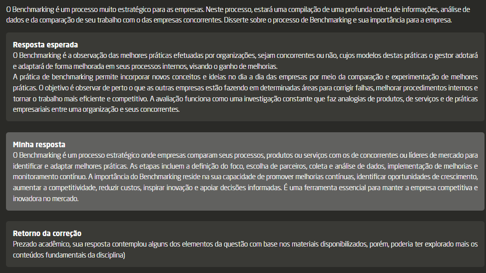 <p>Benchmarking é um processo muito estratégico para as empresas. Neste processo, estará uma compilação de uma profunda coleta de informações, análise de dados e da comparação de seu trabalho com das empresas concorrentes. Disserte sobre processo de Benchmarking e sua importância para a empresa. Resposta esperada 0 Benchmarking é a observação das melhores práticas efetuadas por organizações, sejam concorrentes ou não, cujos modelos destas práticas gestor adotará e adaptará de forma melhorada em seus processos internos, visando ganho de melhorias. A prática de benchmarking permite incorporar novos conceitos e ideias no dia a dia das empresas por meio da comparação e experimentação de melhores práticas. objetivo é observar de perto que as outras empresas estão fazendo em determinadas áreas para corrigir falhas, melhorar procedimentos internos e tornar trabalho mais eficiente e competitivo. A avaliação funciona como uma investigação constante que faz analogias de produtos, de serviços e de práticas empresariais entre uma organização e seus concorrentes. Minha resposta 0 Benchmarking é um processo estratégico onde empresas comparam seus processos, produtos ou serviços com os de concorrentes ou líderes de mercado para identificar e adaptar melhores práticas. As etapas incluem a definição do foco, escolha de parceiros, coleta e análise de dados, implementação de melhorias e monitoramento contínuo. A importância do Benchmarking reside na sua capacidade de promover melhorias identificar oportunidades de crescimento, aumentar a competitividade, reduzir custos, inspirar inovação e apoiar decisões informadas. É uma ferramenta essencial para manter a empresa competitiva e inovadora no mercado. Retorno da correção Prezado acadêmico, sua resposta contemplou alguns dos elementos da questão com base nos materiais disponibilizados, porém, poderia ter explorado mais os conteúdos fundamentais da disciplina)</p>