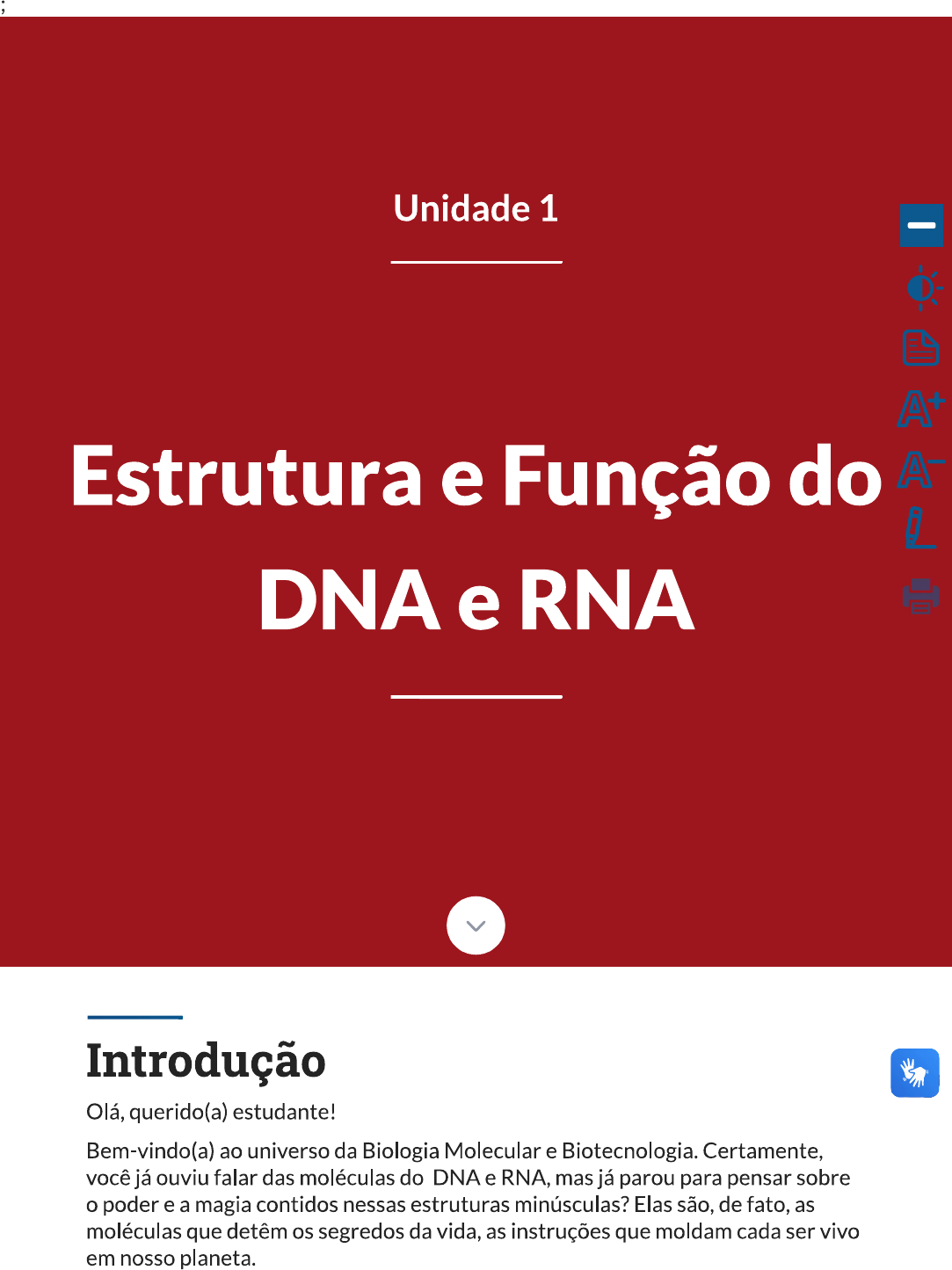 <p>Unidade 1 A+ Estrutura e Função do A DNA e RNA Introdução Olá, querido(a) estudante! Bem-vindo(a) ao universo da Biologia Molecular e Biotecnologia. Certamente, você já ouviu falar das moléculas do DNA e RNA, mas já parou para pensar sobre o poder e a magia contidos nessas estruturas minúsculas? Elas são, de fato, as moléculas que detêm os segredos da vida, as instruções que moldam cada ser vivo em nosso planeta.</p><p>Ao longo do nosso estudo, vamos conhecer a estrutura e função destas moléculas. Juntos, exploraremos as características únicas do DNA e RNA, entendendo como eles se organizam e interagem para desempenhar suas funções vitais. E, à medida que avançamos, você ficará maravilhado(a) com os processos de duplicação, transcrição e tradução, vendo como eles garantem que a informação genética seja corretamente copiada, lida e expressa nas células. E, por fim, a cereja do bolo: a síntese de proteínas. Essas moléculas incríveis são o resultado de toda essa dança molecular, desempenhando funções essenciais que nos permitem viver, crescer e interagir com o mundo ao nosso redor. Está pronto(a) para decifrar os mistérios do código da vida? Garanto que será uma aventura inesquecível! Características da estrutura do A+ DNA e RNA A Caro leitor, convido você a nos aprofundarmos juntos no intrincado e fascinante universo da biologia molecular. Um domínio onde cada molécula, por menor que seja, conta uma história, onde cada sequência codifica um mistério e cada hélice se entrelaça em um ritmo que tem sido a base da existência desde os primórdios da vida. Imagine um balé microscópico, onde os dançarinos são moléculas e seus movimentos são orquestrados pelo código da vida. Neste cenário, o DNA e o RNA emergem como as principais estrelas, dominando o palco com sua complexidade e importância. Enquanto o DNA, com sua icônica dupla hélice, guarda as instruções que dão forma e função a todos os seres vivos, o RNA serve como um intermediário, transmitindo e traduzindo essas instruções para criar a diversidade de proteínas que impulsionam a vida. Juntas, essas moléculas formam uma parceria que tem sido o cerne da biologia por bilhões de anos. Mas por que essas moléculas são tão especiais? E como elas conseguem desempenhar suas funções tão crucialmente? A jornada à qual convido você, buscará responder a essas perguntas, desvendando os mistérios que têm intrigado cientistas por décadas. Ao nos aproximarmos do DNA e RNA, não apenas exploraremos sua estrutura e função, mas também a incrível dança da vida que elas orquestram. O DNA, muitas vezes representado por sua forma distinta de dupla hélice, é mais do que uma simples estrutura; é uma verdadeira obra-prima da natureza. Embora os pesquisadores James Watson e Francis Crick sejam frequentemente creditados pela descoberta dessa forma, é crucial reconhecer que essa descoberta foi o culminar de uma série de descobertas e esforços colaborativos. Uma dessas contribuições valiosas foi a da cientista Rosalind Franklin. Usando técnicas avançadas de difração de raios-X, Franklin capturou imagens do DNA que foram</p><p>fundamentais para a descoberta final da estrutura em hélice dupla. Infelizmente, seu papel muitas vezes é ofuscado na narrativa histórica, mas sua contribuição para a ciência é inegável e imensurável (WATSON et al., 215). Agora, imagine a estrutura do DNA como uma escada em espiral, onde cada degrau representa um par de bases nitrogenadas. Estas bases, adenina, timina, citosina e guanina, são os componentes fundamentais do código genético. Elas não se juntam ao acaso; ao contrário, formam pares específicos adenina com timina e citosina com guanina unidos firmemente por pontes de hidrogênio. Essa especificidade garante a precisão na replicação do DNA, permitindo que as informações genéticas sejam transmitidas de uma geração para a próxima sem erros significativos. replicação do DNA, permitindo que as informações genéticas sejam transmitidas de uma geração para a próxima sem erros significativos. Seguindo pela molécula do DNA. os "corrimãos" da escada espiralada não são menos importantes. Formados por uma sequência repetitiva de açúcar (desoxirribose) e grupos fosfato, eles proporcionam a estrutura e estabilidade ao A+ DNA. Além disso, as ligações fosfodiéster entre os açúcares e fosfatos conferem resistência e integridade à molécula, protegendo o precioso código genético que ela carrega. A No entanto, o DNA e o RNA, colunas vertebrais da genética e da biologia molecular, distinguem-se em vários níveis. A diferença mais fundamental, e talvez menos apreciada, reside nos açúcares que compõem suas estruturas. "O açúcar do DNA é a desoxirribose, enquanto o RNA contém ribose, idêntica à desoxirribose exceto pela presença de um grupo OH (hidroxila) extra no carbono (WATSON et al., 2015,p. 33). Esse pequeno detalhe estrutural proporciona ao DNA uma resistência química significativa, tornando-o menos reativo e, portanto, mais apto a armazenar informações genéticas por longos períodos sem degradar. Esta estabilidade da molécula é crucial para sua principal função: o reservatório duradouro das instruções genéticas. Em um ambiente celular dinâmico e muitas vezes hostil, a necessidade de uma molécula robusta e resistente para proteger a informação genética não pode ser subestimada. Por outro lado, o RNA, com sua ribose contendo o átomo de oxigênio adicional no carbono 2', é intrinsecamente mais reativo e, consequentemente, menos estável do que o DNA. Mas a natureza, em sua sabedoria evolutiva, utilizou essa instabilidade em vantagem. Ao invés de longo prazo, o RNA é usado para tarefas de curto prazo, muitas vezes sendo produzido e degradado em questão de minutos a horas nas células 2008). A fragilidade do RNA não é um acidente, mas sim uma característica evo